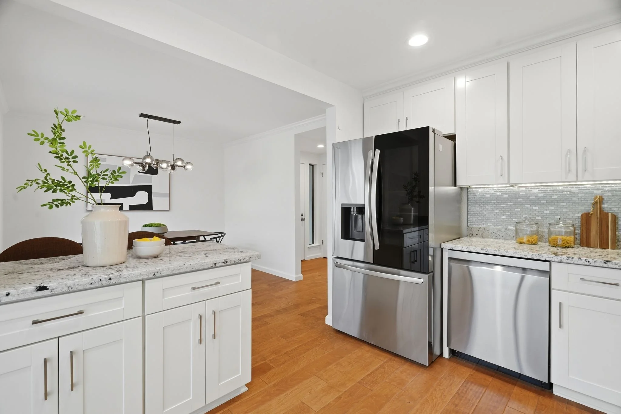 The open kitchen boasts granite countertops and premium stainless steel appliances