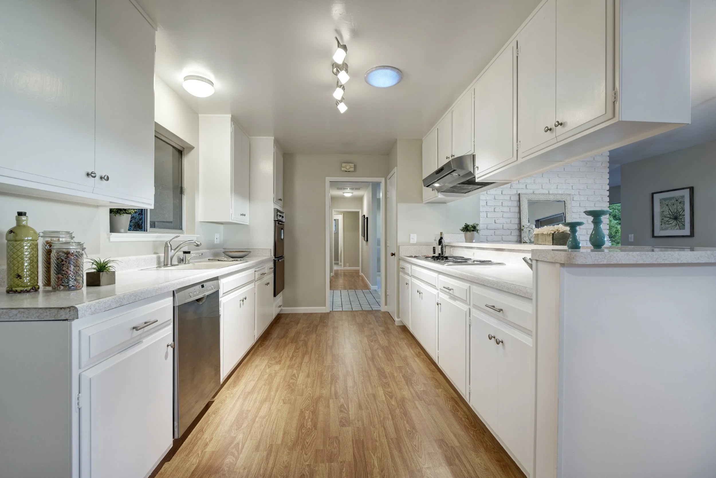 - New wood grain flooring and cabinet hardware highlight an updated kitchen, which also features breakfast bar, skylight, and cooktop range with hood.