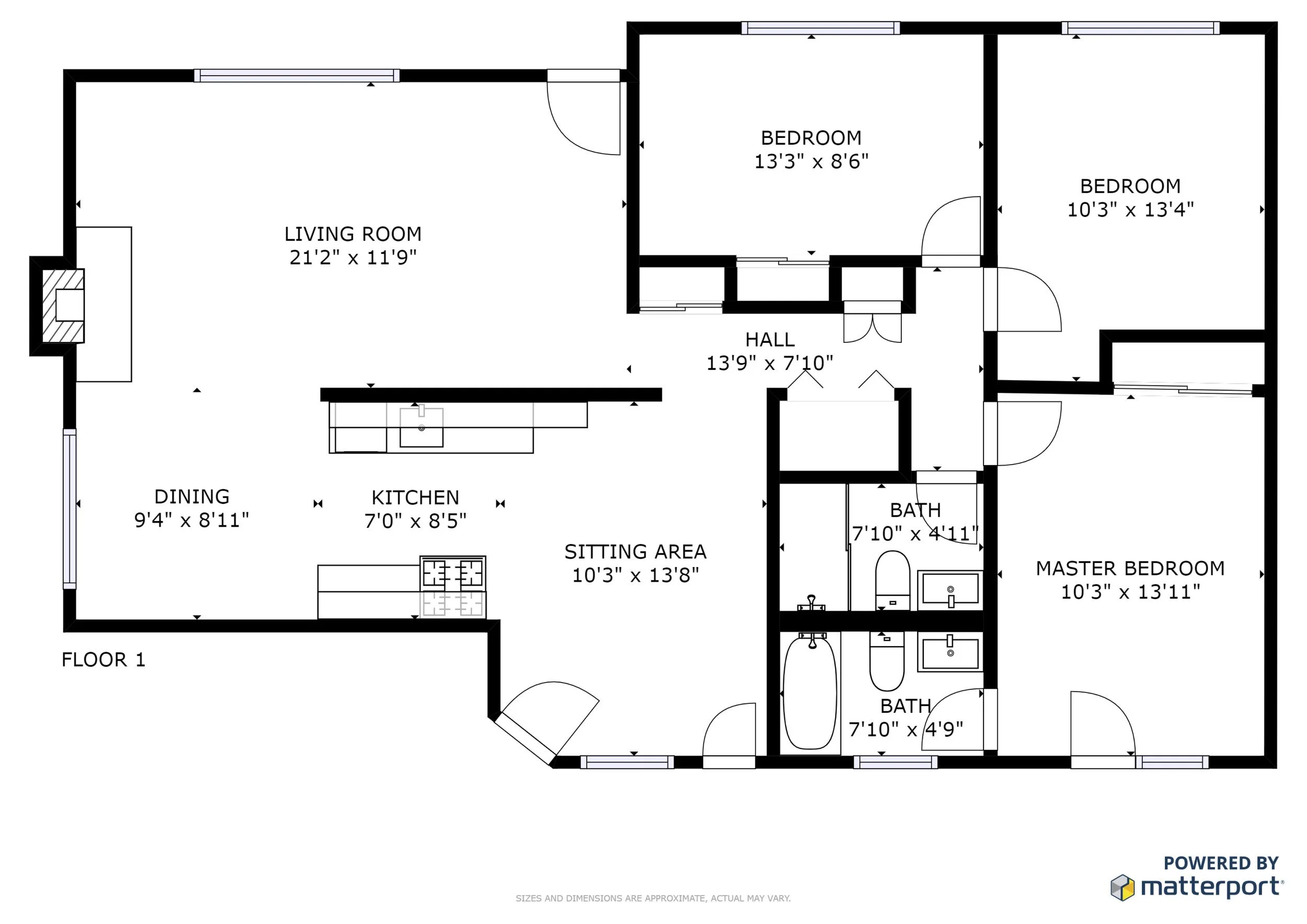 The front downstairs bedrooms share a remodeled hallway bath with skylight, plus a master bathroom suite with remodeled bathroom and patio access.