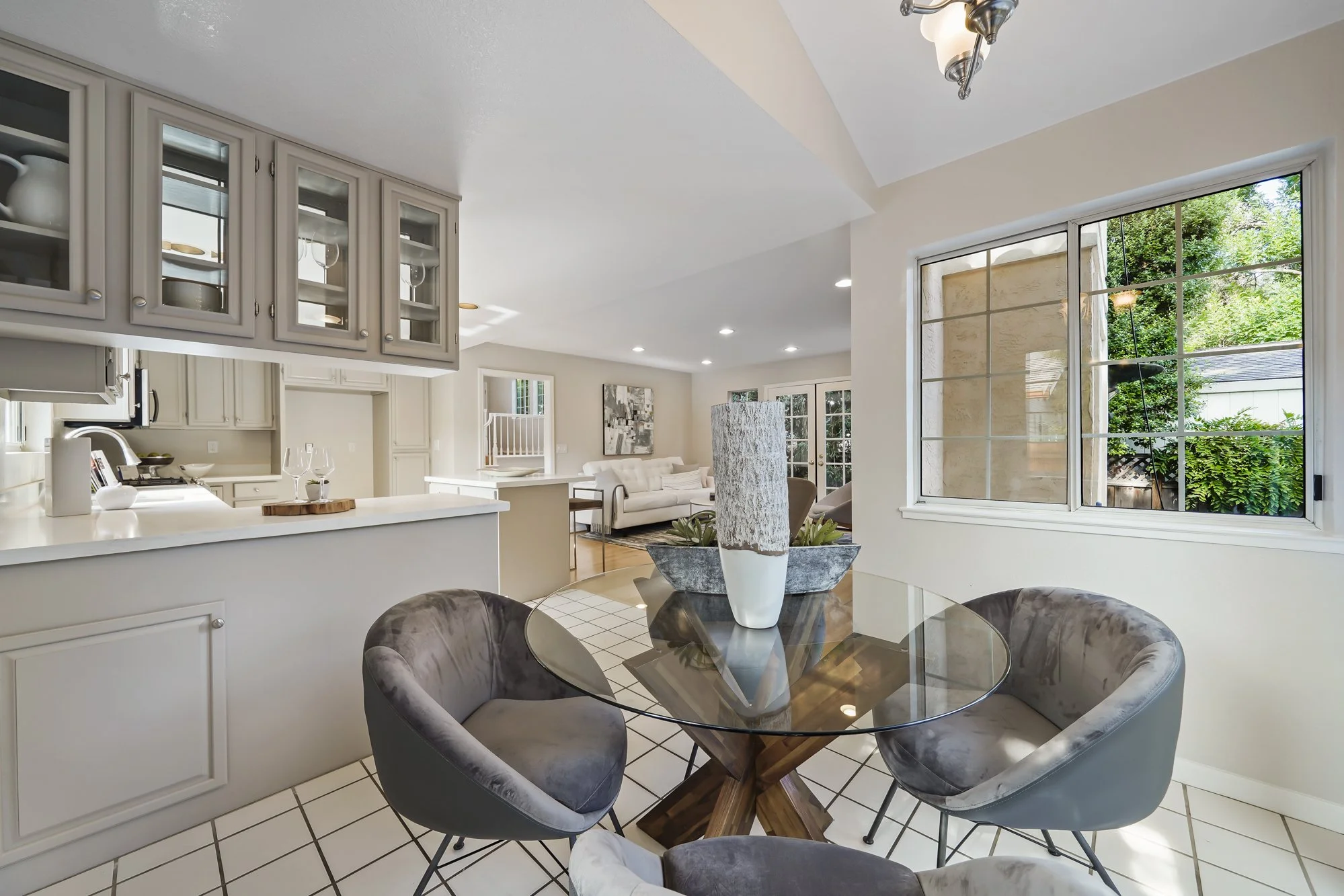 Illuminated by transom windows and skylights, the living and dining areas are open and inviting, while the kitchen shares a free-flowing layout with the breakfast and family rooms