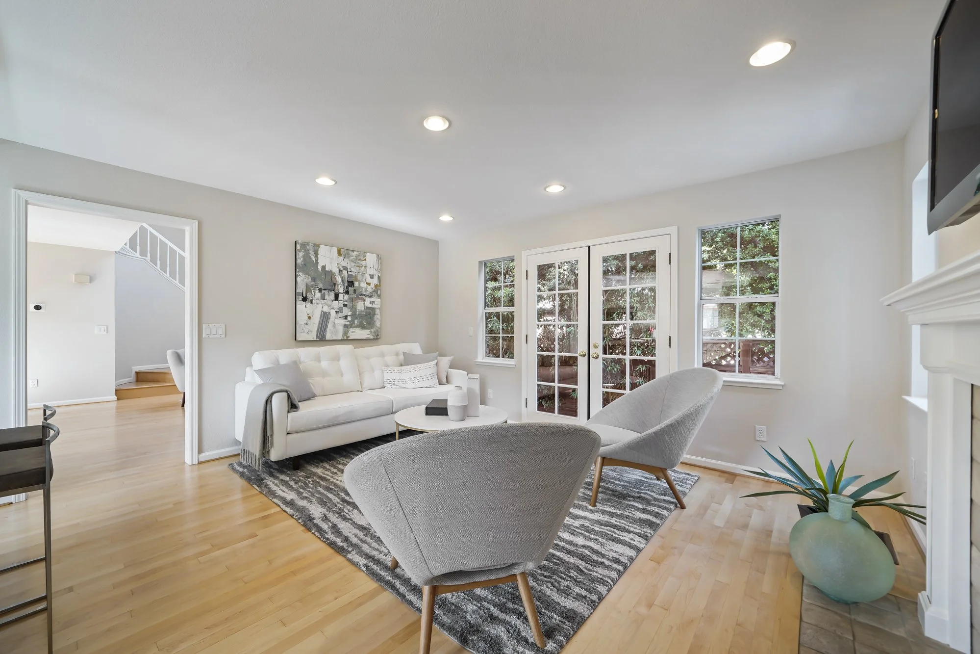 The family room enjoys a fireplace and wiring for a wall-mounted TV, and French doors connect to a newly landscaped backyard offering a sizable patio and mature trees for shade and privacy