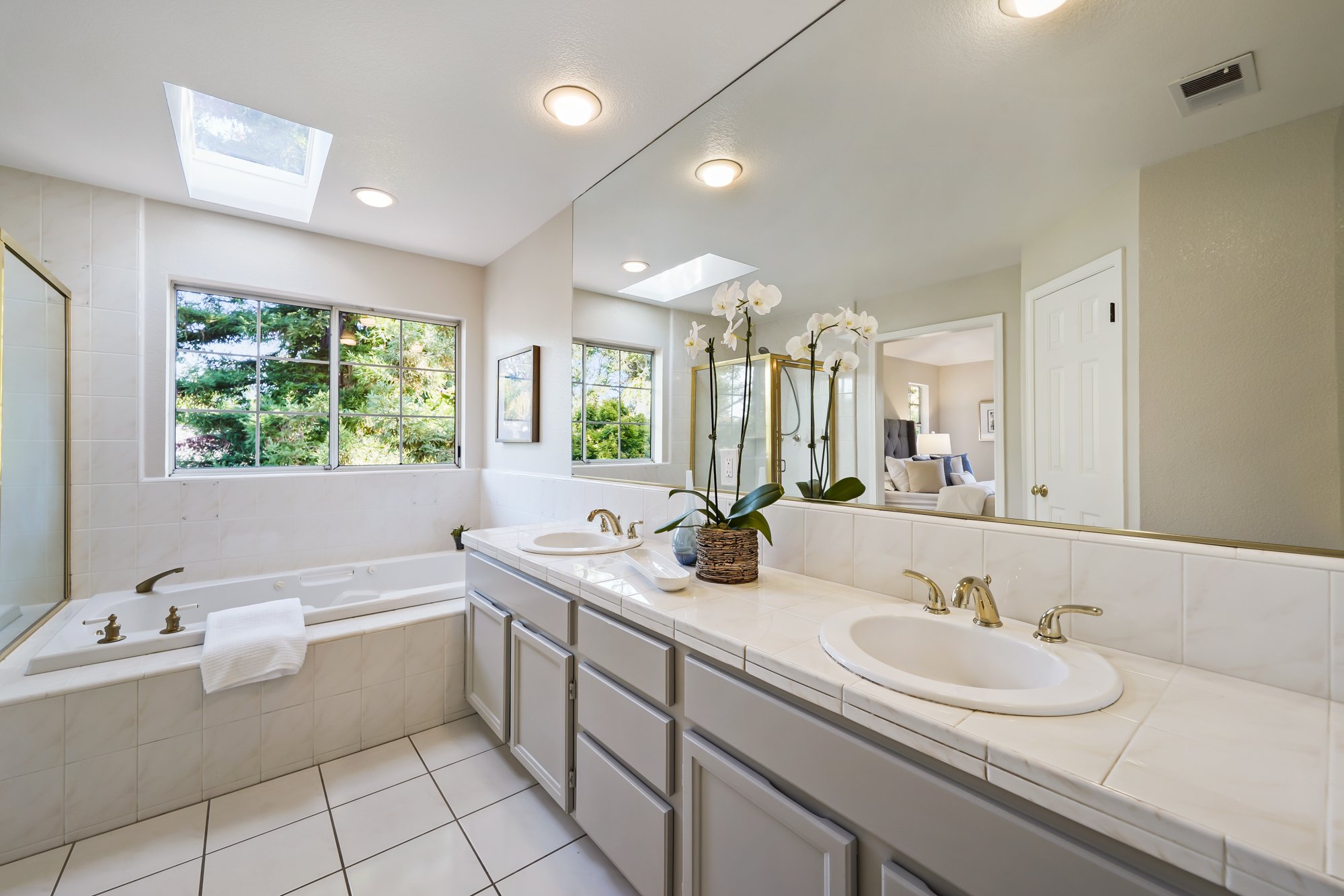 Spacious and peaceful, the master suite features an immense walk-in closet, and sky-lit bathroom with dual vanities, oversized jetted tub, and separate shower