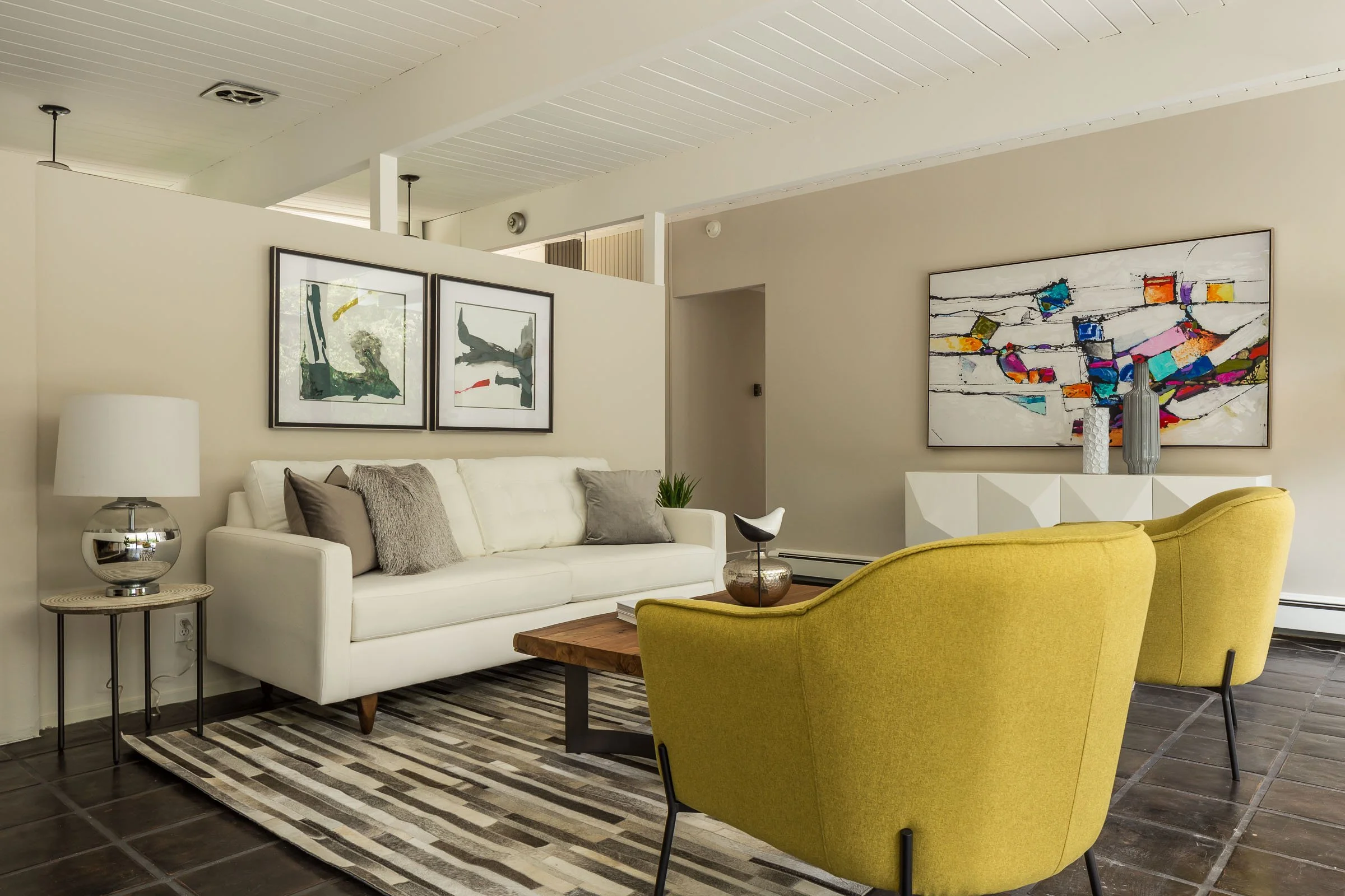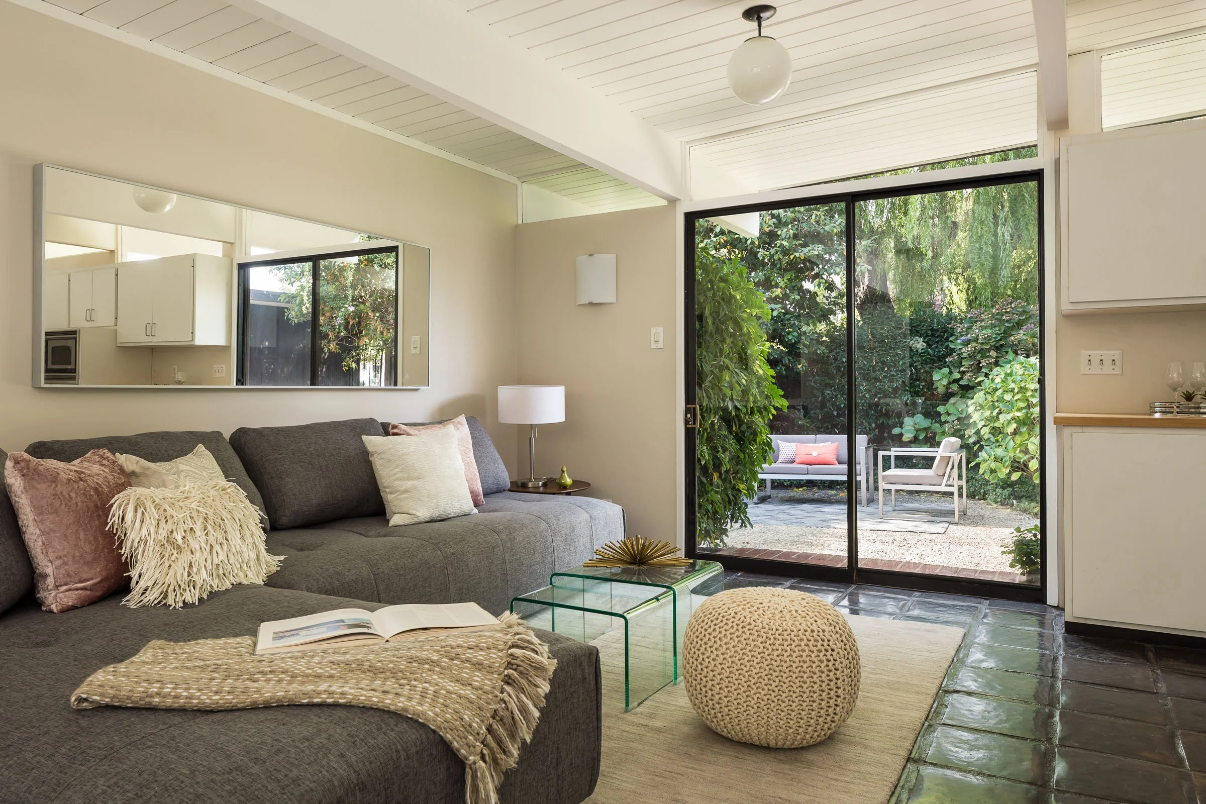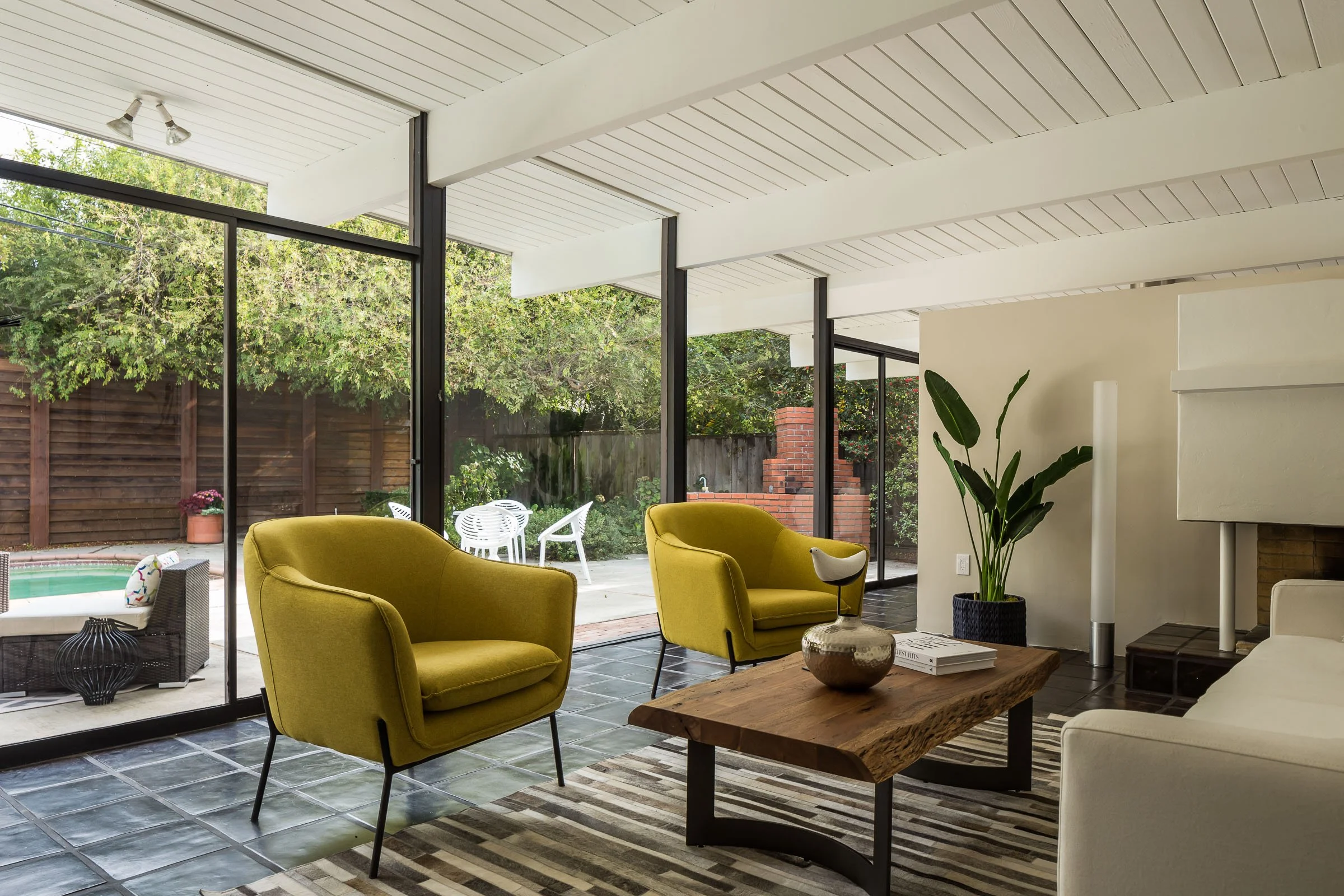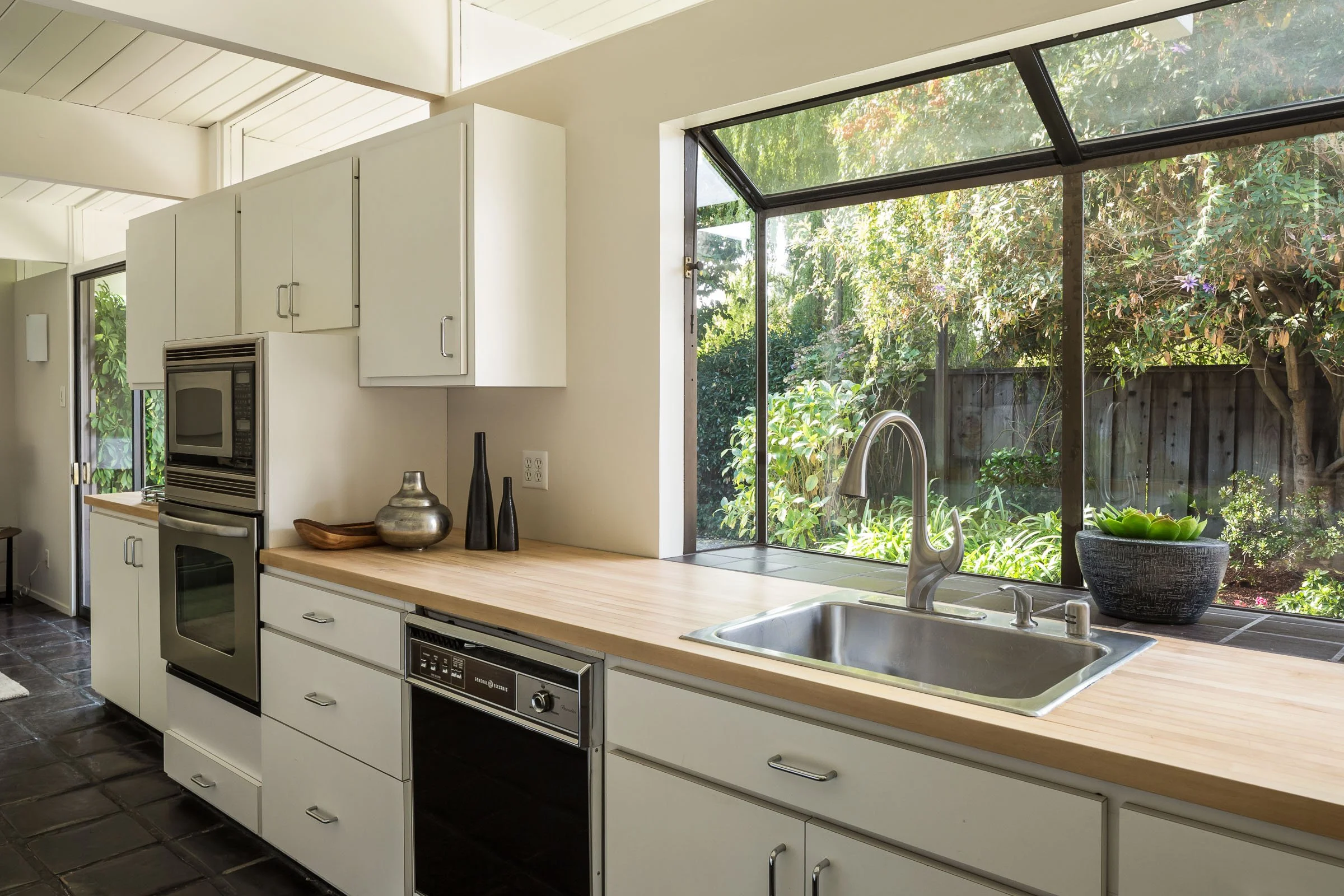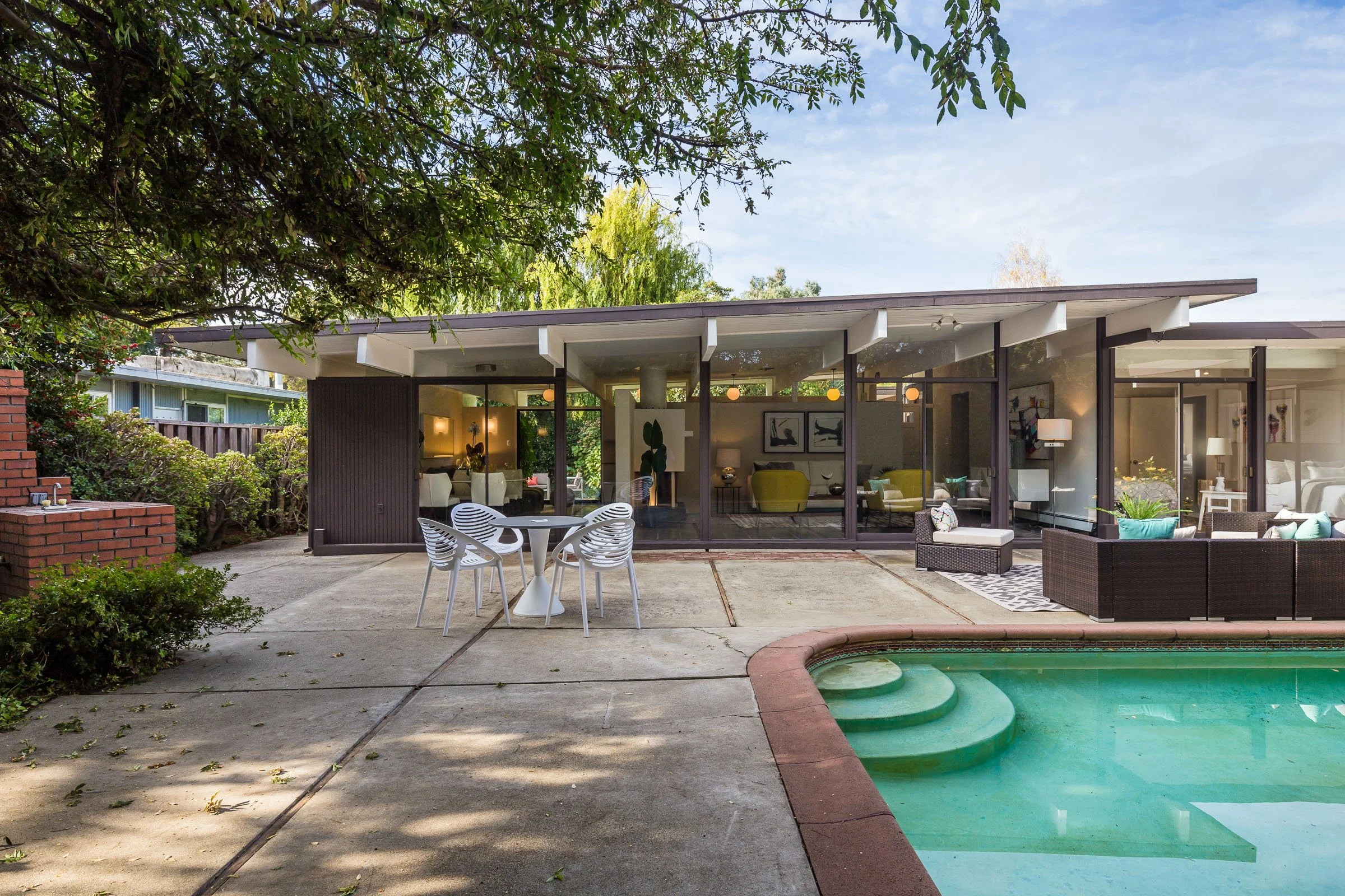 • Infused with Mid-Century Modern character and surrounded by rich foliage, this 4bd/2ba Eichler home of 1,614 sqft is positioned on a lot of 7,476 sqft in the highly desired Green Gables neighborhood