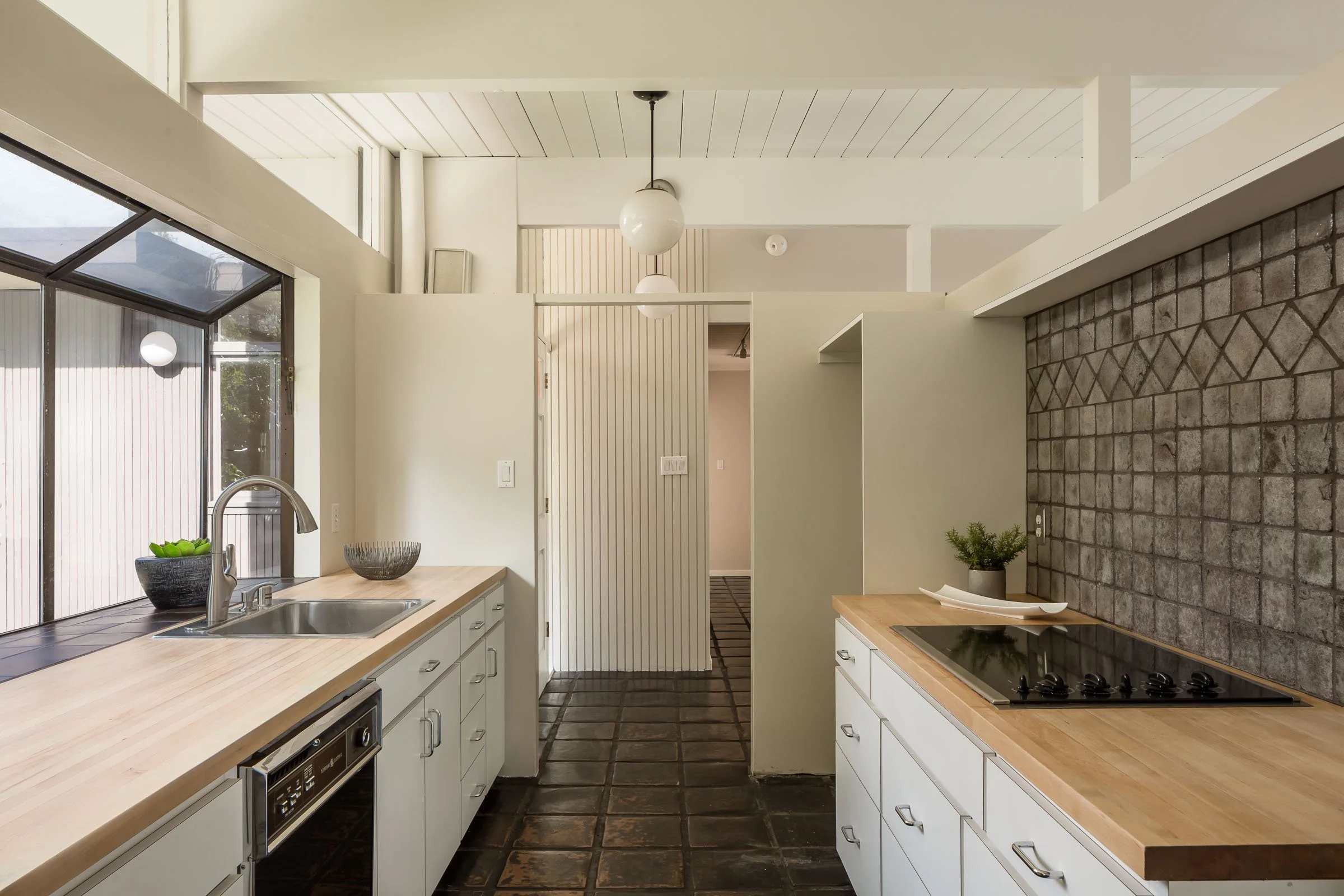 • The sun-lit kitchen enjoys lots of cabinet storage, a striking backsplash above the cooktop, and butcher-block countertops