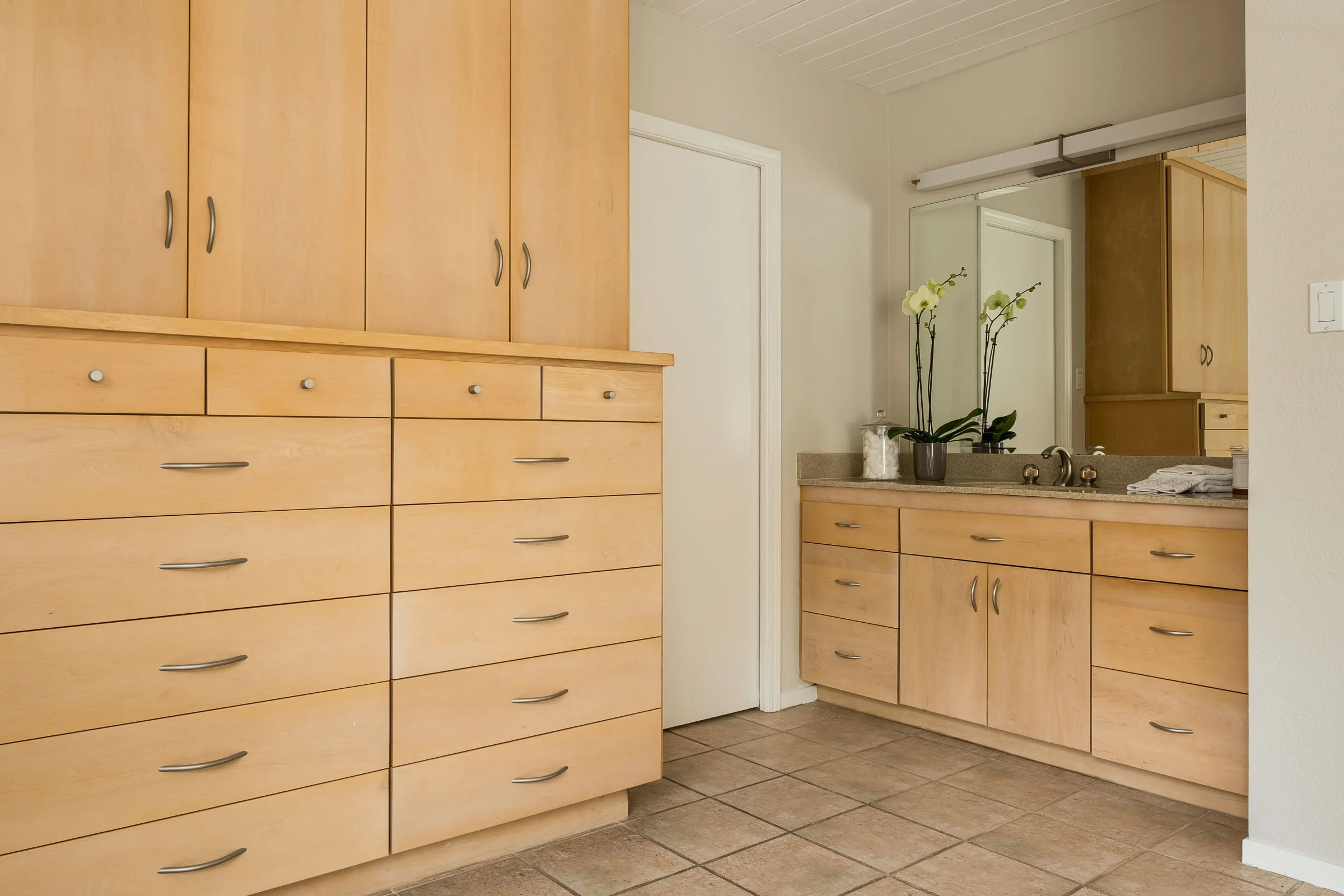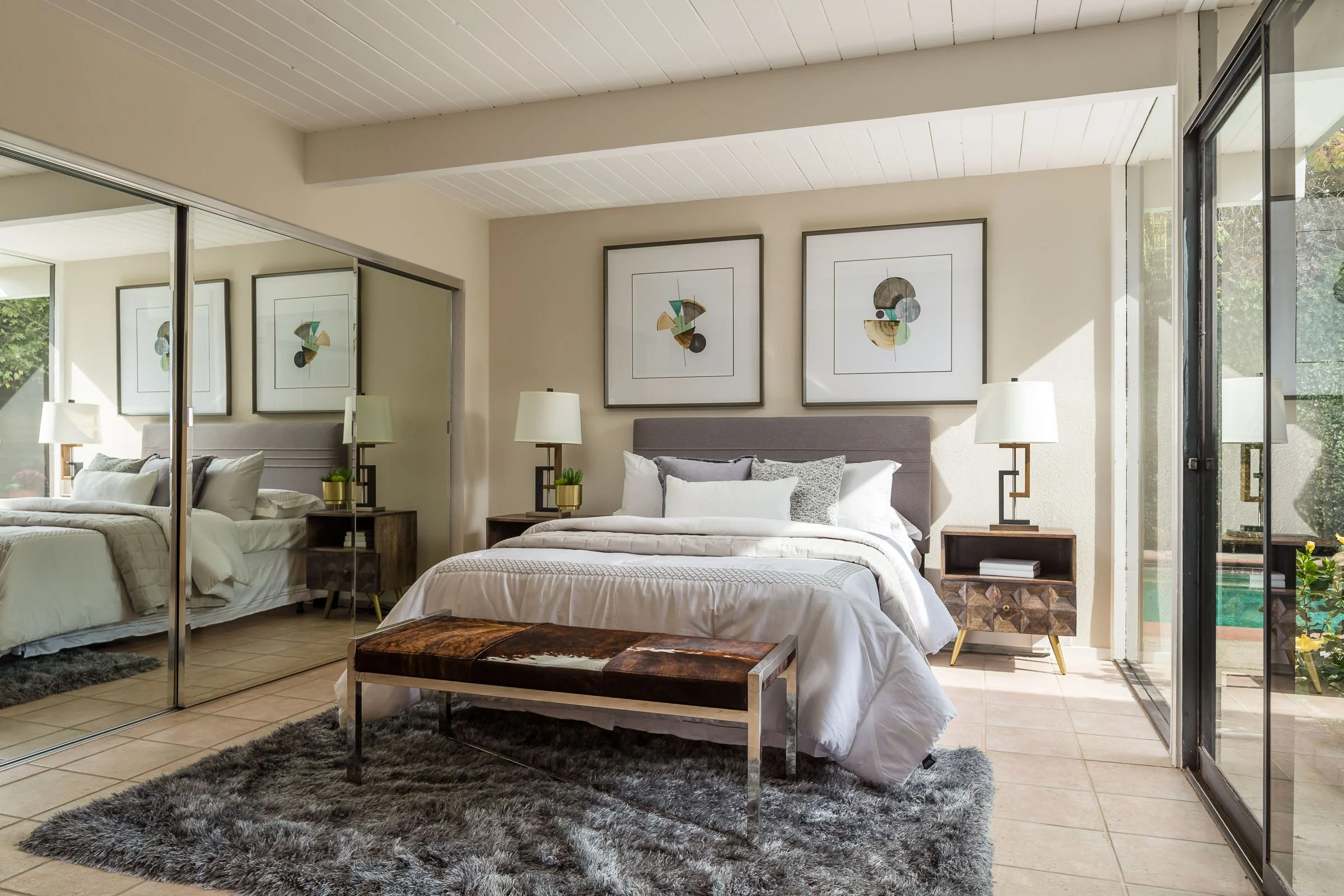 • A central hallway links a full bath fitted with a stainless vanity, vessel sink, and 4 sizable bedrooms, including a relaxing master suite with pool access, a private bathroom, and extensive storage