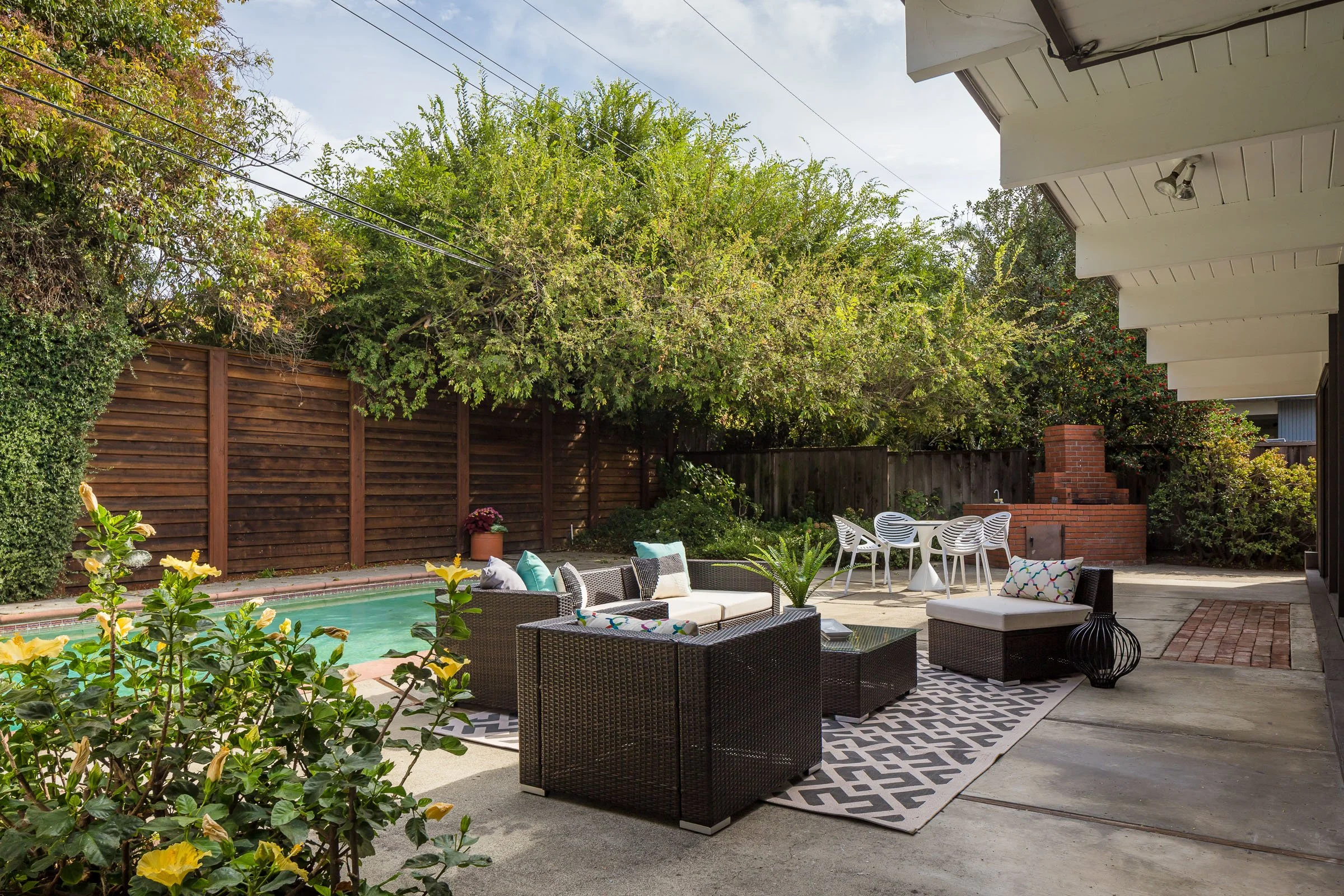 • The gated entry garden is private and shaded, perfect for outdoor relaxation, while the backyard is lined with greenery, boasting a swimming pool and expansive entertaining terrace