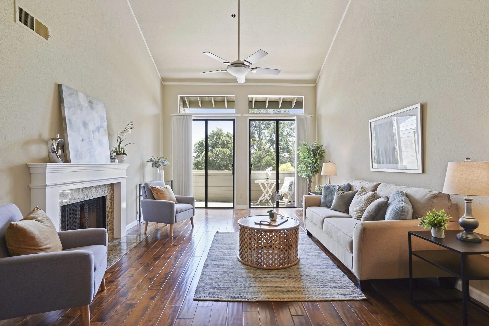 The dining area flows into a light-filled living room with features like a granite-faced fireplace, transom windows, a remote ceiling fan, and vaulted ceilings that boast skylights with custom sunshades