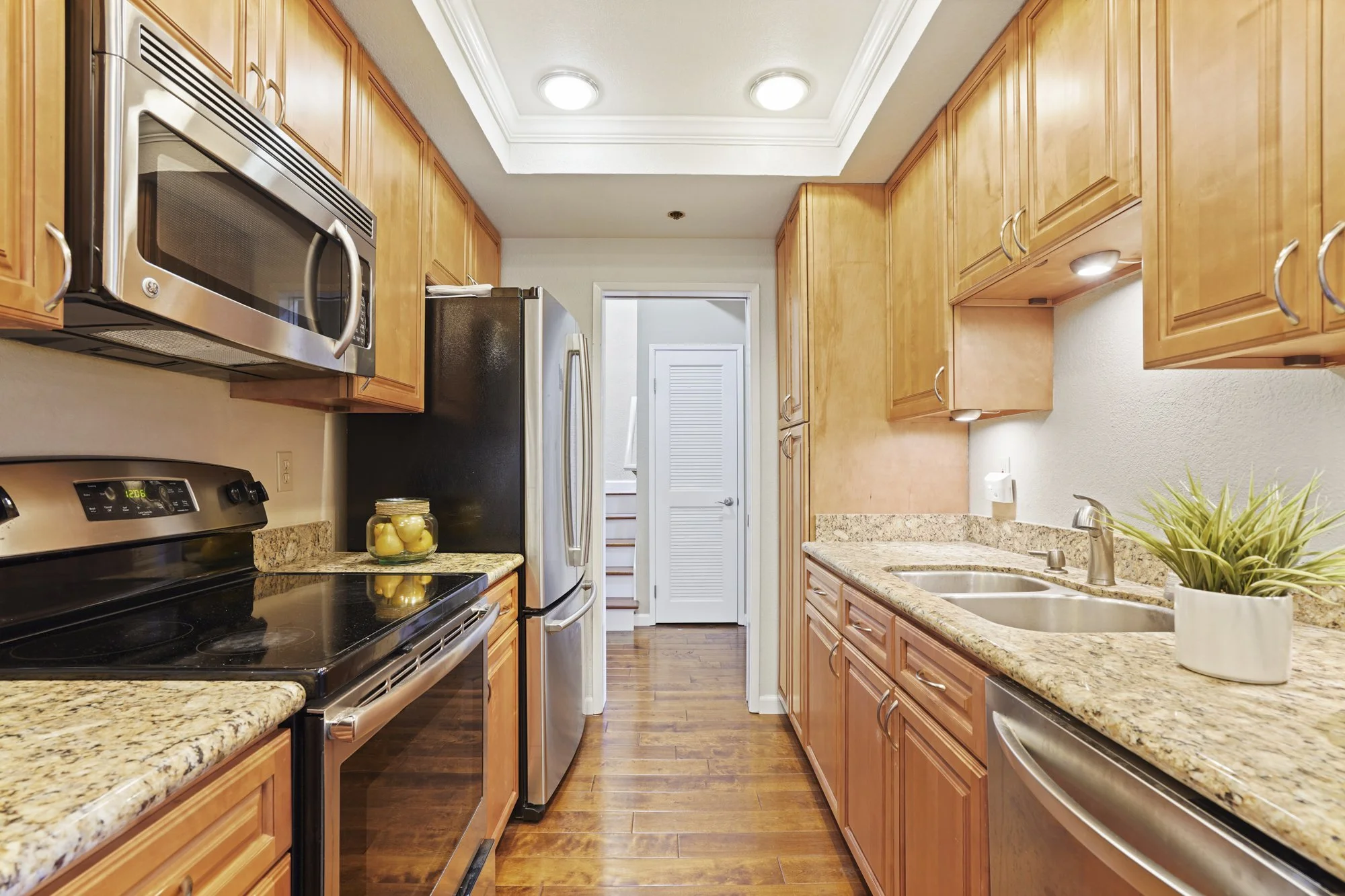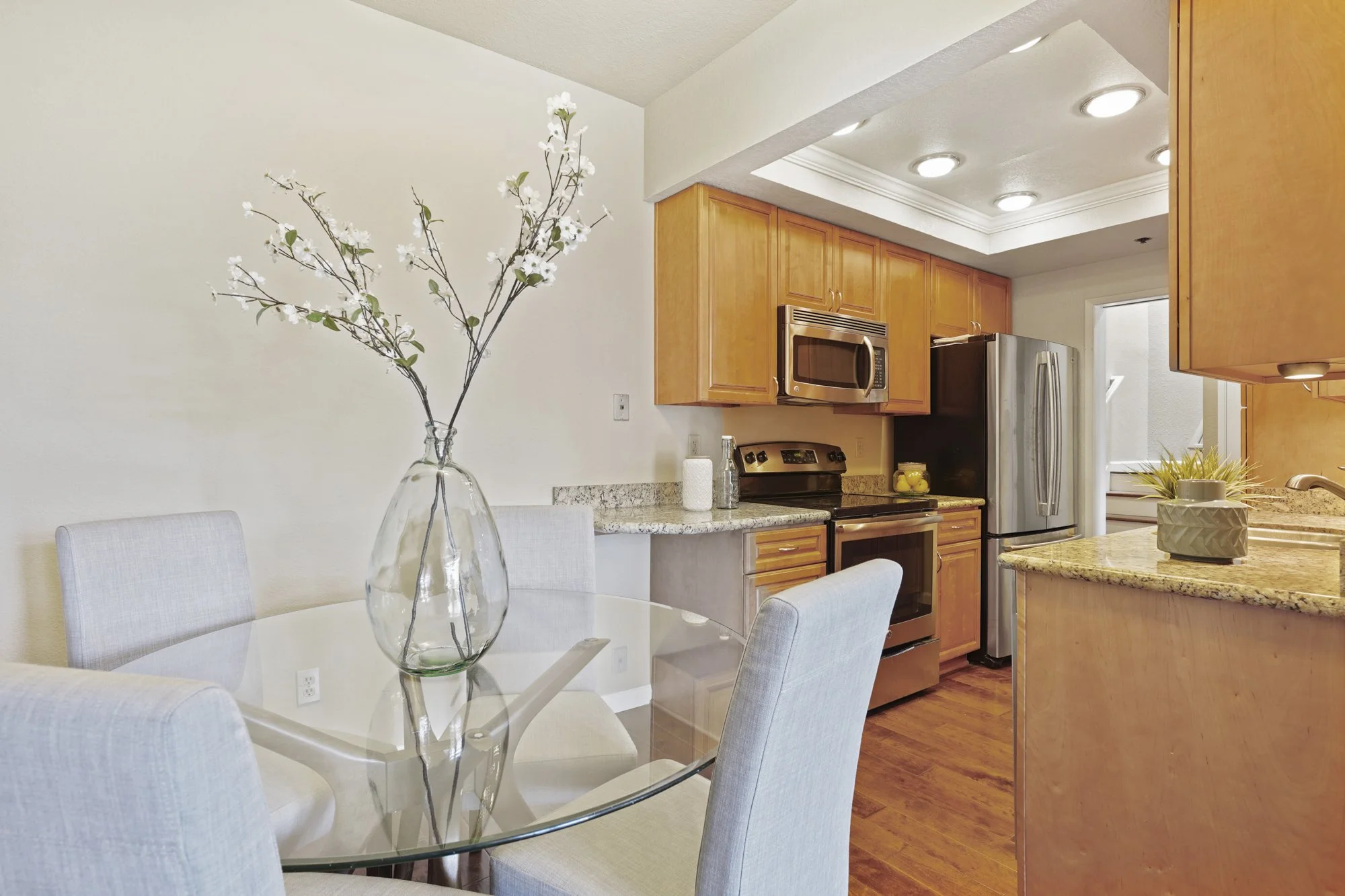 Granite countertops, trey ceiling treatments, and under-cabinet task lighting lend distinction to the beautiful kitchen, where stainless appliances include a double-door LG refrigerator with a freezer drawer