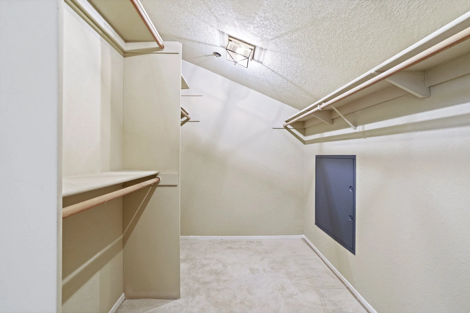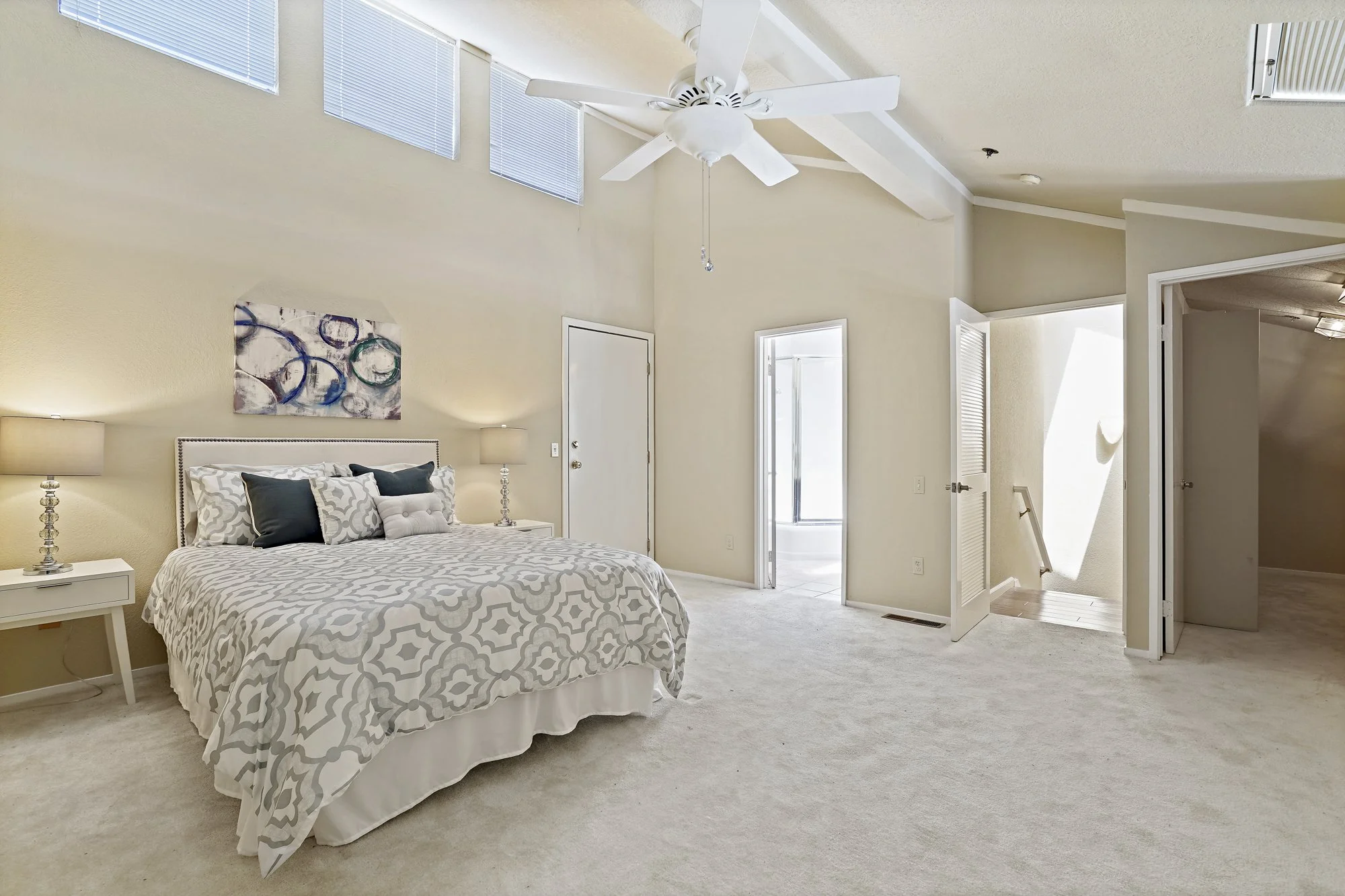 The condo’s bi-level design showcases soaring ceilings, a private balcony, a storage room, in-unit laundry, and privately arranged bedrooms