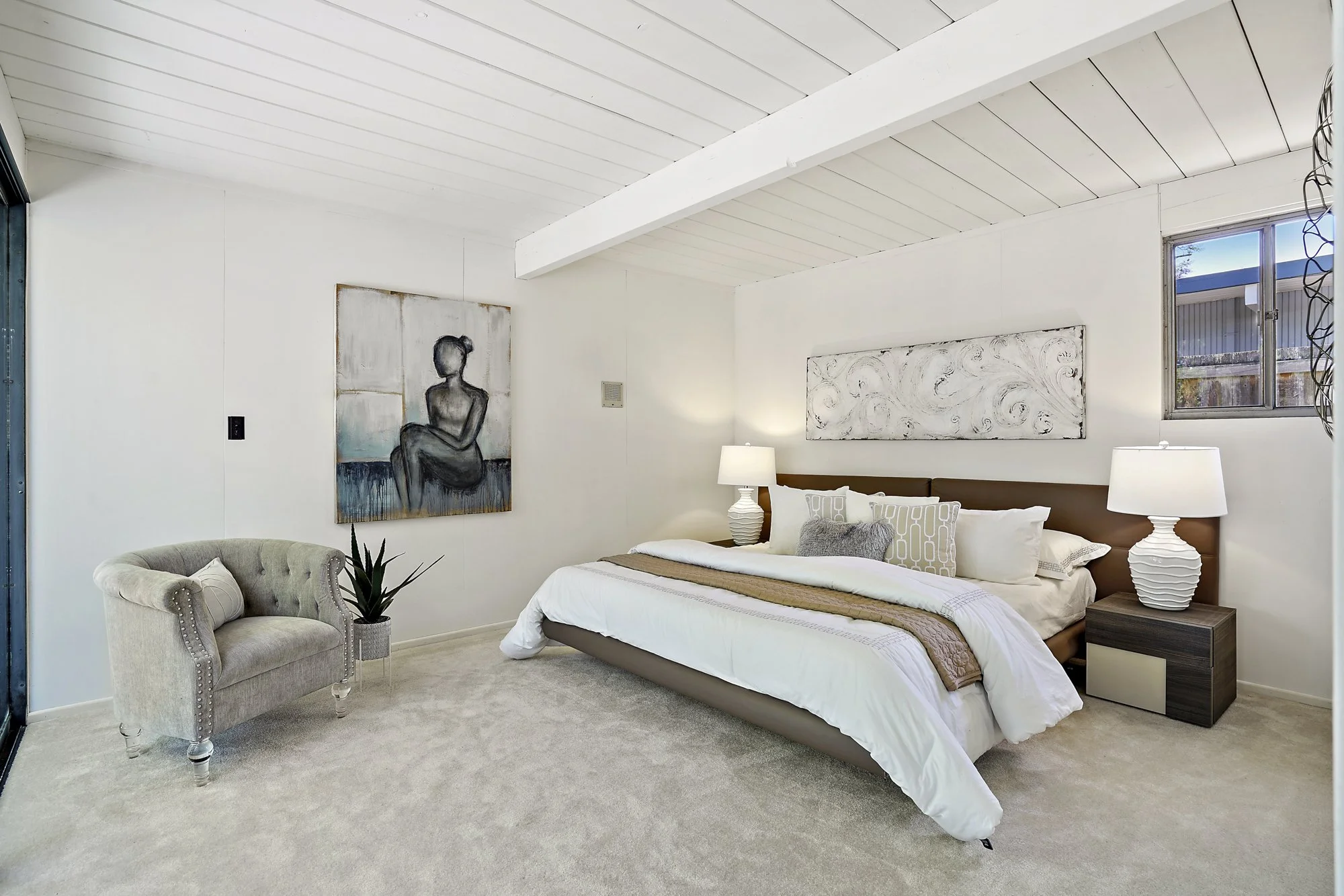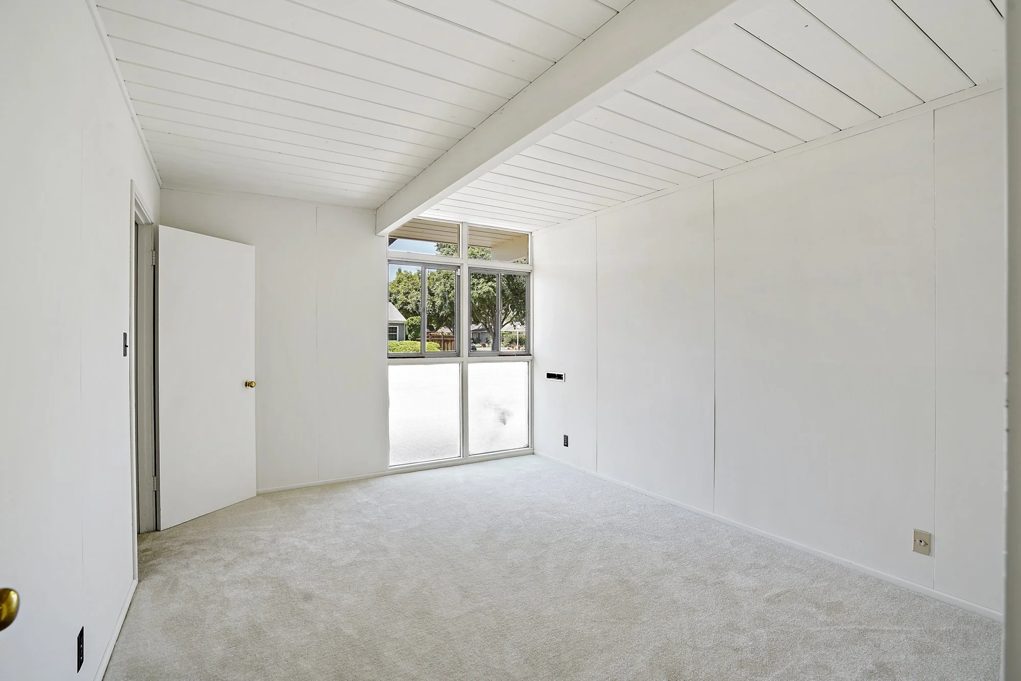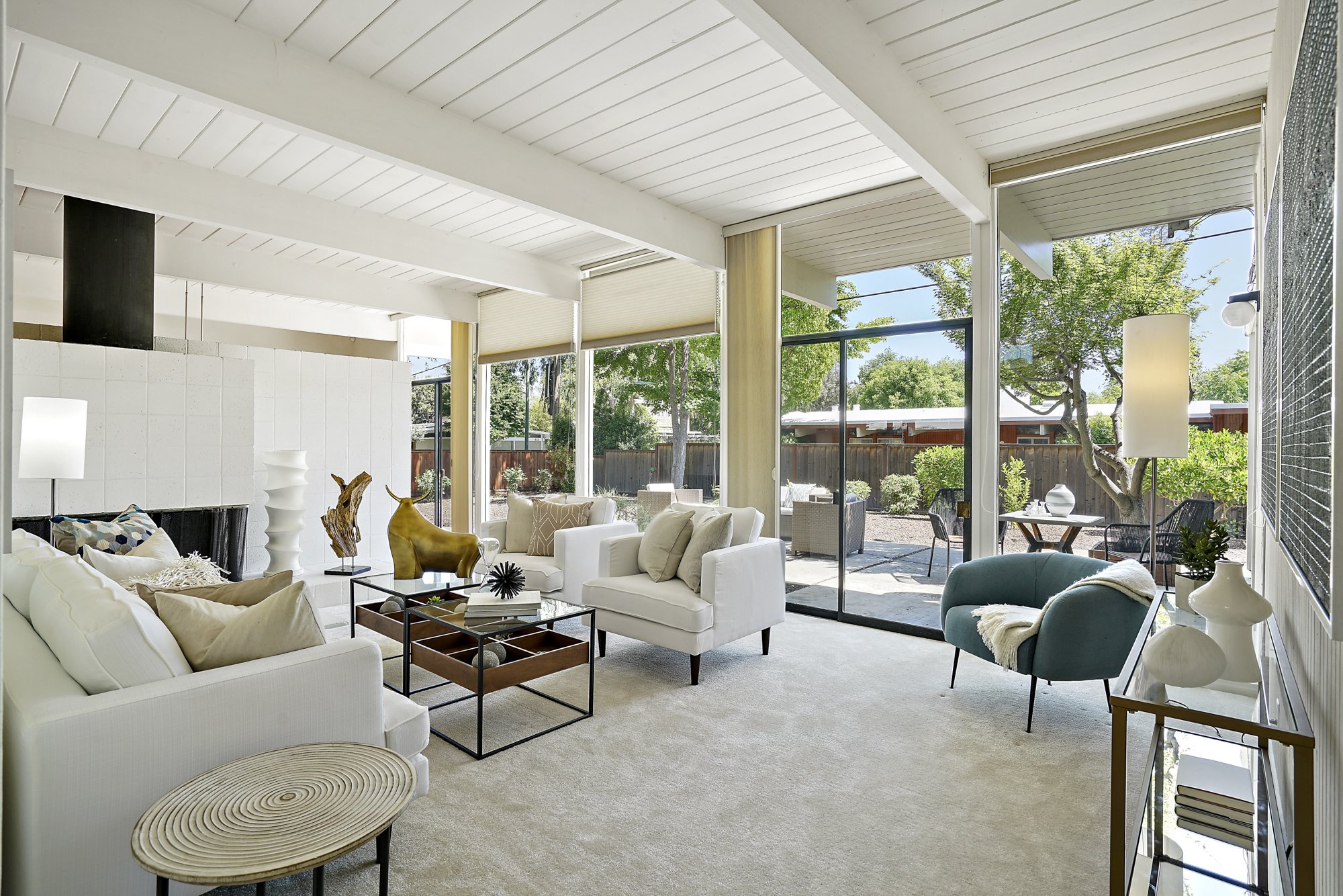 Iconic Eichler highlights include floor-to-ceiling windows, beamed ceilings, and globe lighting