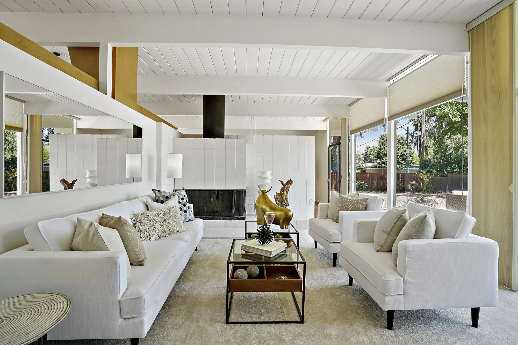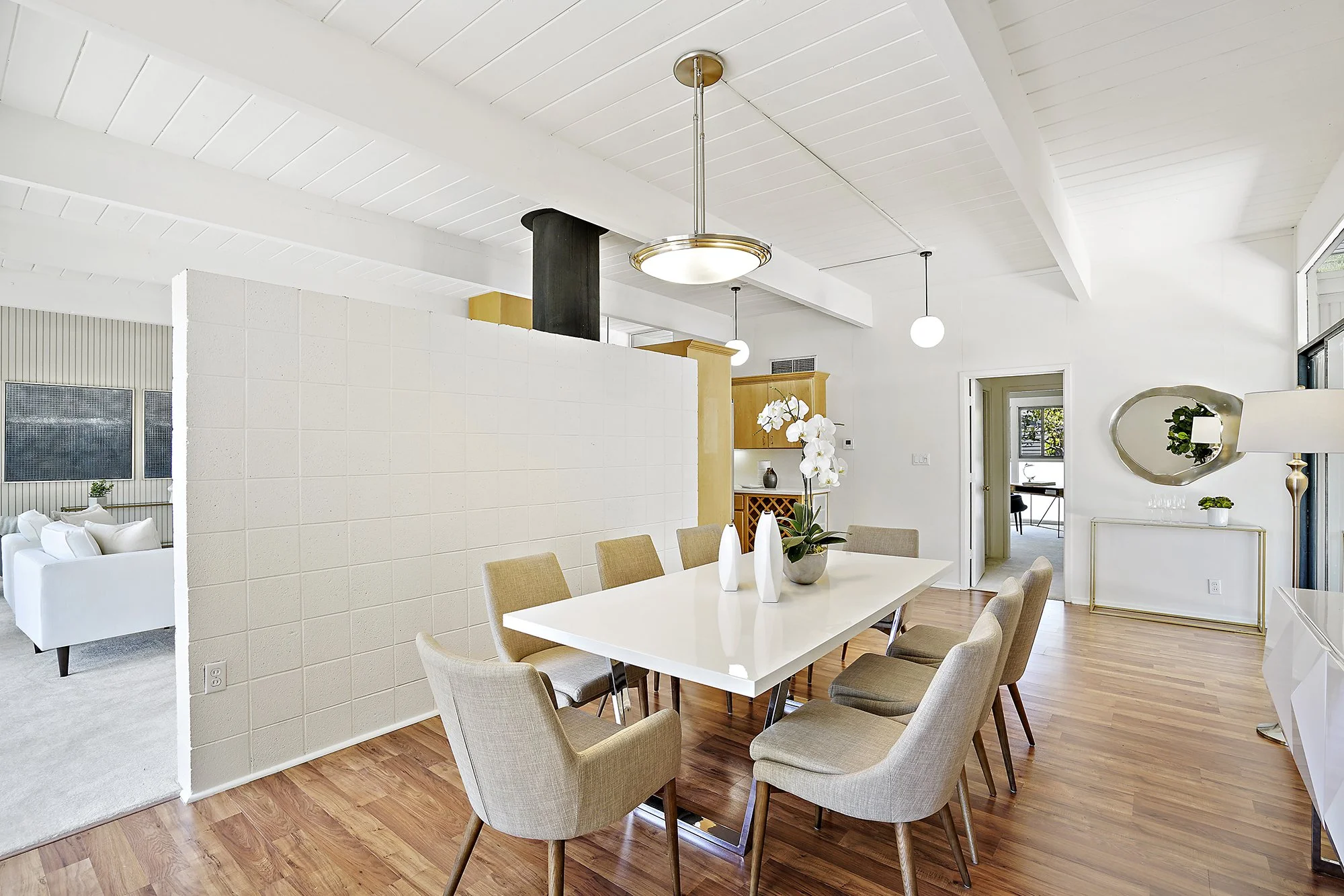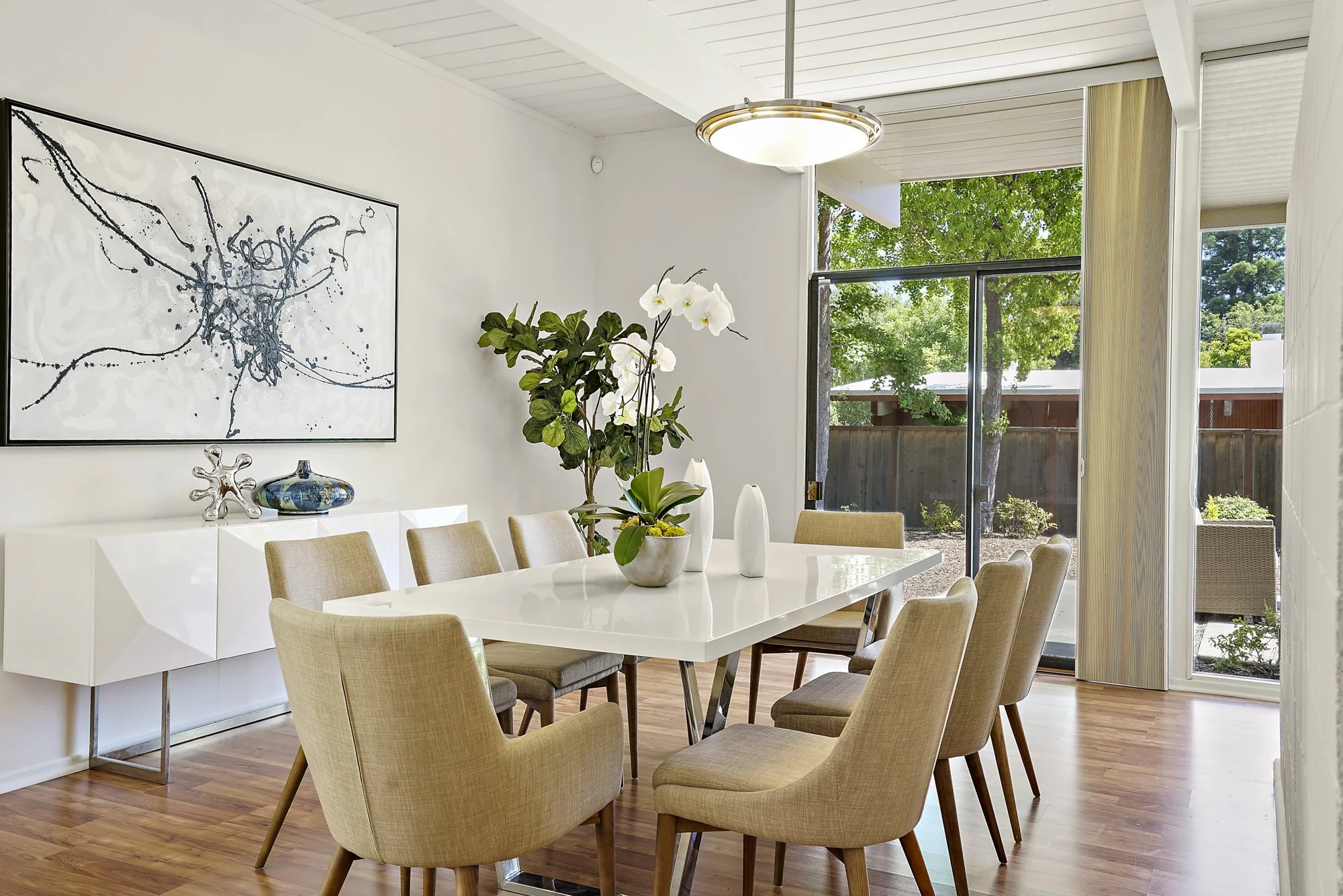 The living and dining areas feature beautifully lit windows looking out to the backyard, complementing the indoor/outdoor lifestyle popularized during the Mid-century modern era