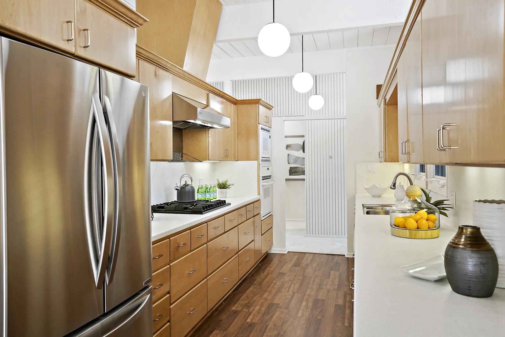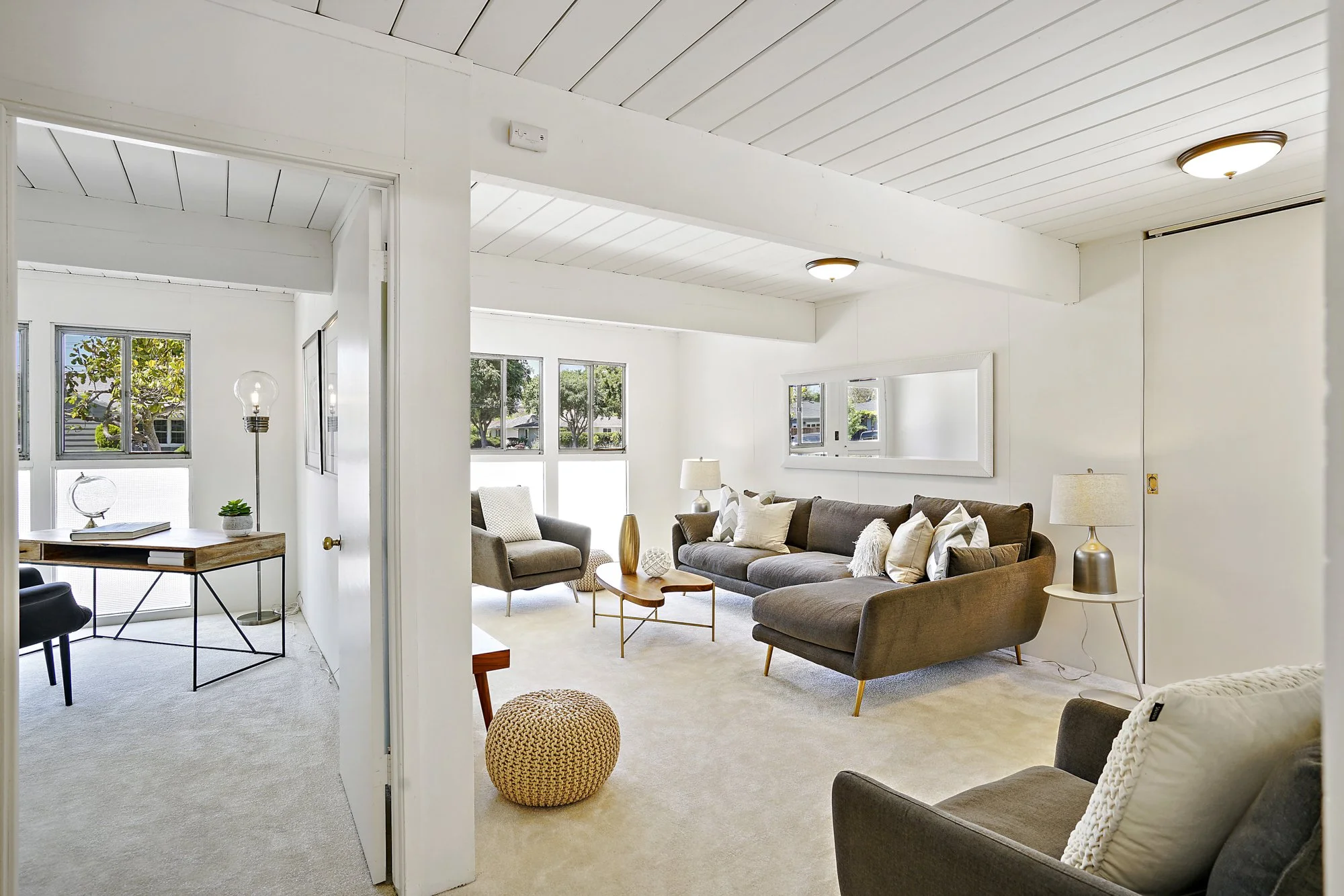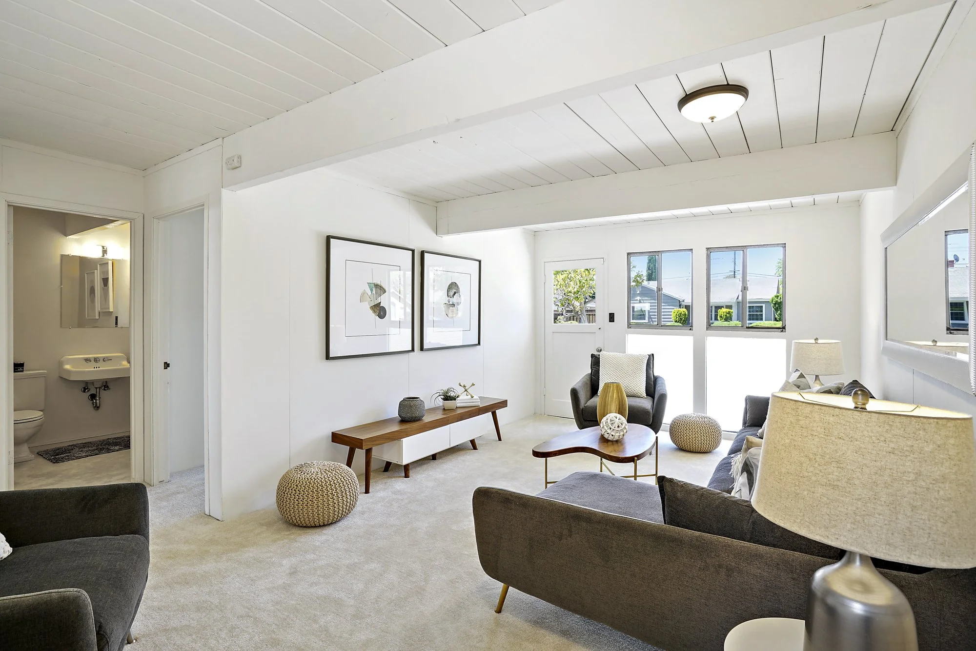 The living and dining areas feature beautifully lit windows looking out to the backyard, complementing the indoor/outdoor lifestyle popularized during the Mid-century modern era