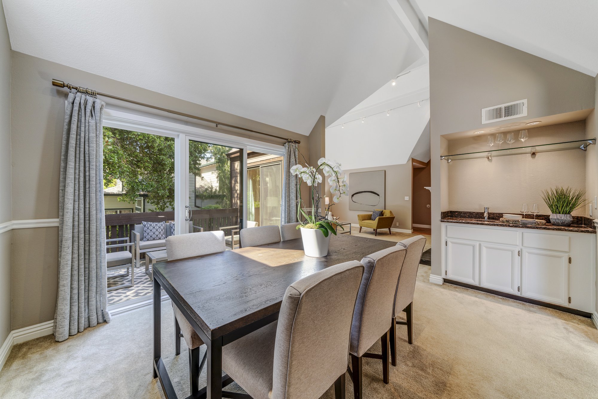 A formal dining area enjoys a wet bar and balcony access, perfect for entertaining summer indoor/outdoor dinners.
