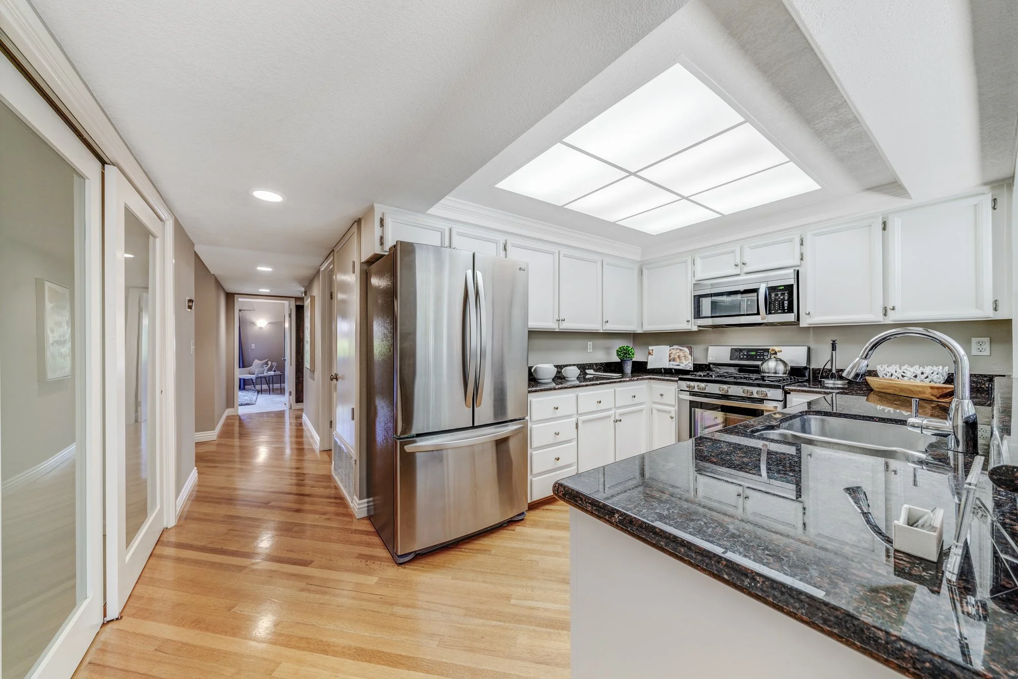 A second balcony adjoins the informal family room and well-appointed kitchen, finished with granite counters, bar pass-through, wine fridge, and stainless steel appliances.