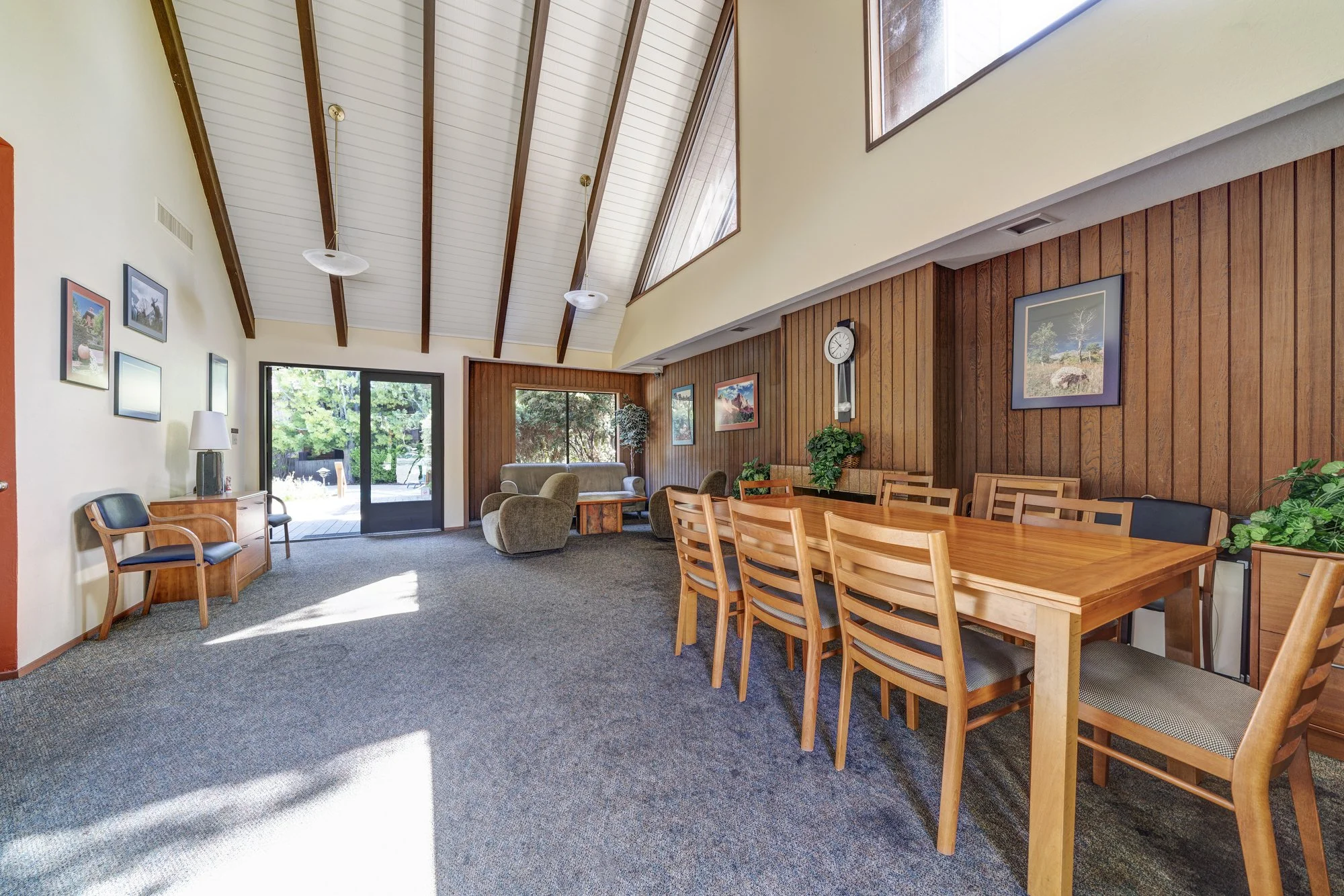 Inside, the living room cathedral ceiling and large balcony bring in the natural scenery and abundant sunlight.