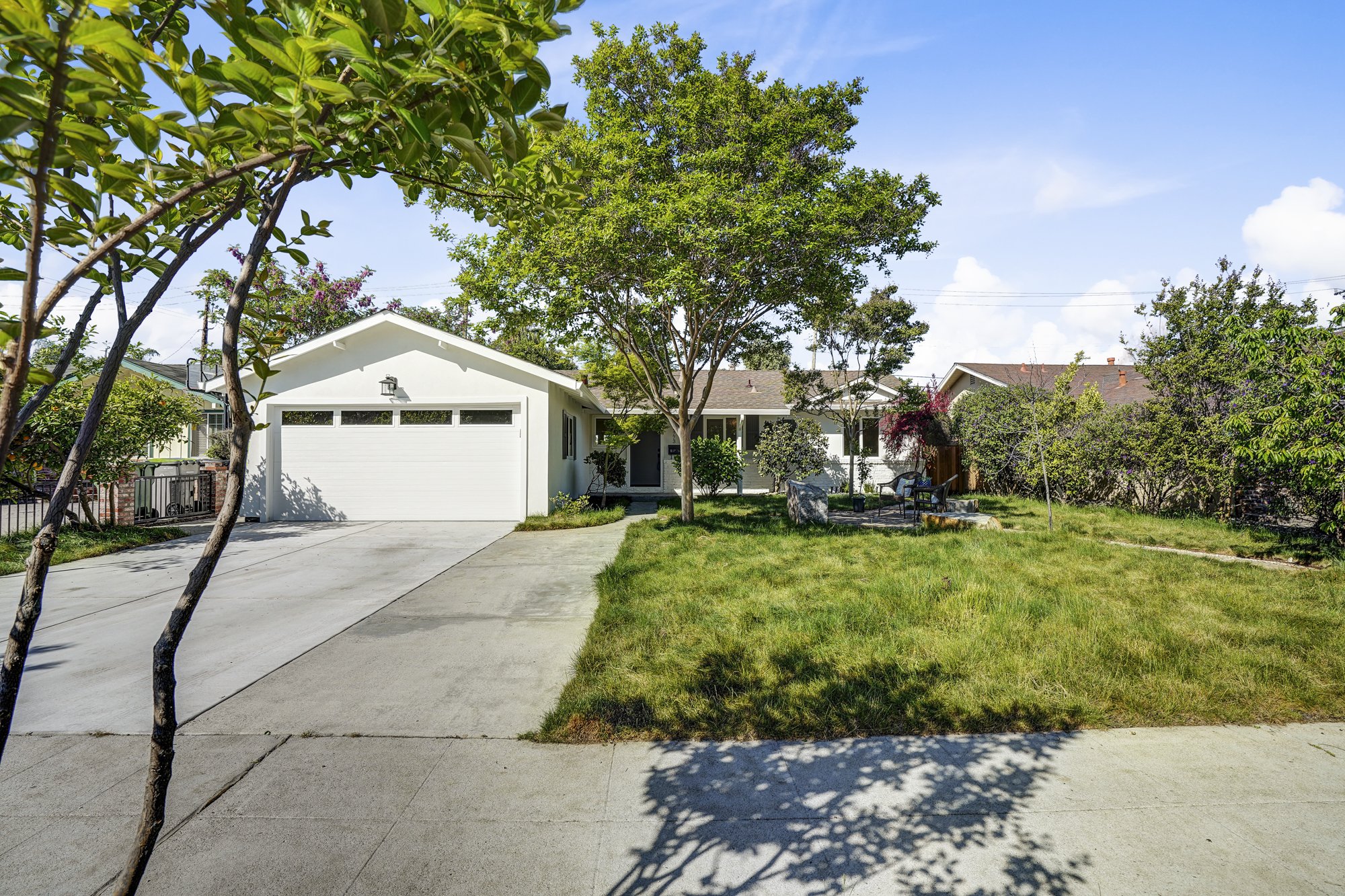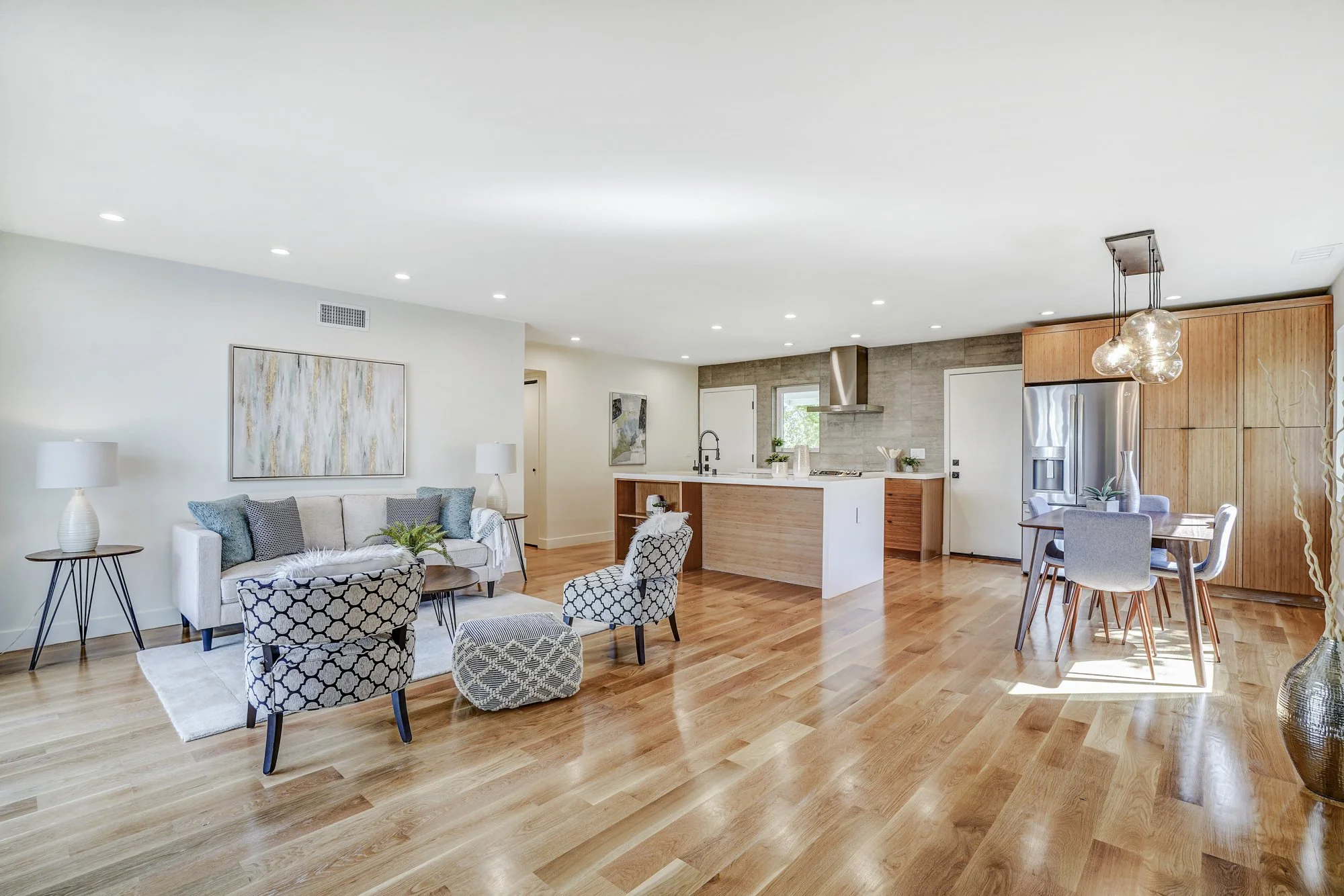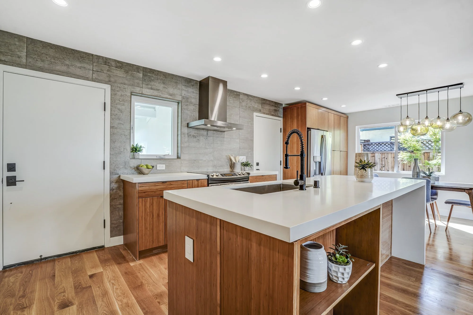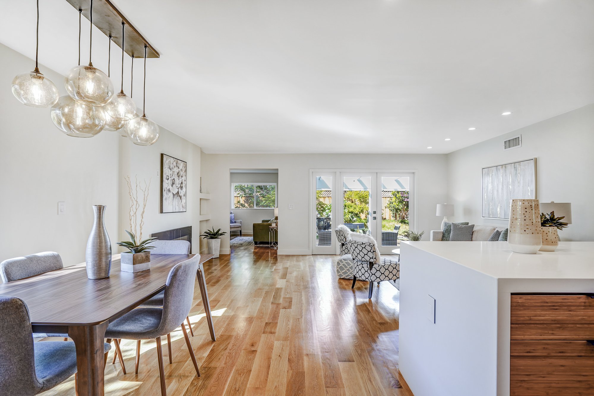 This recently remodeled 4-bedroom home boasts stylish finishes, open-concept living spaces, and a tranquil backyard retreat. Stepping inside, a sleek modern kitchen features a waterfall center island, quartz countertops, and custom bamboo cabinetry. The open dining and living room allows for flexible day-to-day living, while also transforming into a fabulous indoor/outdoor entertaining space with huge glass French doors that open out to the shaded backyard patio.