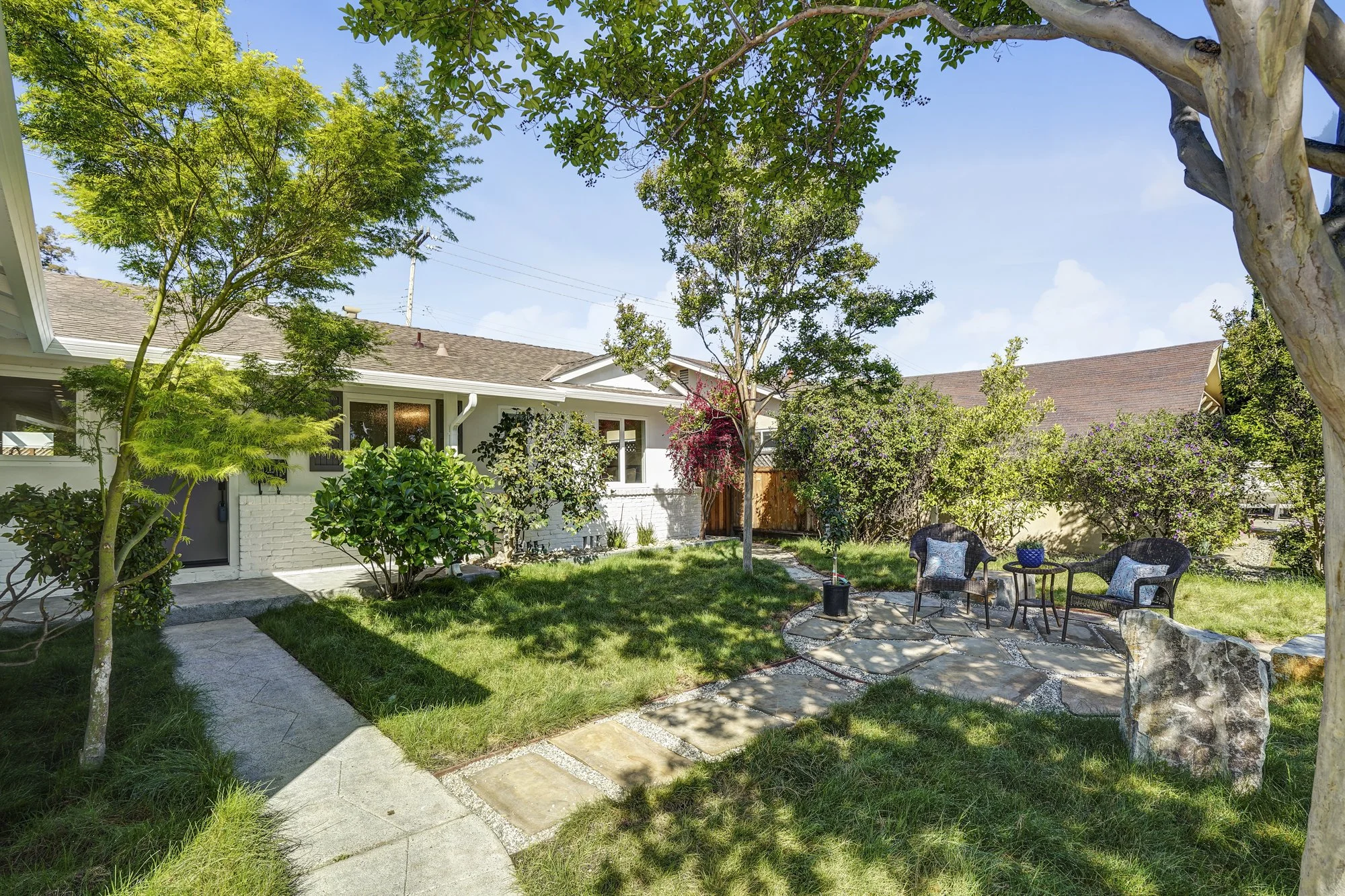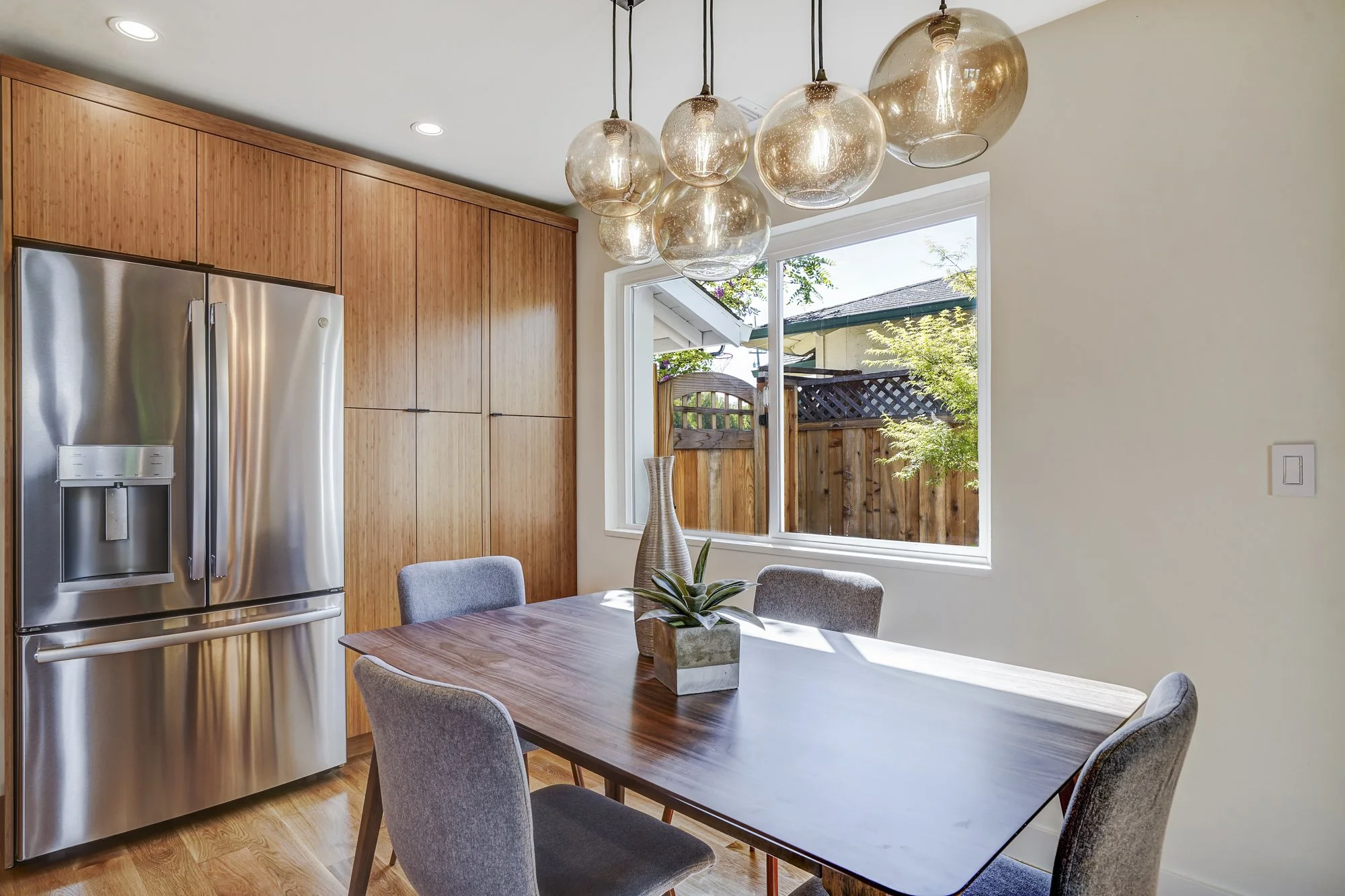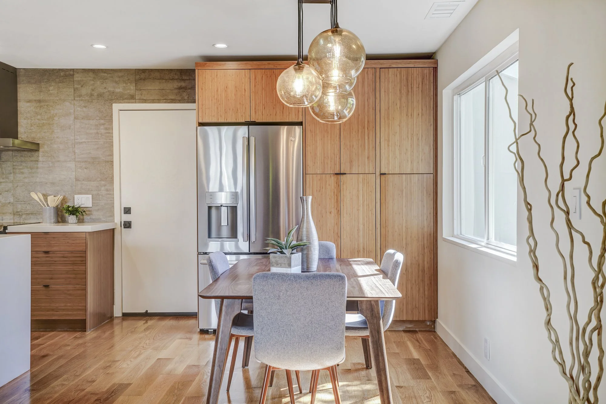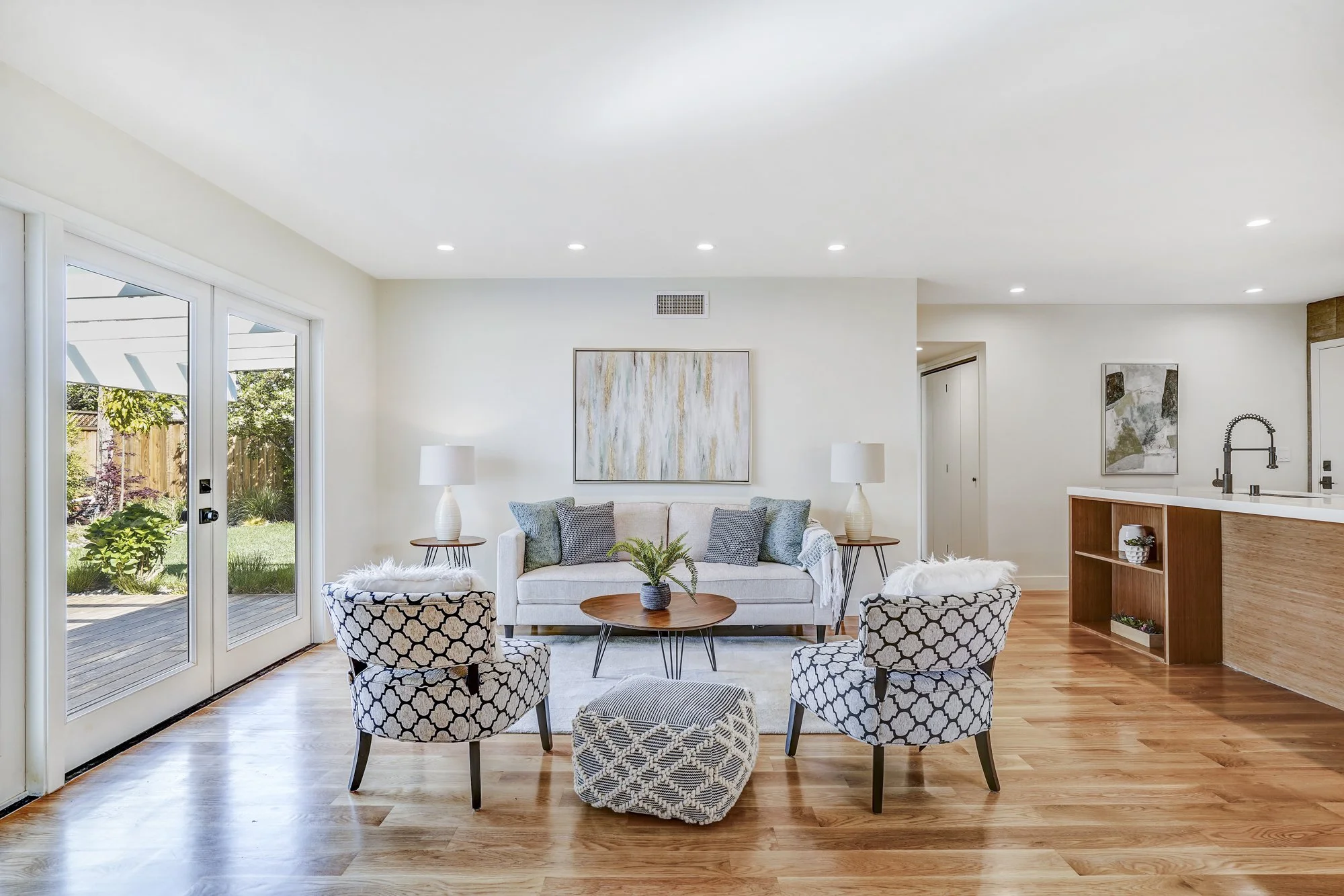 This recently remodeled 4-bedroom home boasts stylish finishes, open-concept living spaces, and a tranquil backyard retreat. Stepping inside, a sleek modern kitchen features a waterfall center island, quartz countertops, and custom bamboo cabinetry. The open dining and living room allows for flexible day-to-day living, while also transforming into a fabulous indoor/outdoor entertaining space with huge glass French doors that open out to the shaded backyard patio.