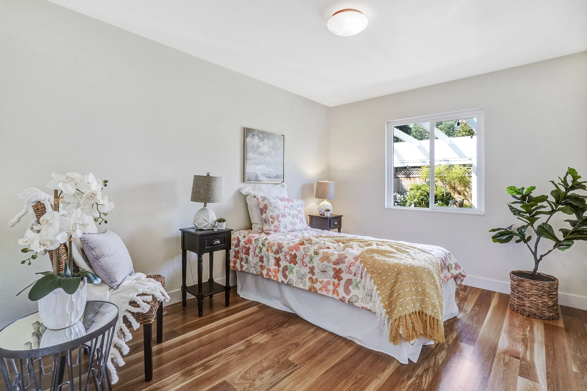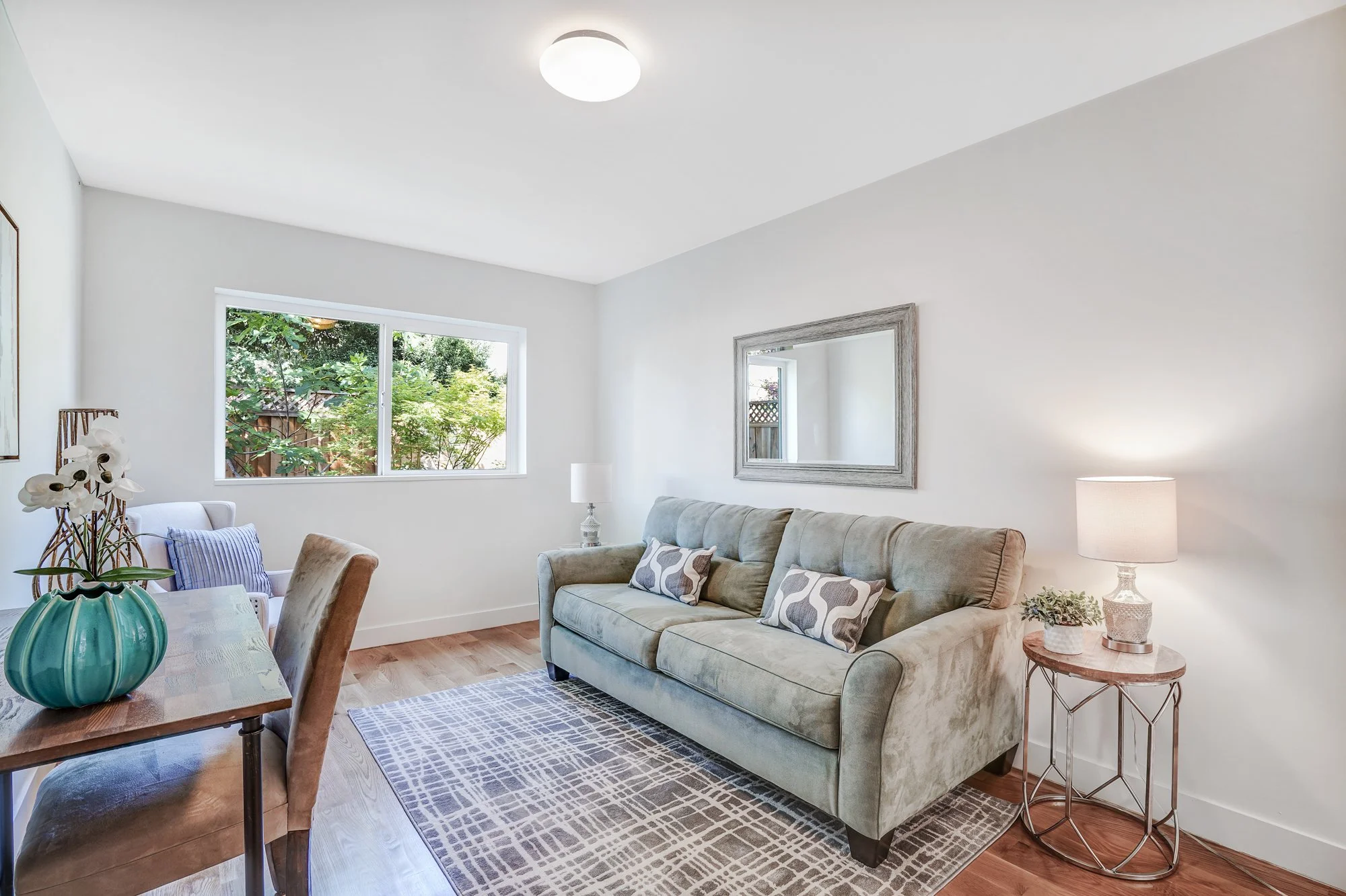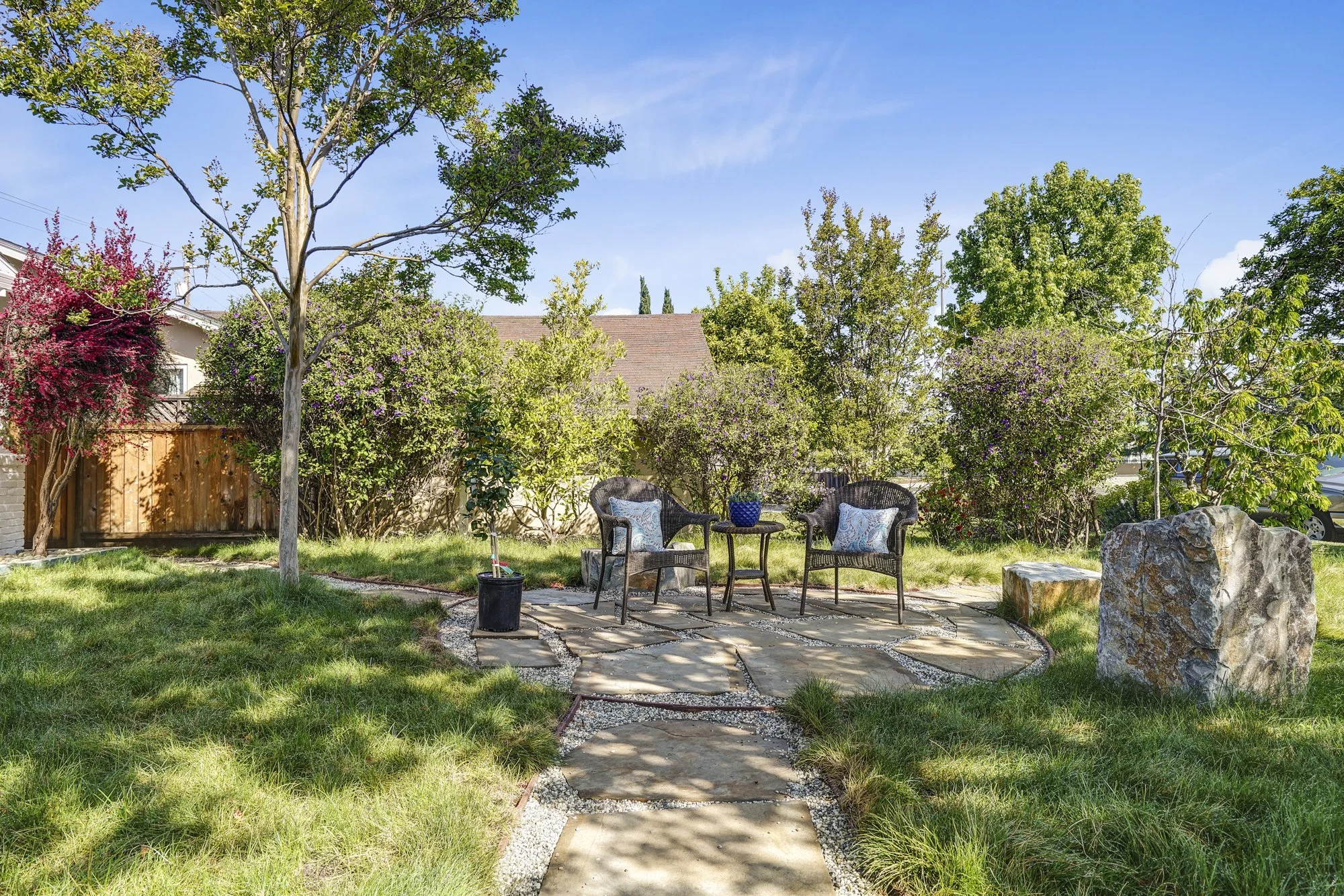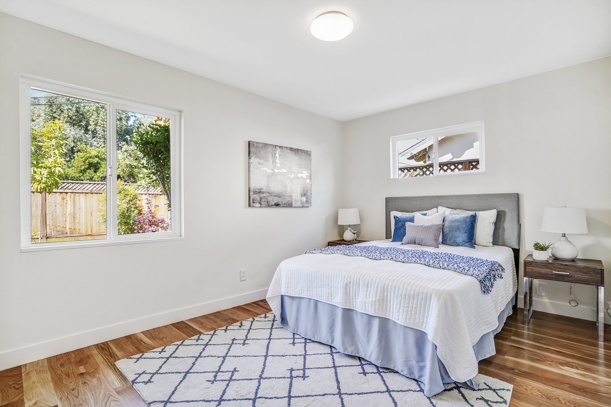This recently remodeled 4-bedroom home boasts stylish finishes, open-concept living spaces, and a tranquil backyard retreat. Stepping inside, a sleek modern kitchen features a waterfall center island, quartz countertops, and custom bamboo cabinetry. The open dining and living room allows for flexible day-to-day living, while also transforming into a fabulous indoor/outdoor entertaining space with huge glass French doors that open out to the shaded backyard patio.