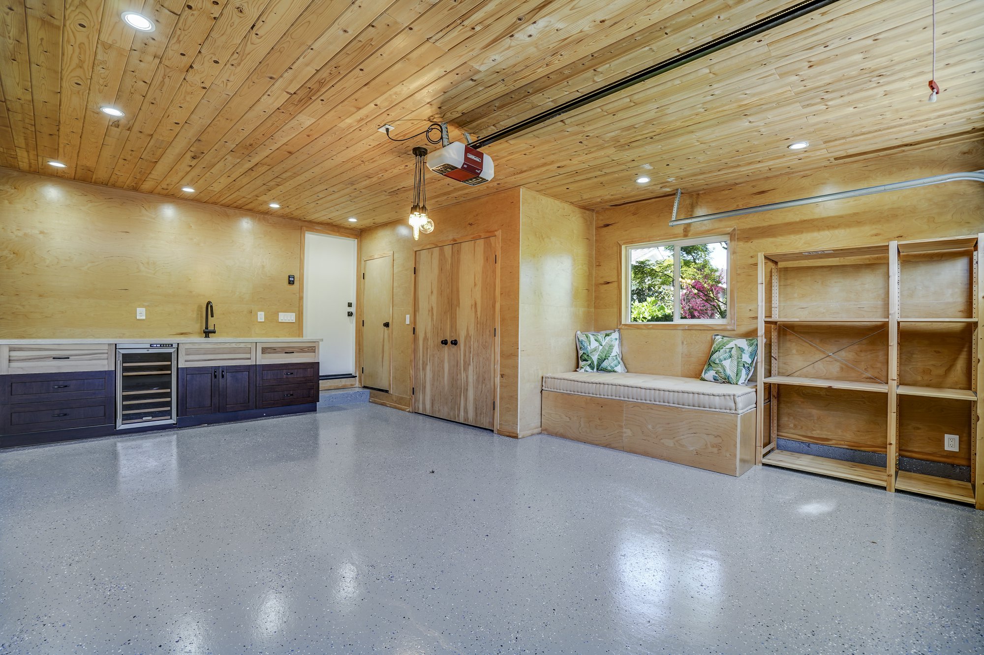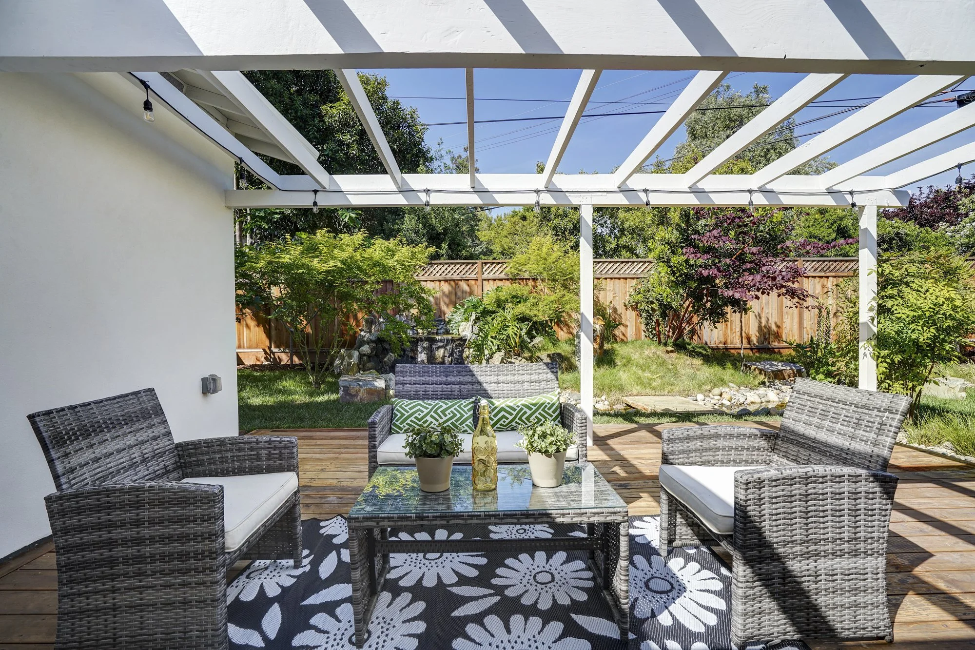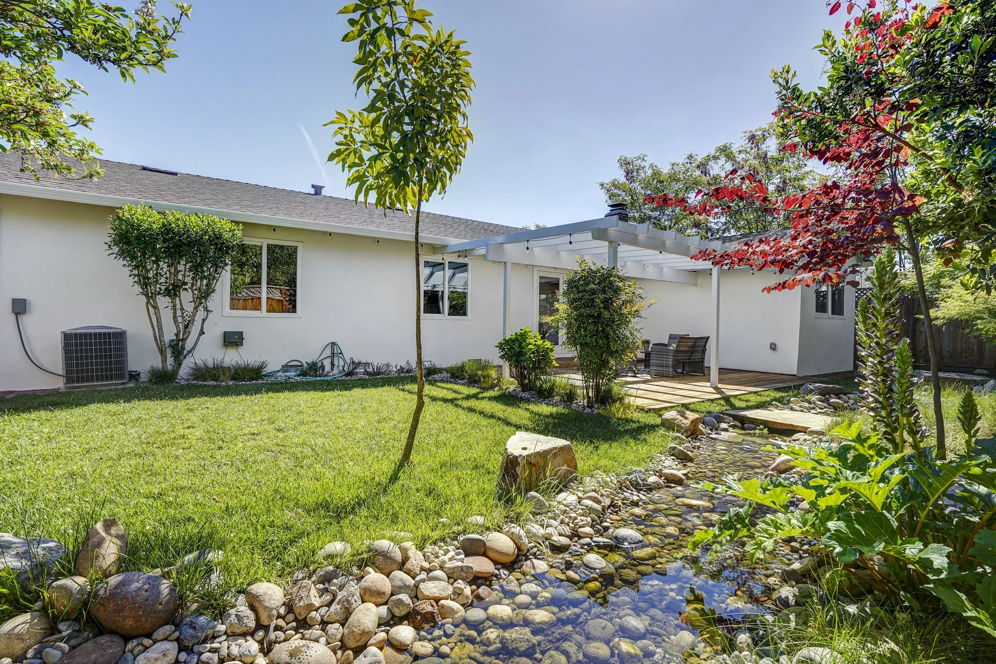 4 bedrooms and 2 baths can easily accommodate everyone, while the 6,480 sq ft lot provides ample outdoor spaces in the front and backyards. The rear deck is a perfect place to relax and listen to the sounds of the custom landscaped creek that runs through the backyard. Additional amenities include a finished garage with built-in cabinets, wine fridge, quartz counter with sink, and epoxy flooring.