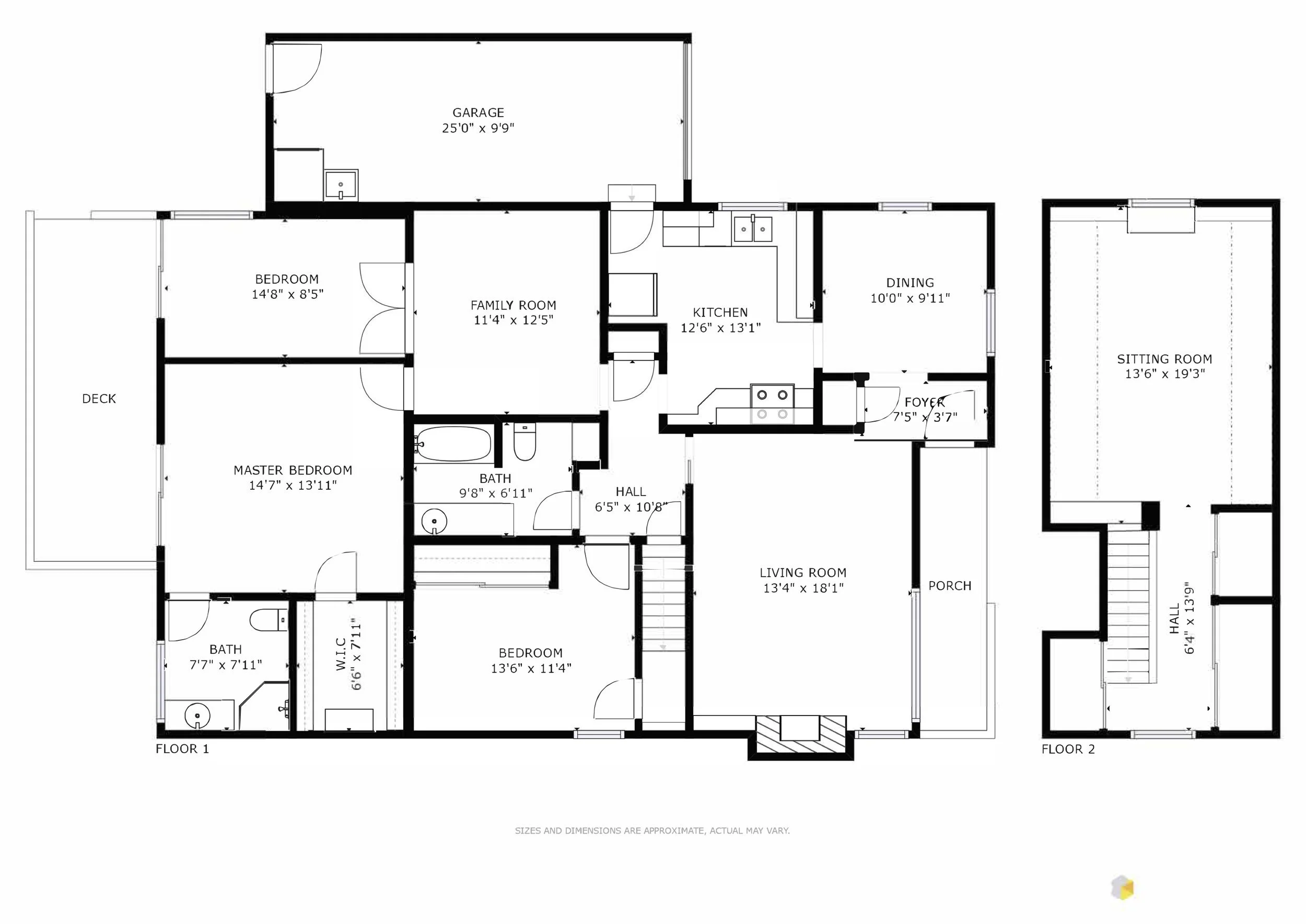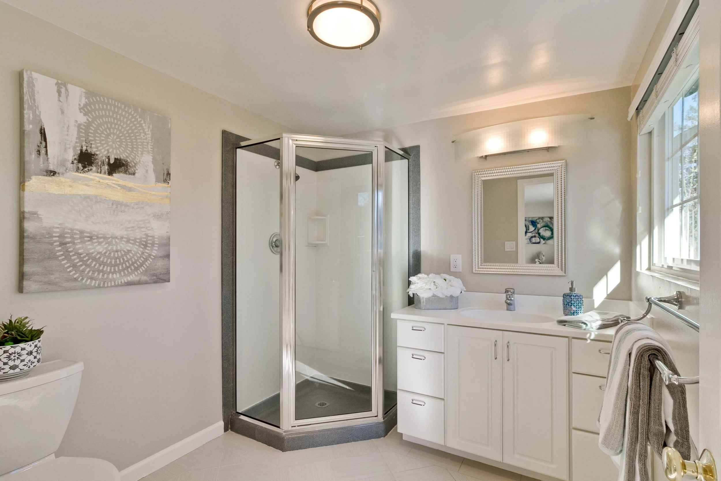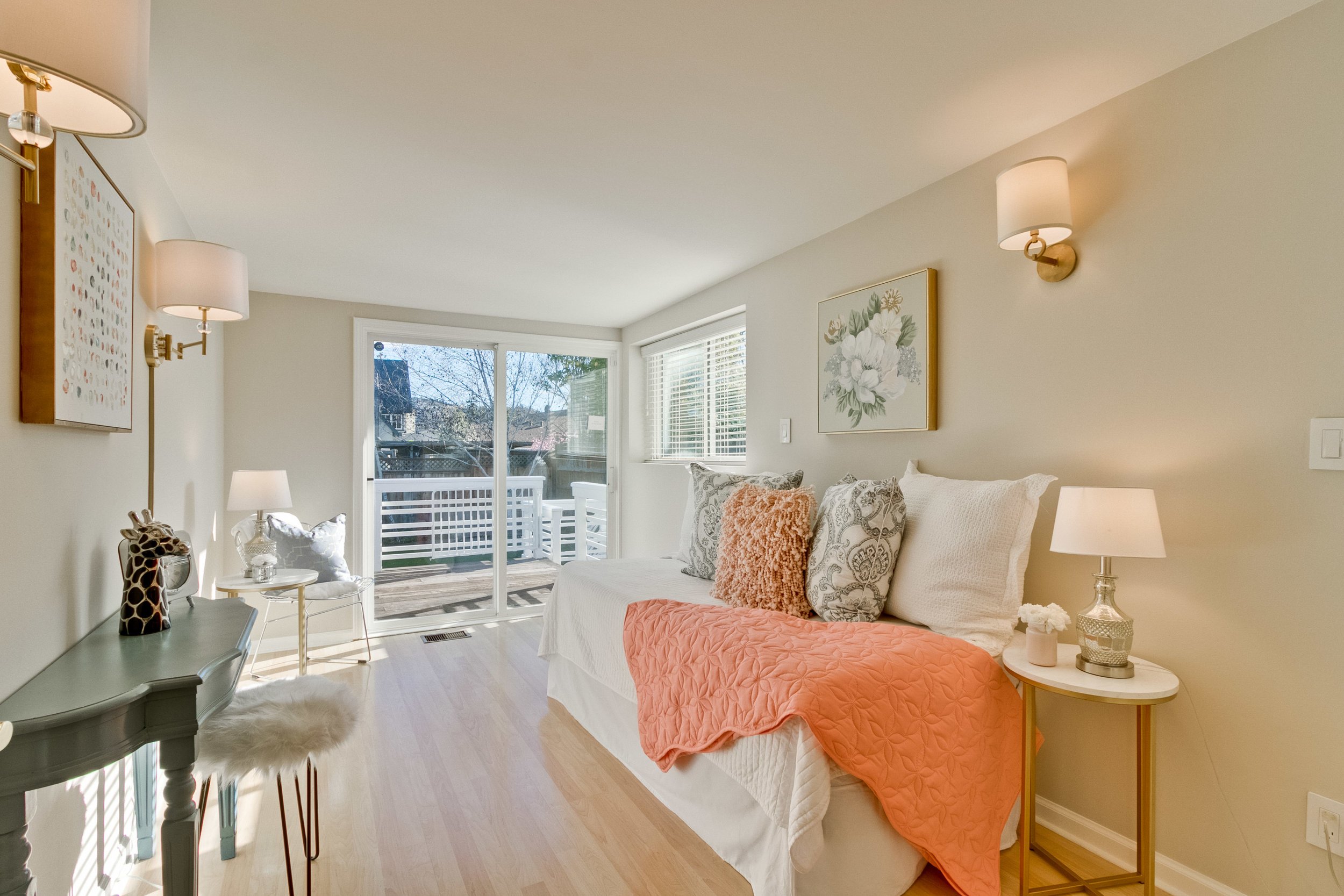 The hall bath is near 3 main-level bedrooms, including a master suite with a luxurious walk-in closet, private bathroom, and sliding glass doors out to the deck.