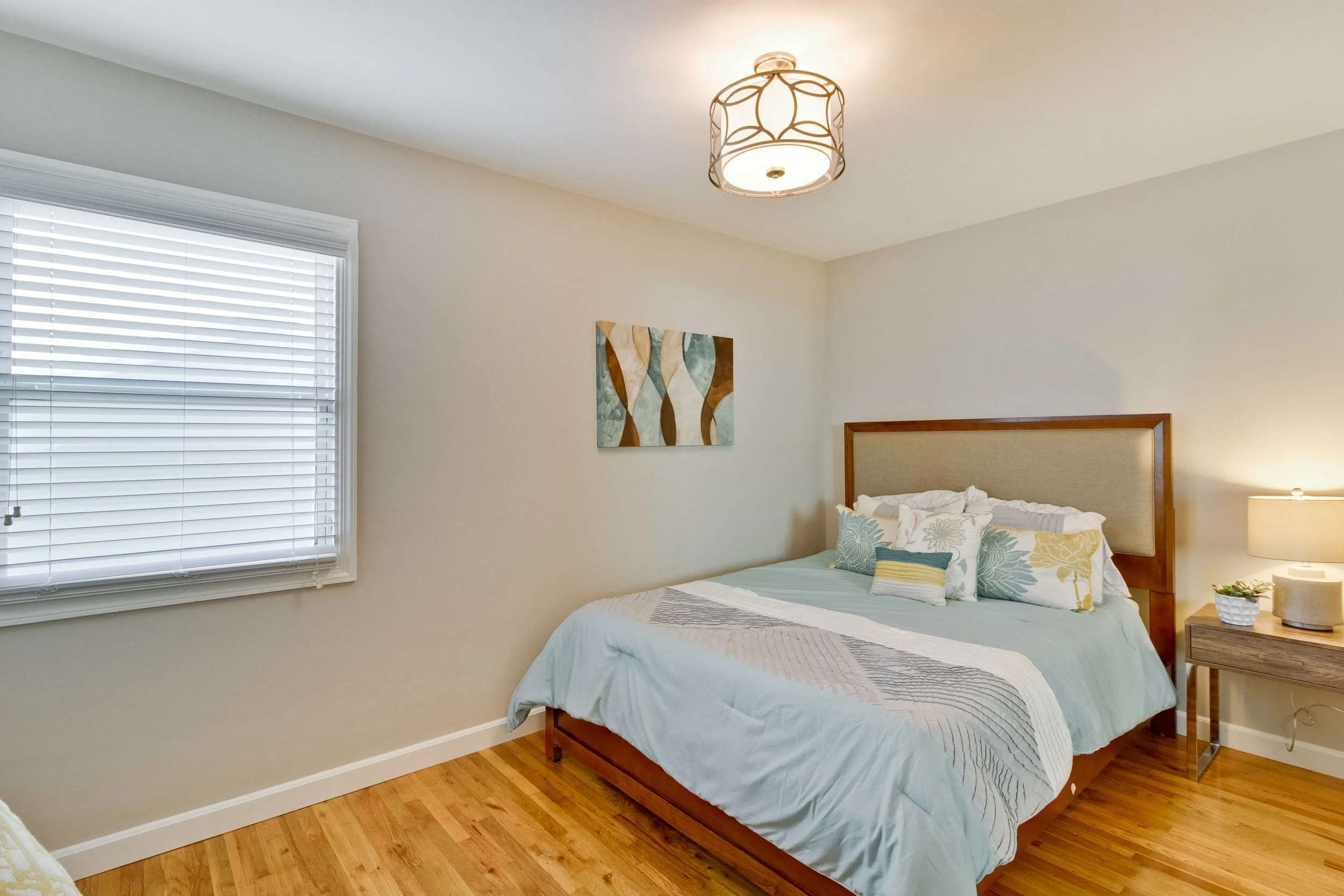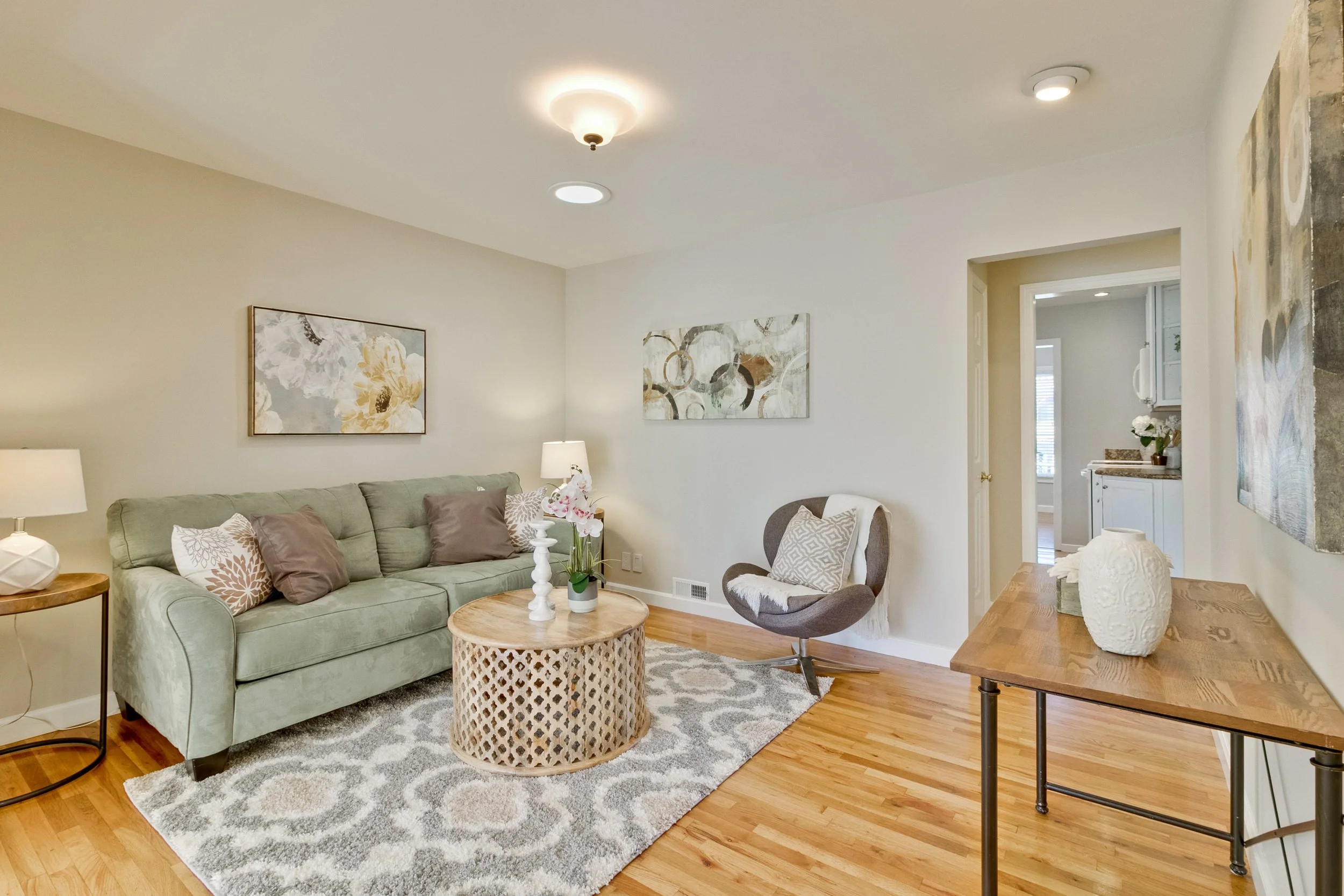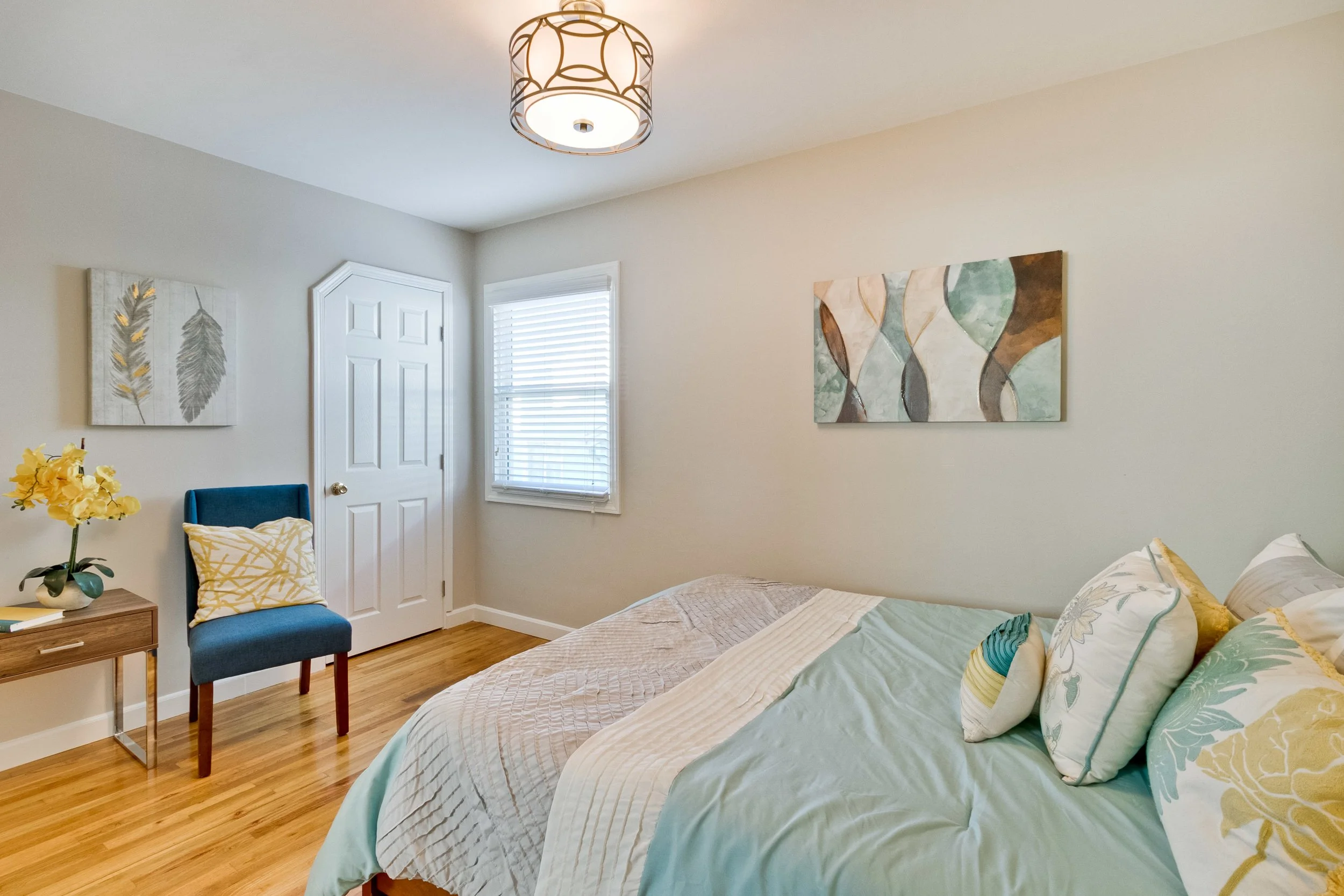 The white picket fence and front porch are a charming introduction to the updated interior with hardwood floors, dual-pane windows, Lutron dimmable lighting, and upgrades like central A/C, and a stylish color scheme.