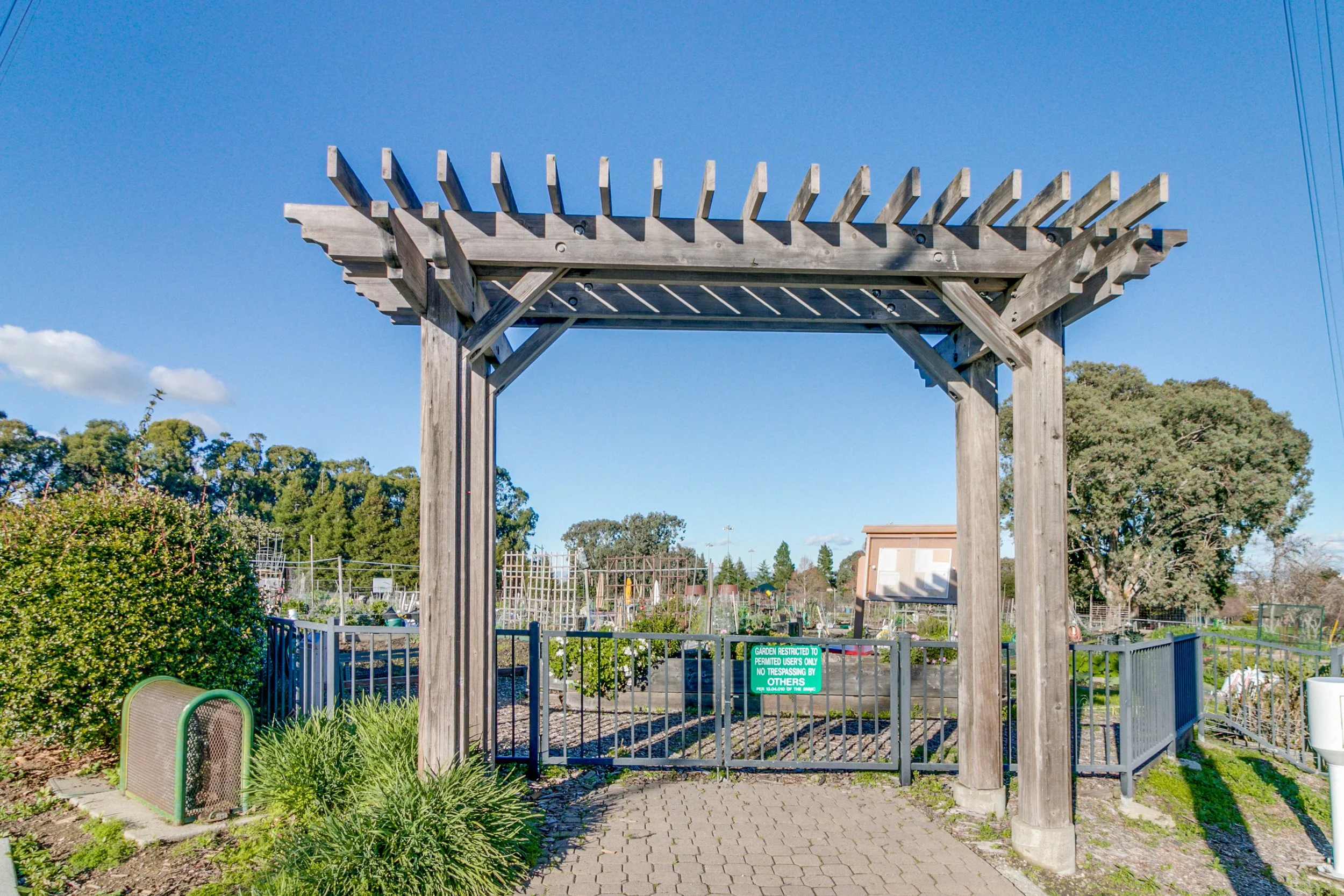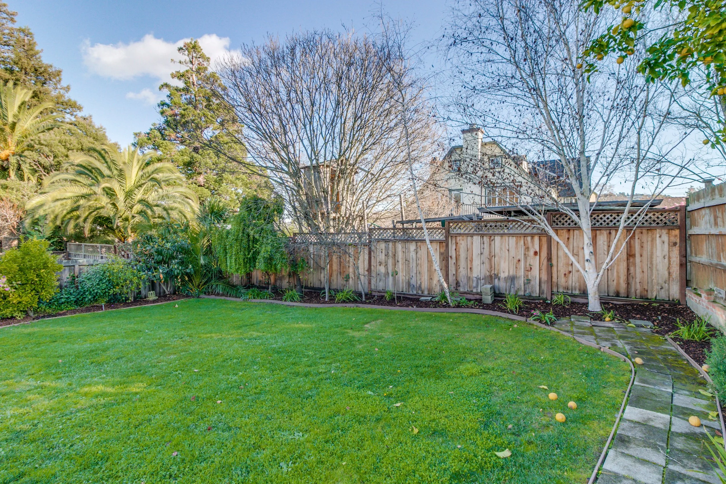 Large decks designed for entertaining overlook a spacious, landscaped backyard with a footpath and fruit trees.