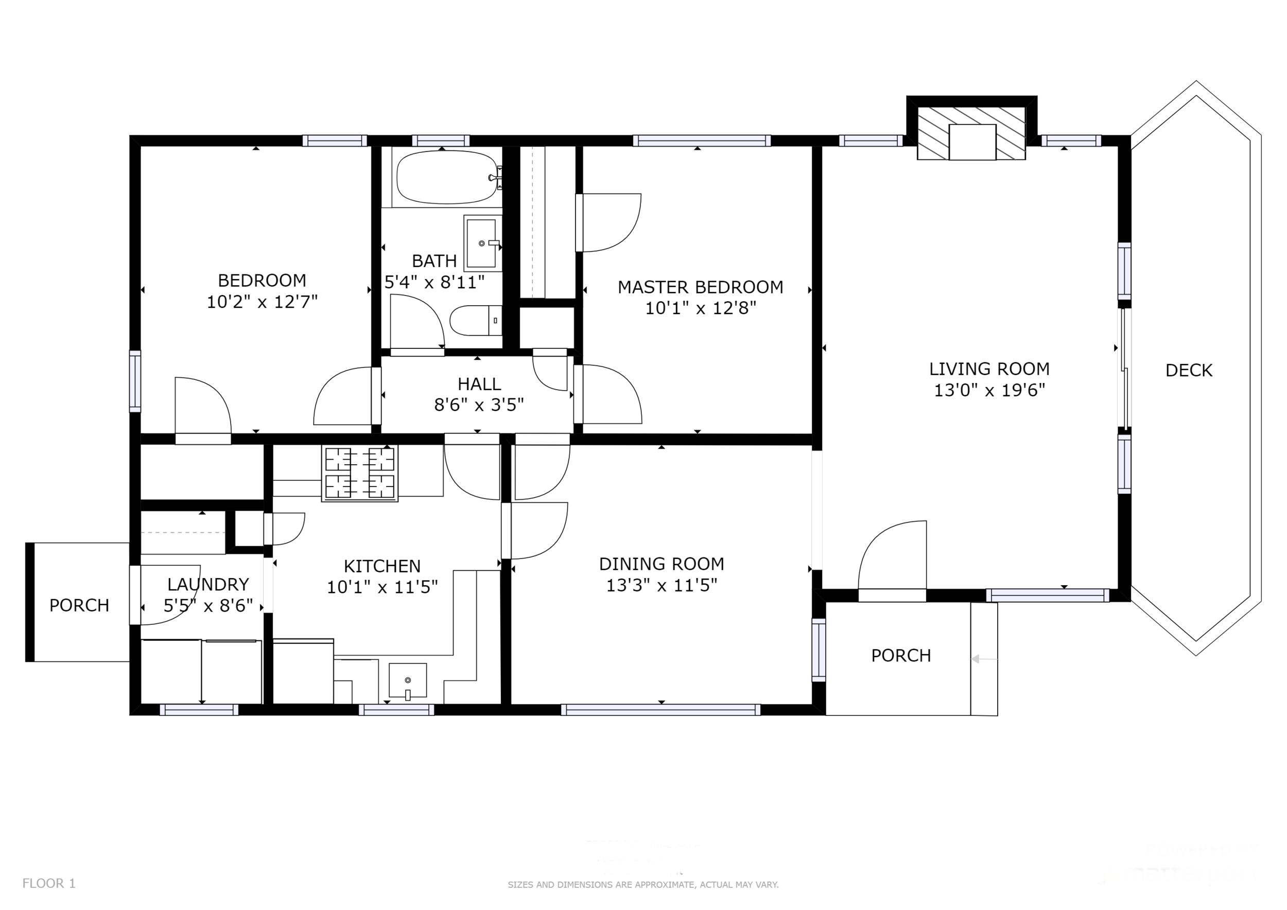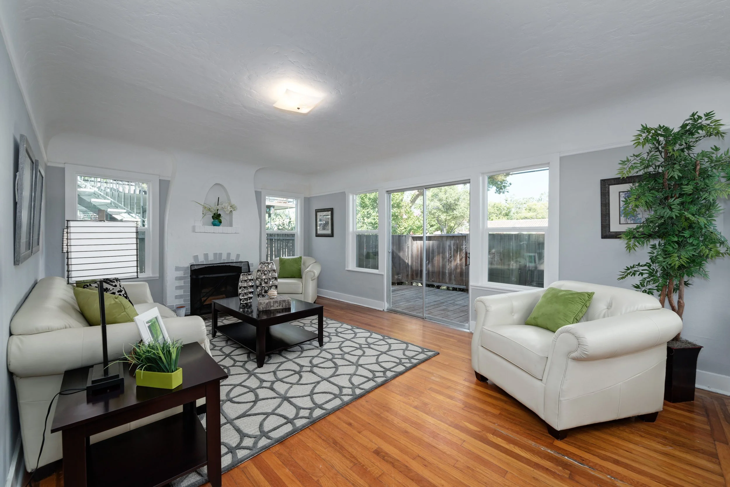 - A handsome fireplace centers the living room, which grants access to the front deck and leads into the formal dining room through a graceful archway