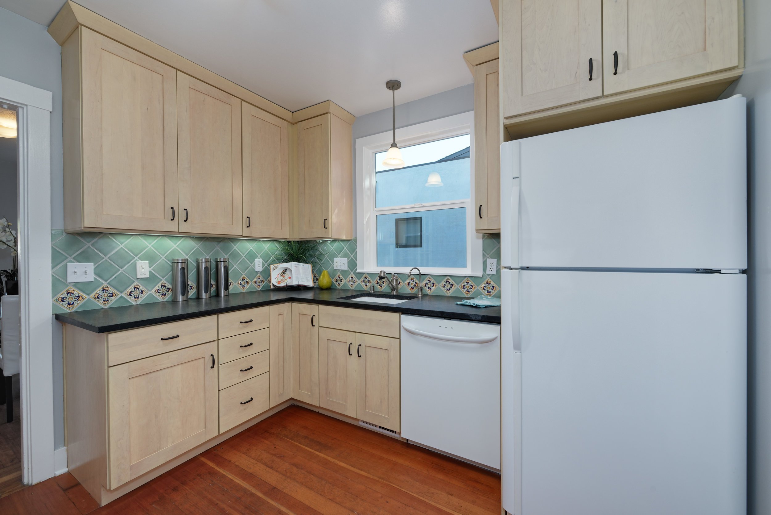 - The kitchen is sure to inspire culinary creativity with Shaker-style cabinetry, stone countertops, and a well-maintained O’Keefe & Merritt vintage oven