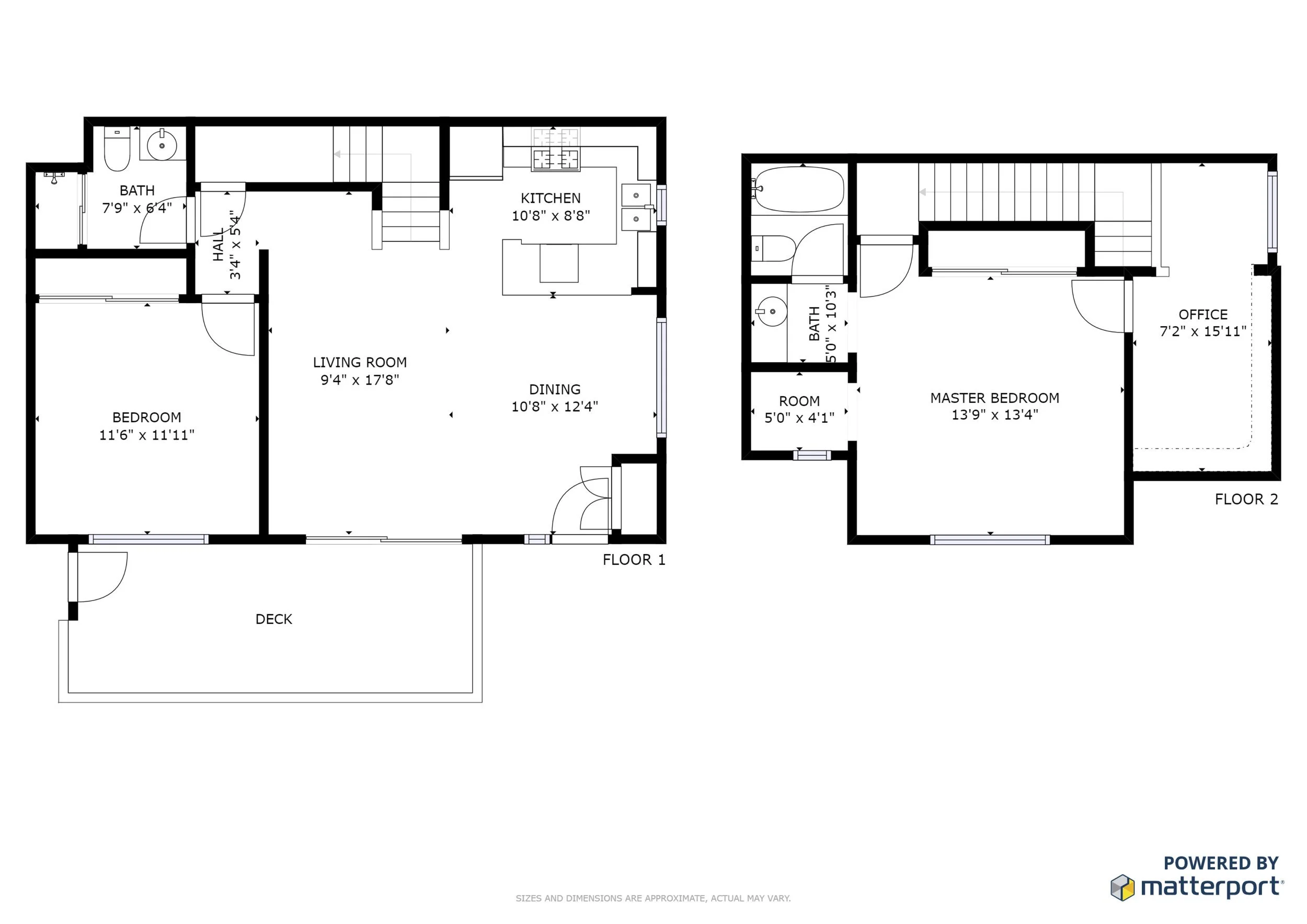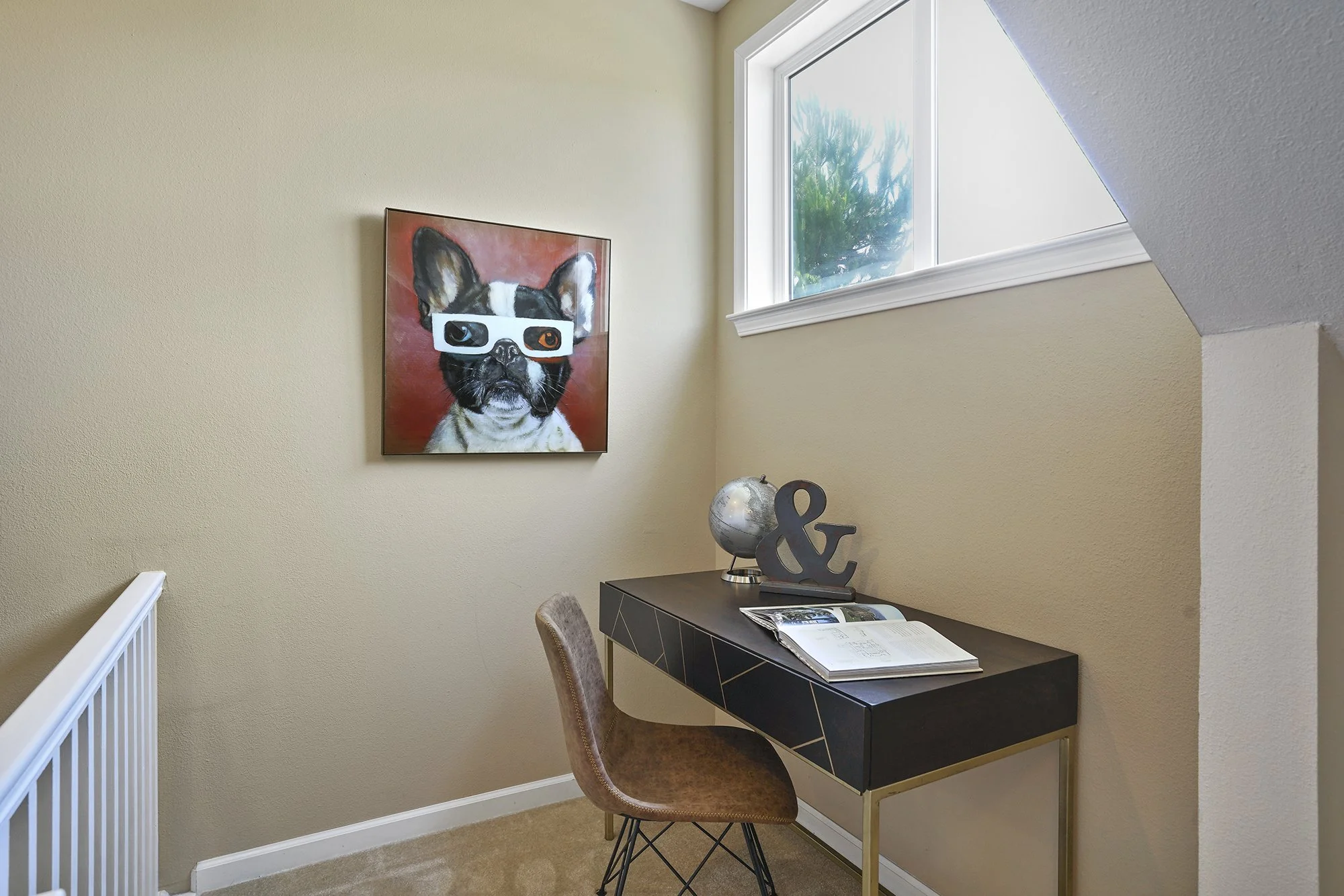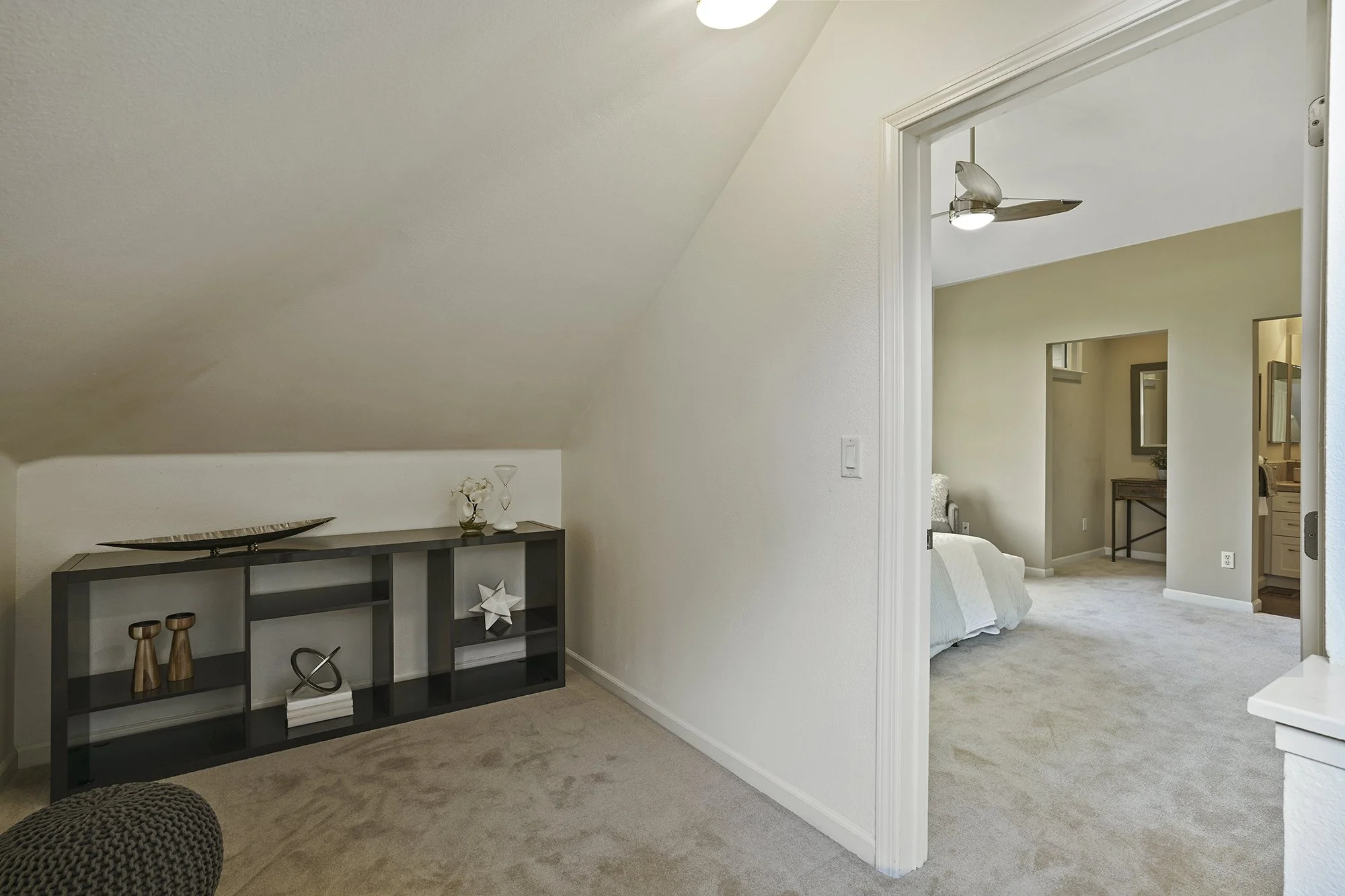Upstairs master suite boasts a vaulted ceiling, private bath, storage nook, and bonus space perfect for a hobby or office