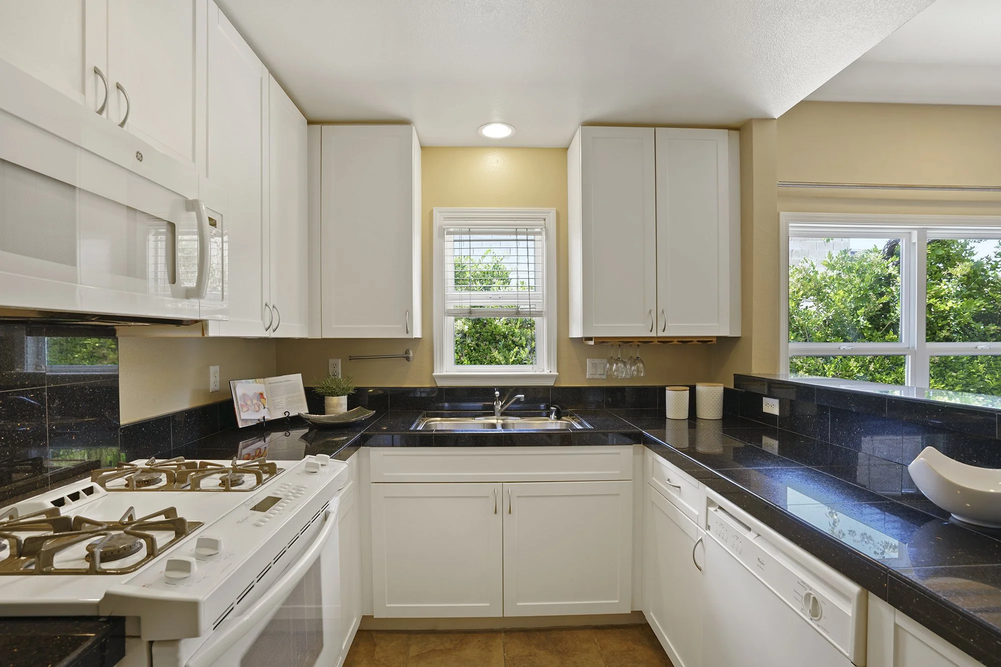 Fully featured kitchen has granite tile countertops, stylish shaker cabinets, and recessed lighting