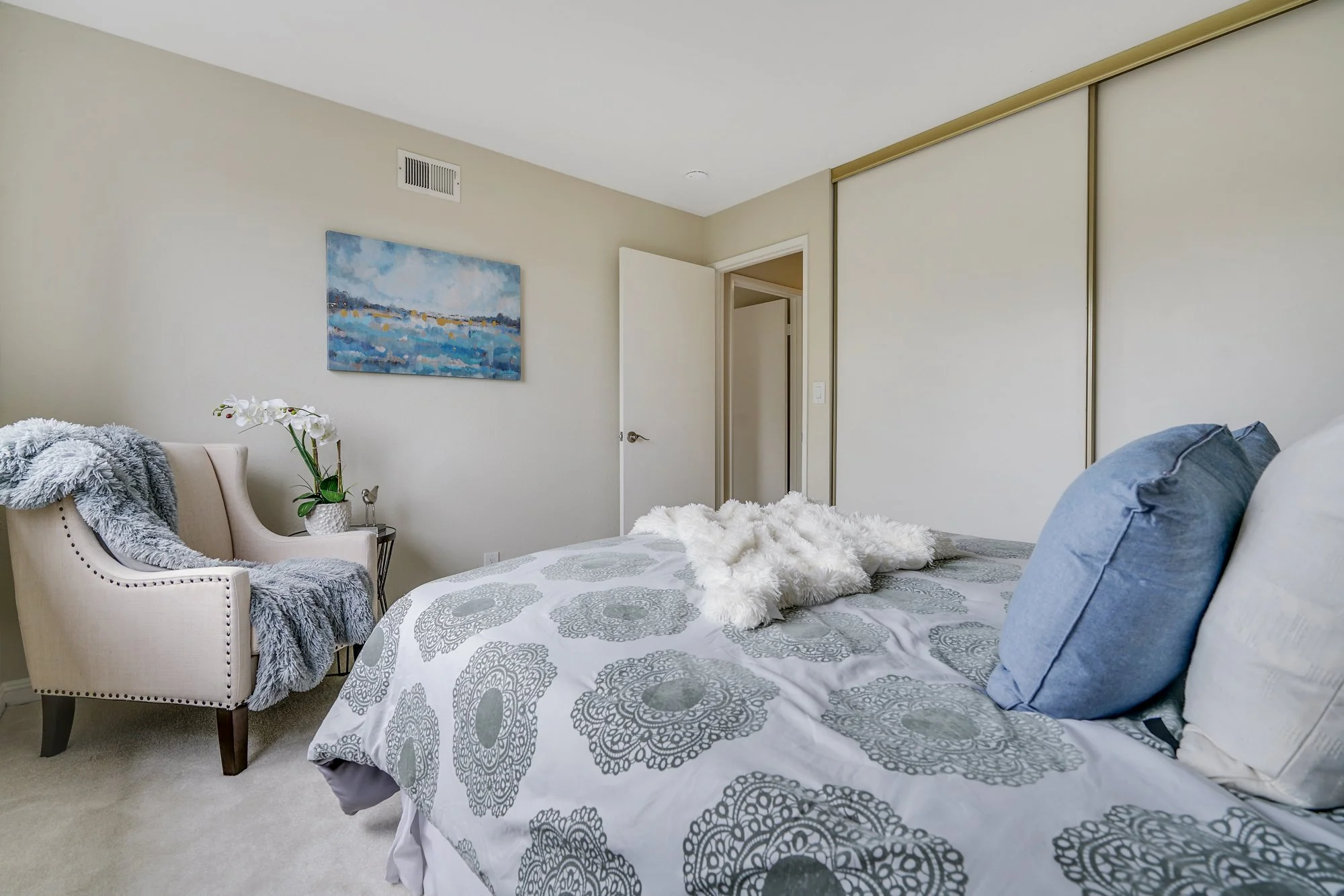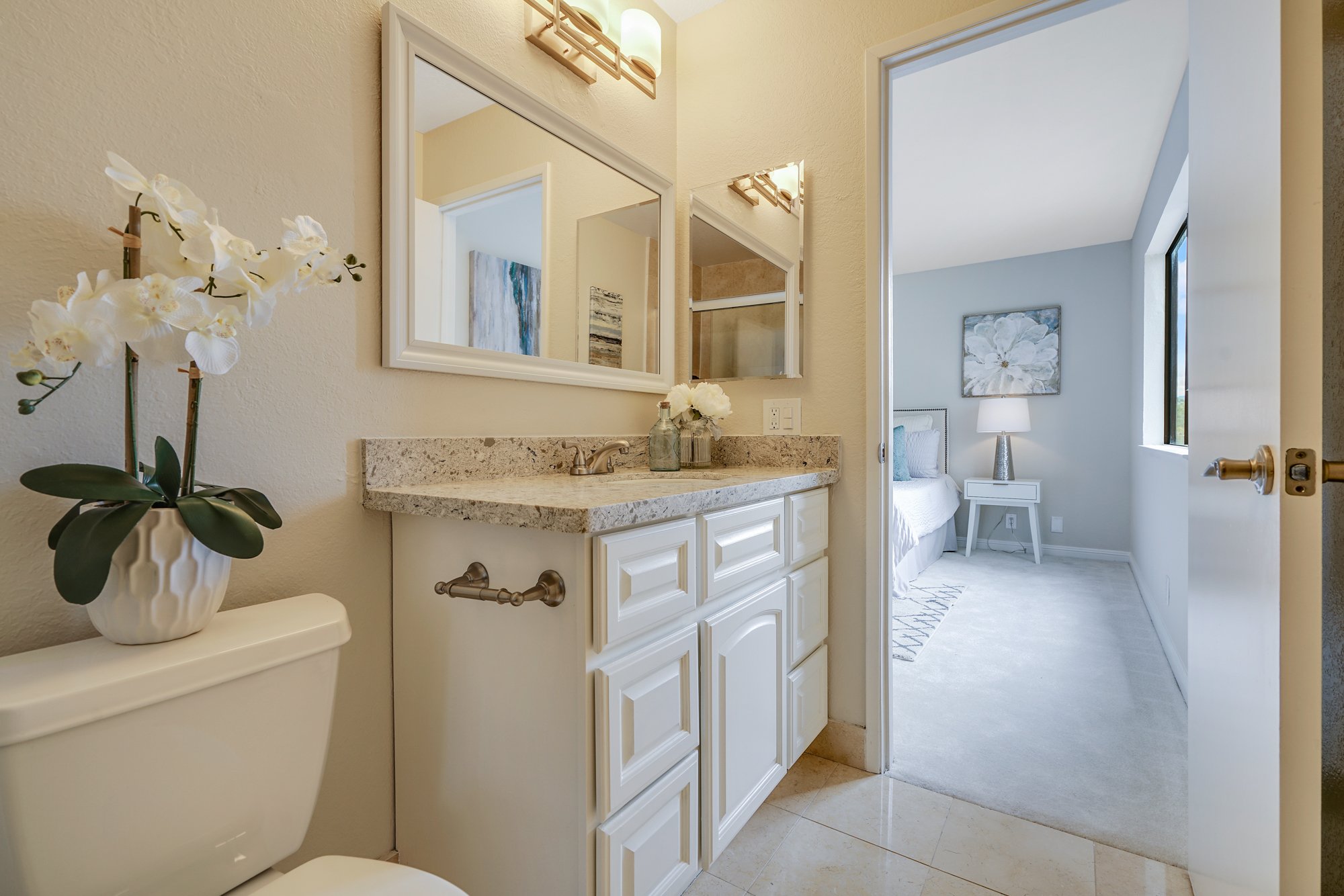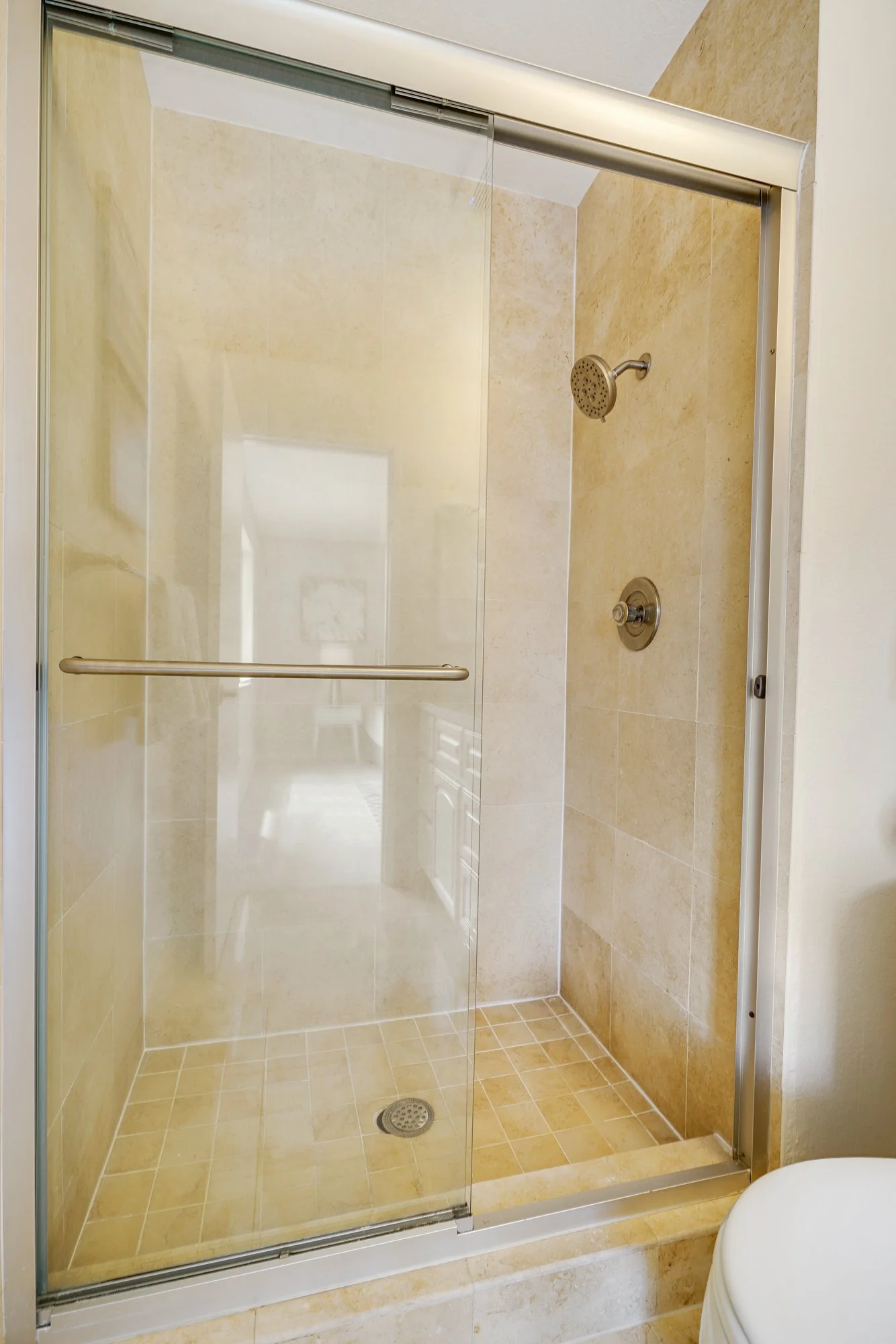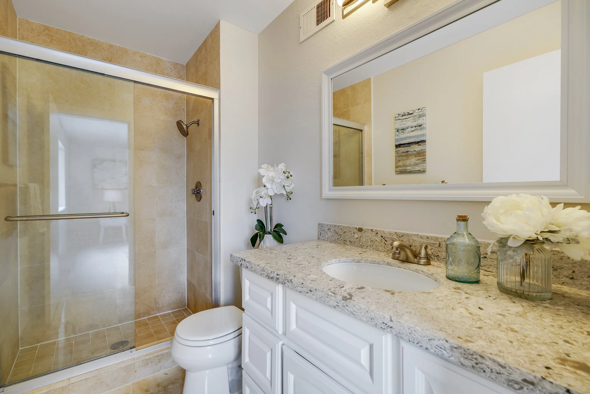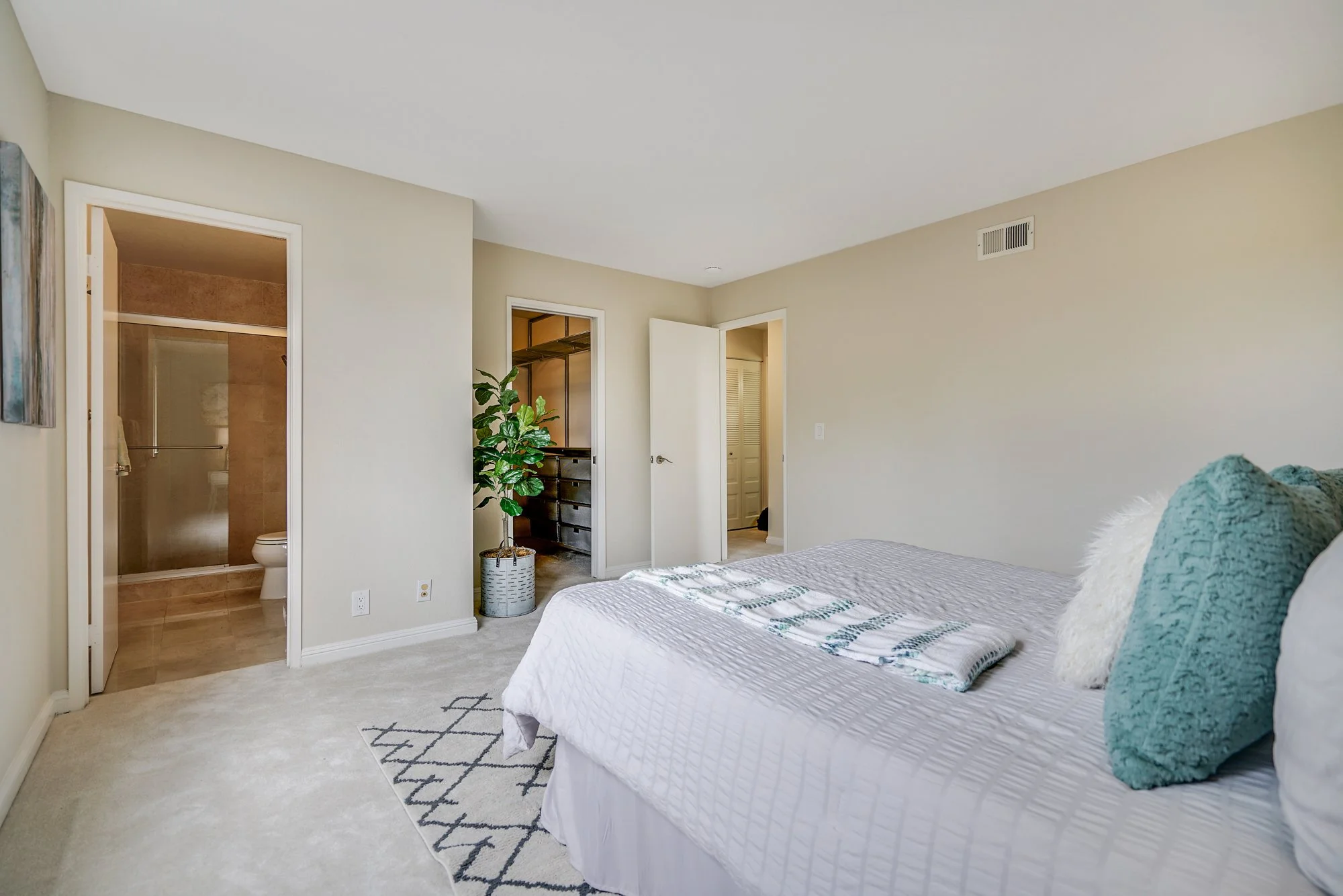 • Master bedroom suite features a walk-in closet and private bathroom, complete with a tiled shower and quartz vanity.