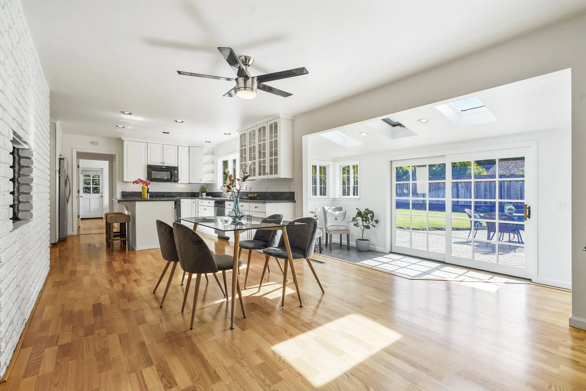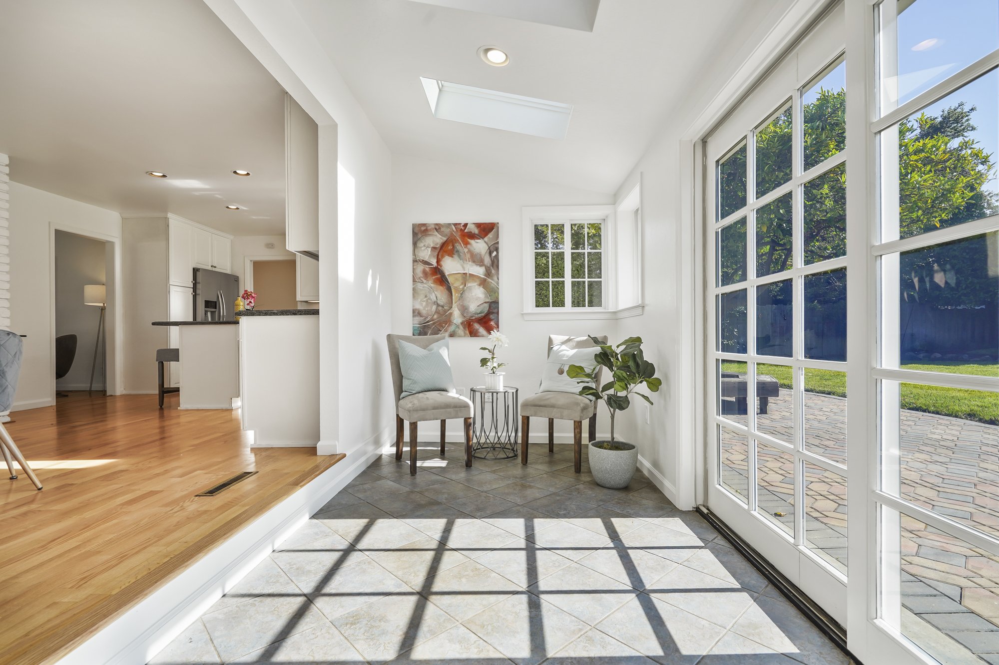 Step-down sunroom off the dining area features skylights and easy access to the paver patio for summer indoor-outdoor entertaining