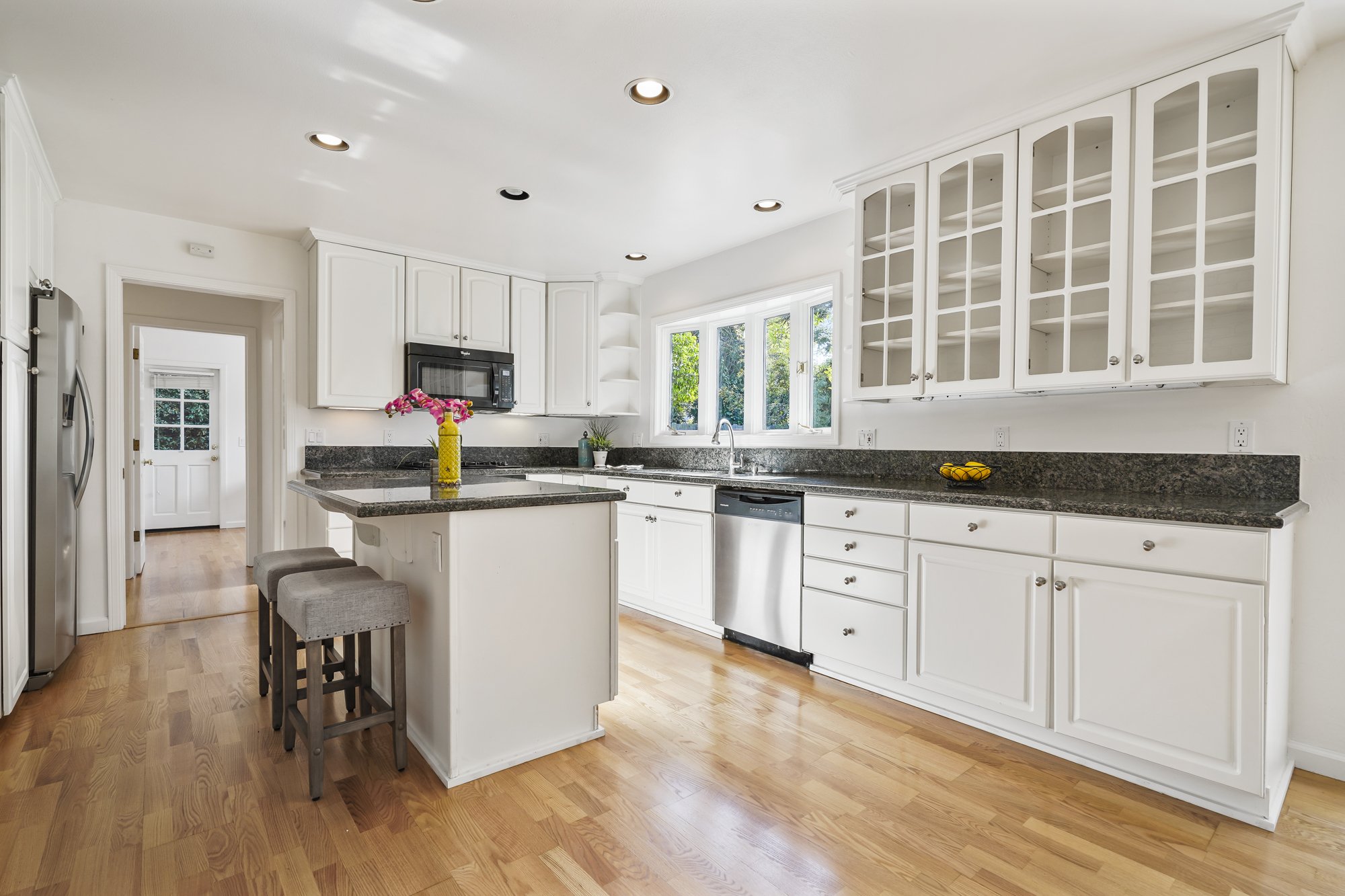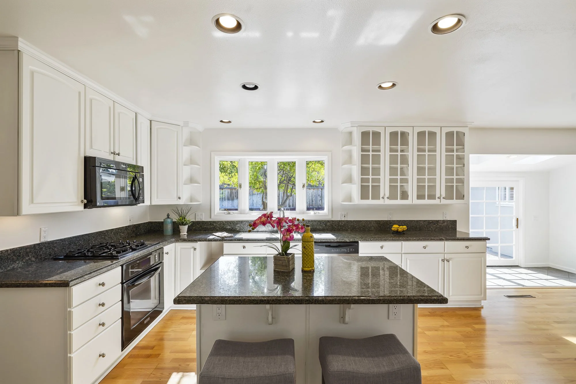 The central kitchen enjoys glass front cabinets, granite countertop island, recessed lighting, and bright kitchen sink windows