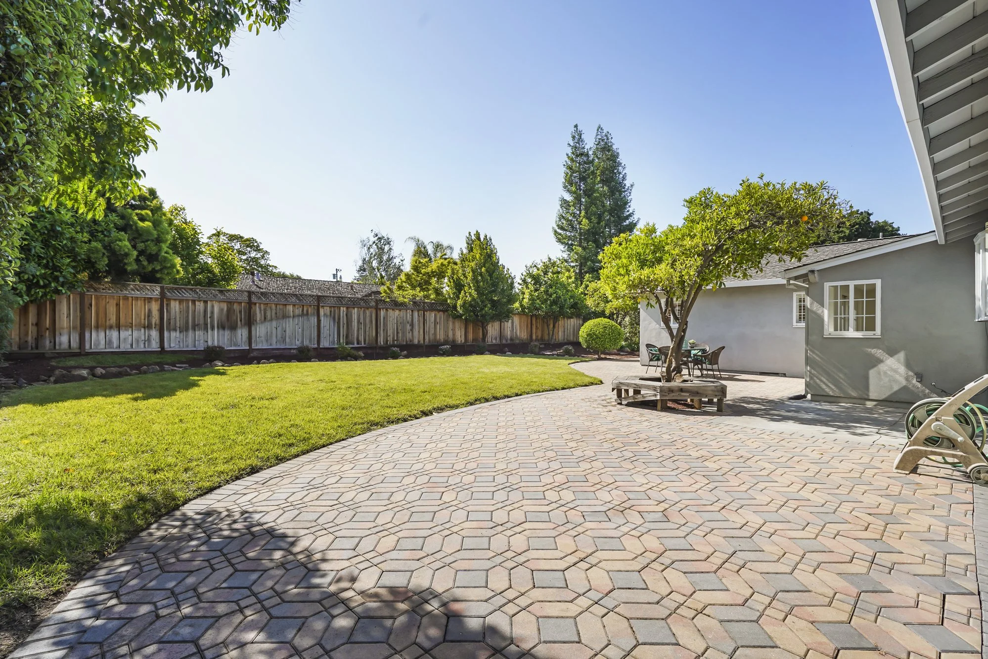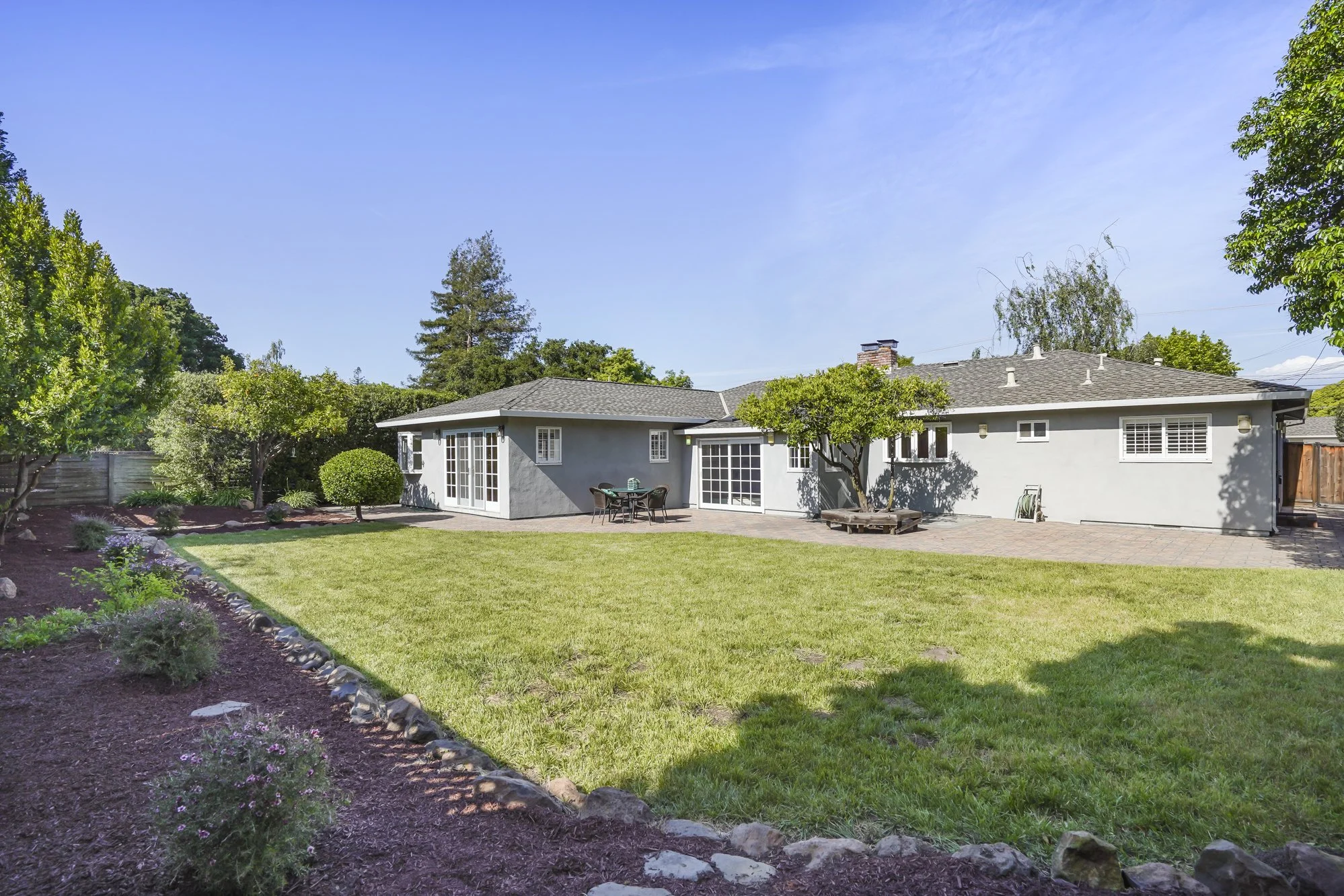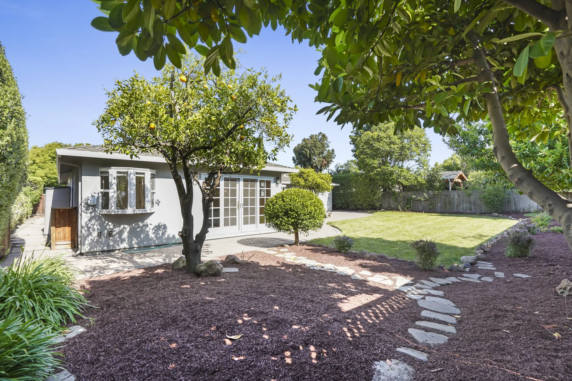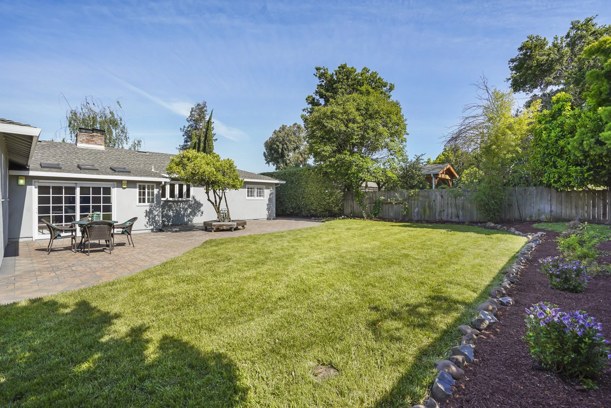 Expansive backyard offers a paver patio, large lawn area, fruit trees and stone perimeter landscaping