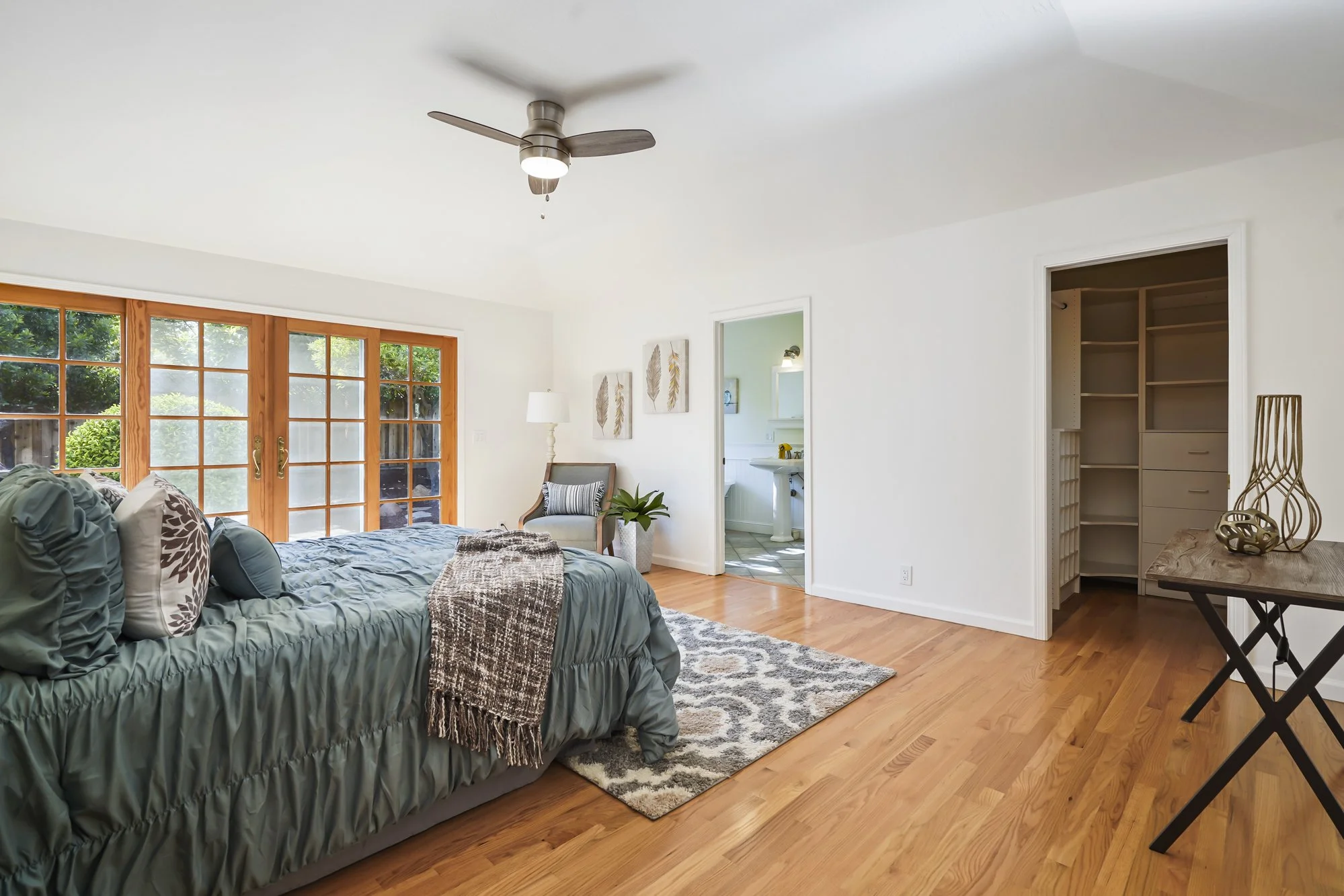 An expanded master suite features a walk-in closet, backyard access, and private bath with a relaxing freestanding tub sitting under a bay window
