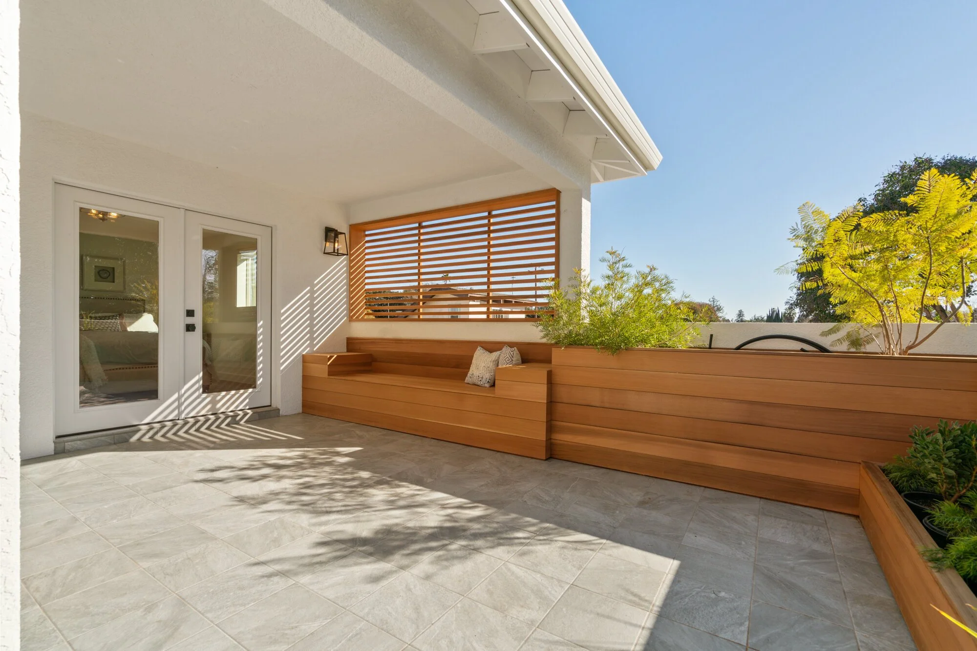 All gathering areas flow into the backyard, where residents can unwind on the large lawn or entertain on the vast redwood-trimmed veranda