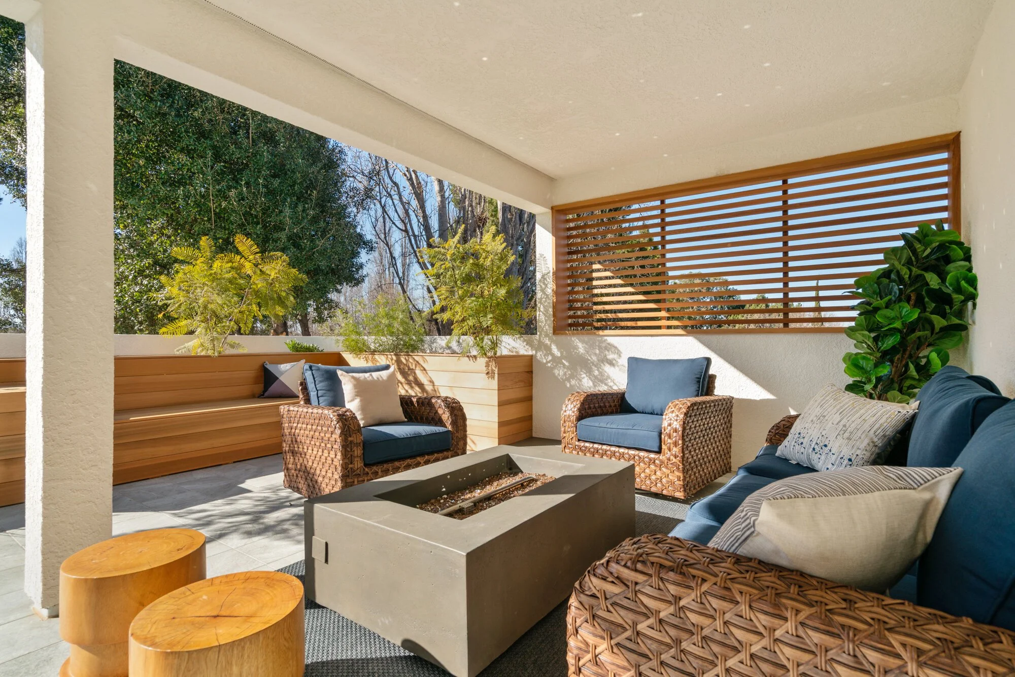 Swathed in comfort, the master retreat offers a gorgeous bath with rainfall shower and dual vanities, grand walk-in closet, and fabulous upper patio featuring a fire-pit, planters, and benches