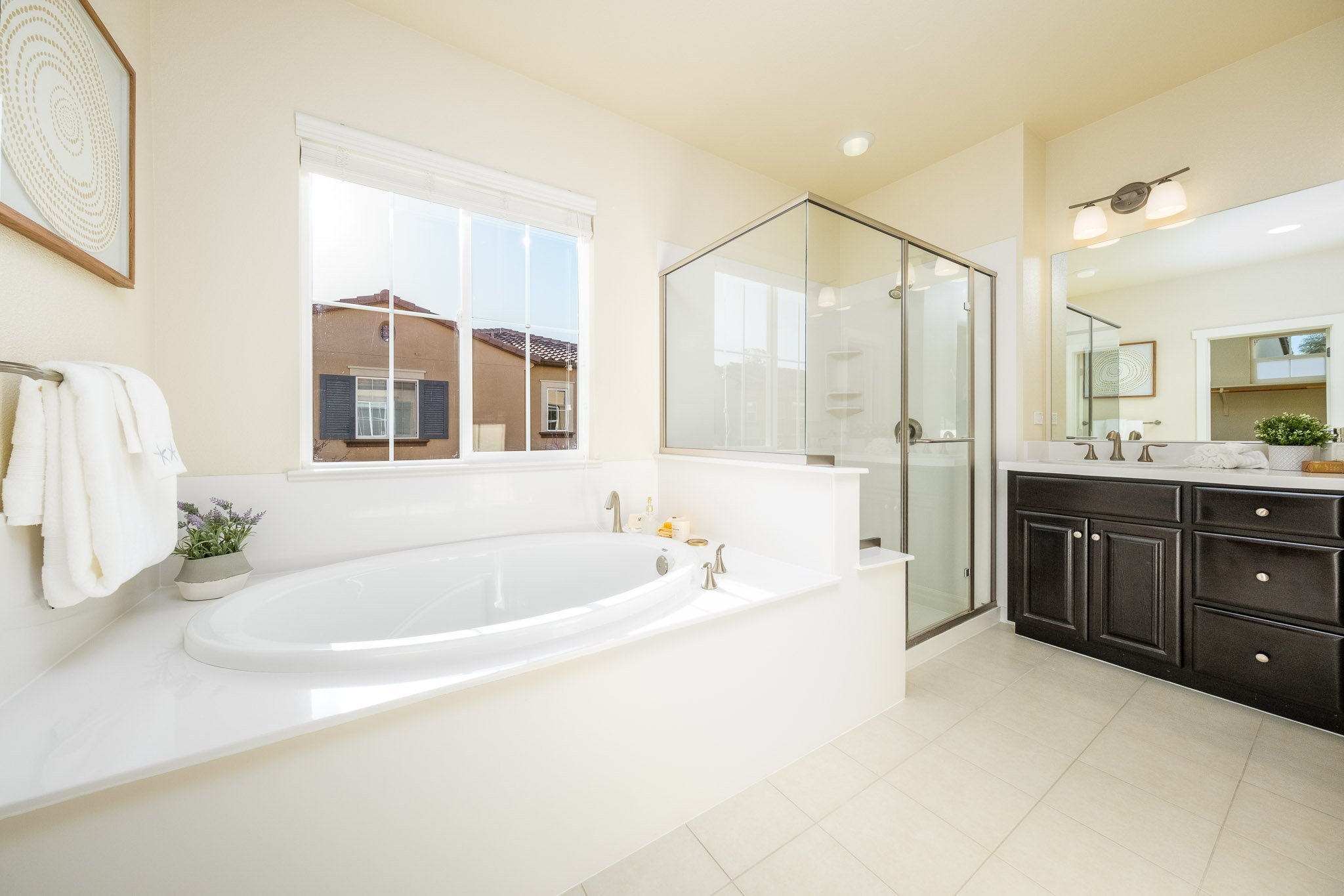 Romantic master suite with walk-in closet, bright master bathroom, walk-in shower, and built-in tub for relaxation