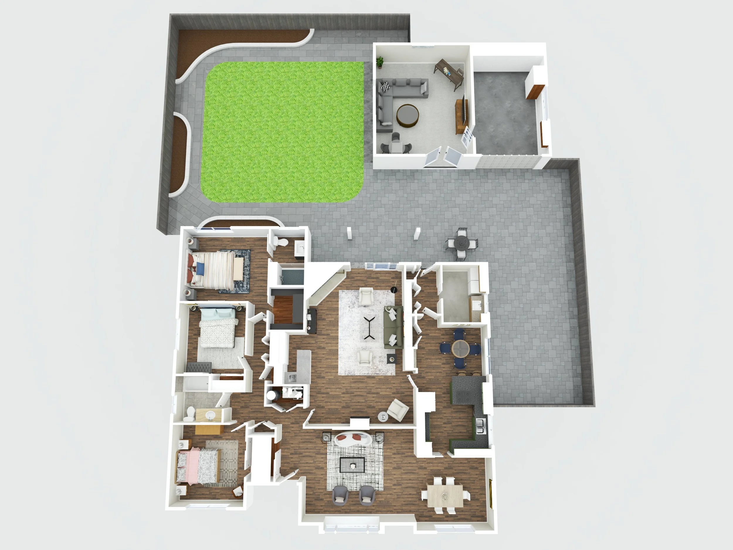 The exterior features grassy areas and a paver track that wraps around the garage