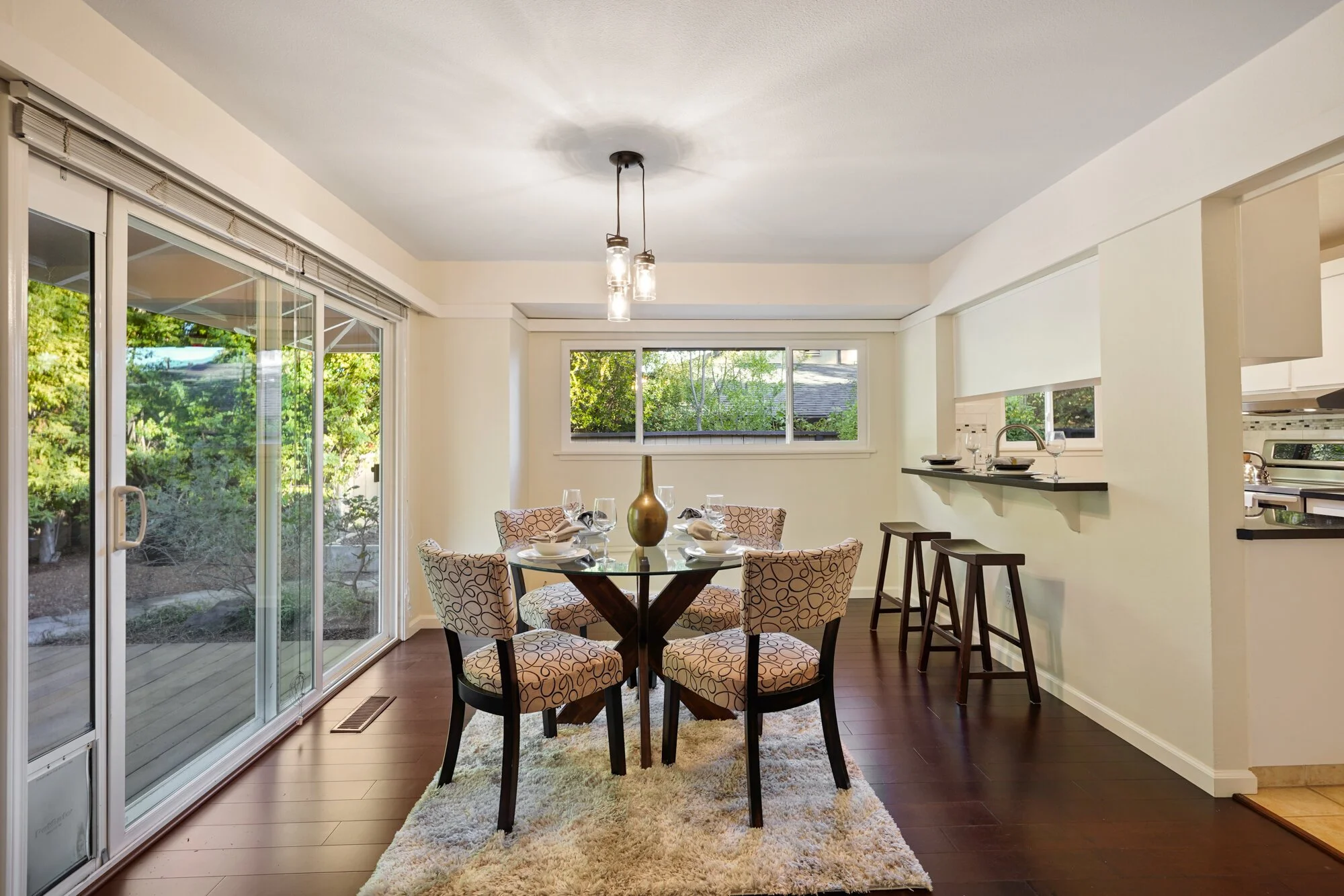 Gleaming countertops of black granite, a full backsplash, and stainless appliances lend high style to the refinished kitchen, which shares a breakfast bar with the dining room