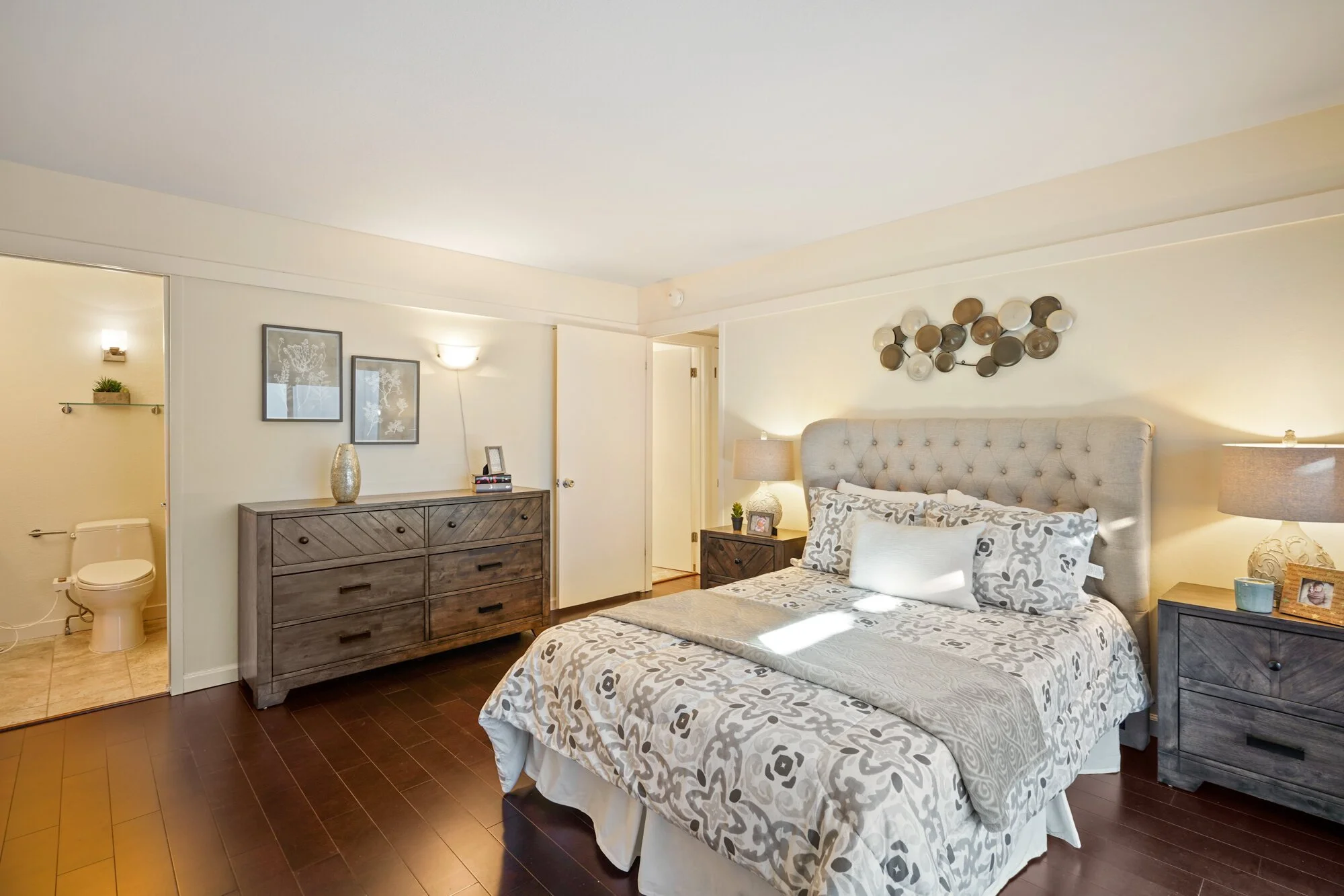 Gathered around a sizable hall bath, all three bedrooms are generously sized while the immense master bedroom showcases three closets, a remodeled en-suite bath, and access to the private front patio
