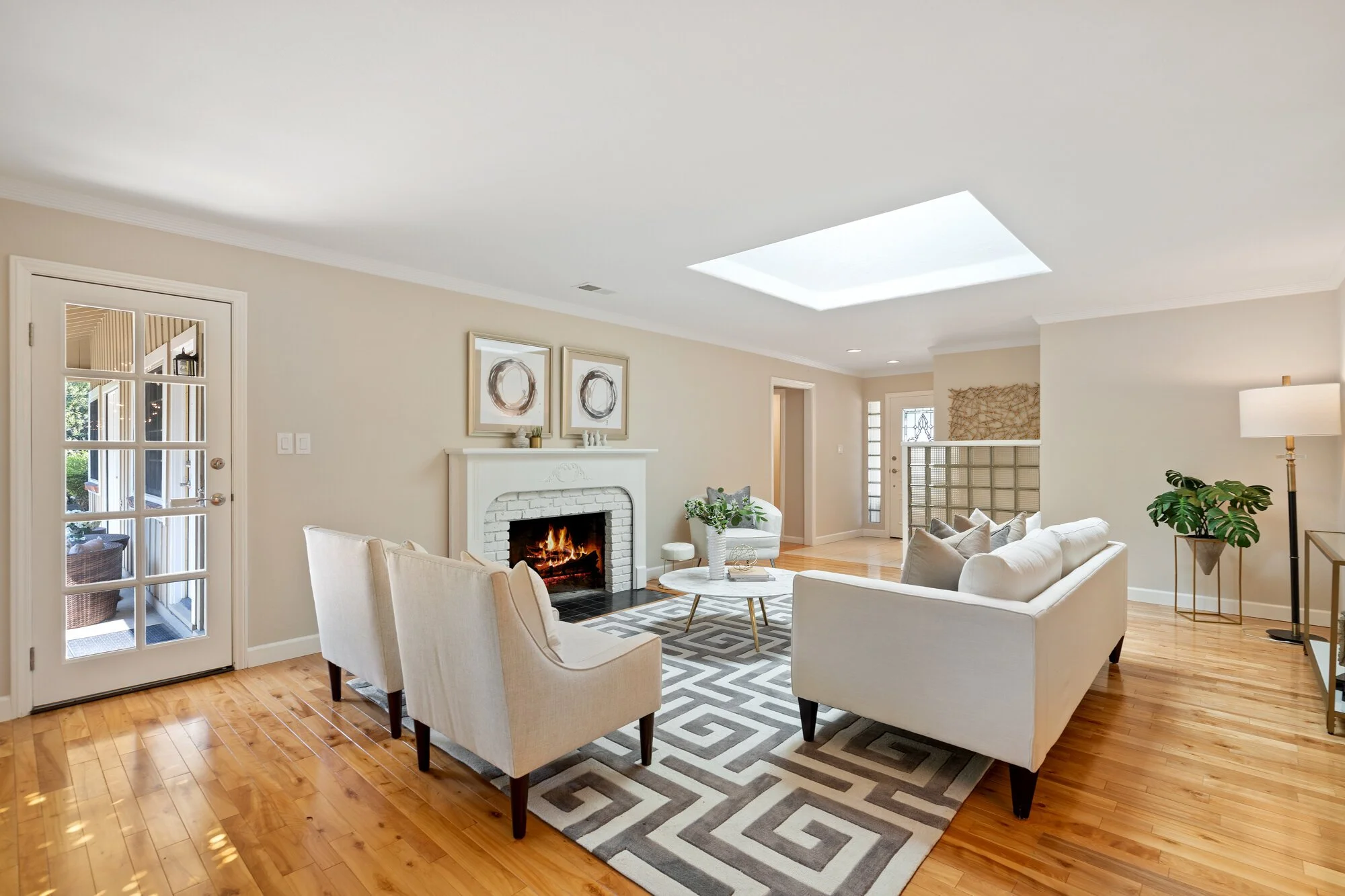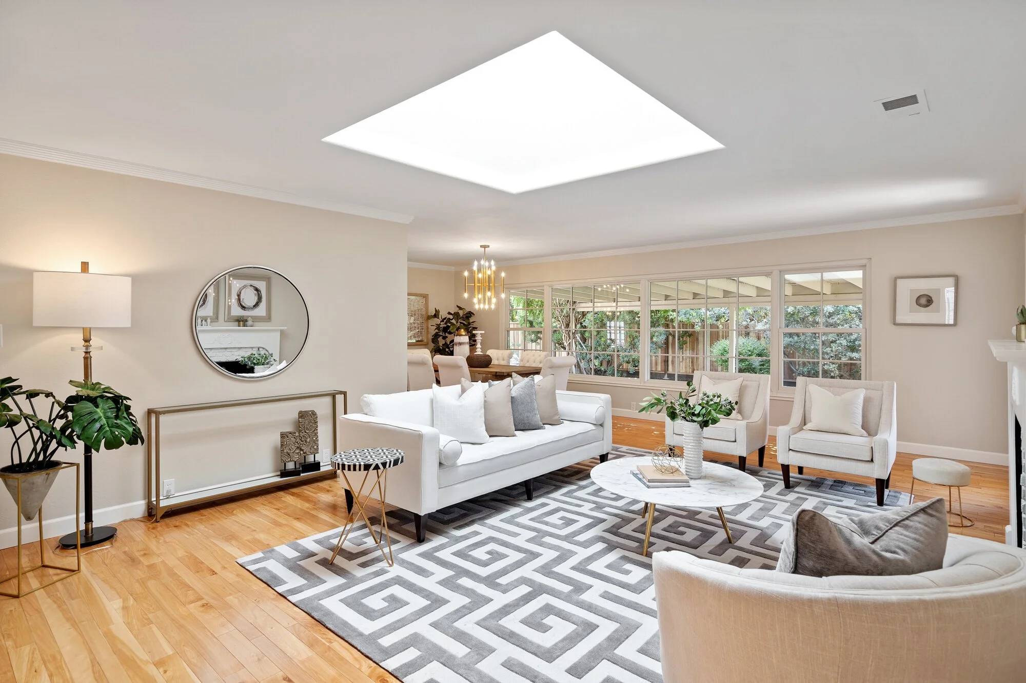 The sky-lit living room shares a fireplace and expansive windows with a dining area featuring a stunning modern chandelier