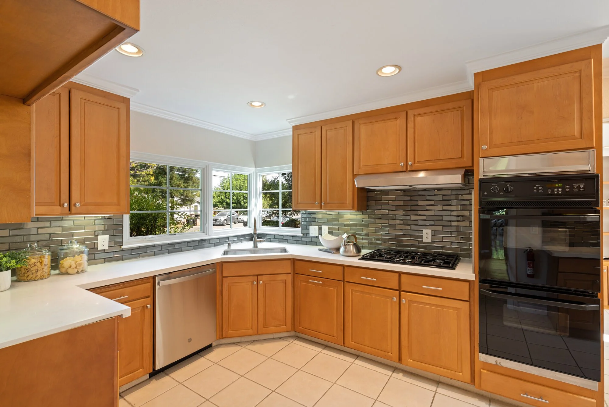 Fashionable quartz countertops and fine cabinetry surround the remodeled chef’s kitchen, which includes dual ovens, a gas cooktop by Bosch, modern full backsplash, and much more