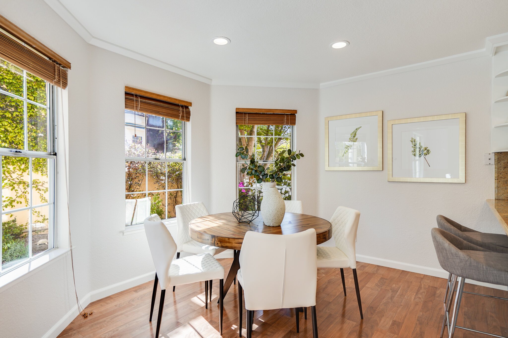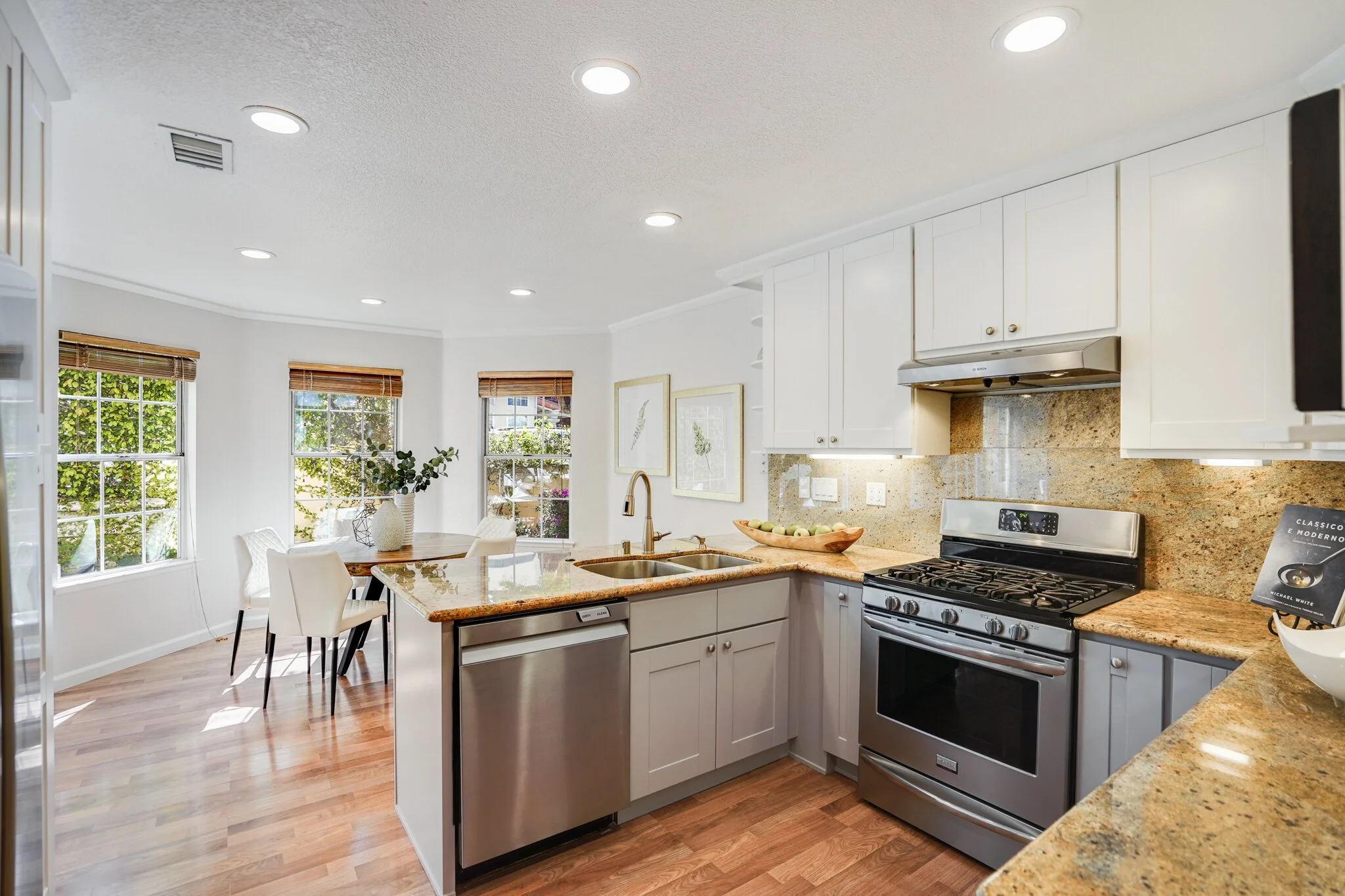 The kitchen boasts granite countertops, gas stove, pullout drawers and a charming breakfast nook.
