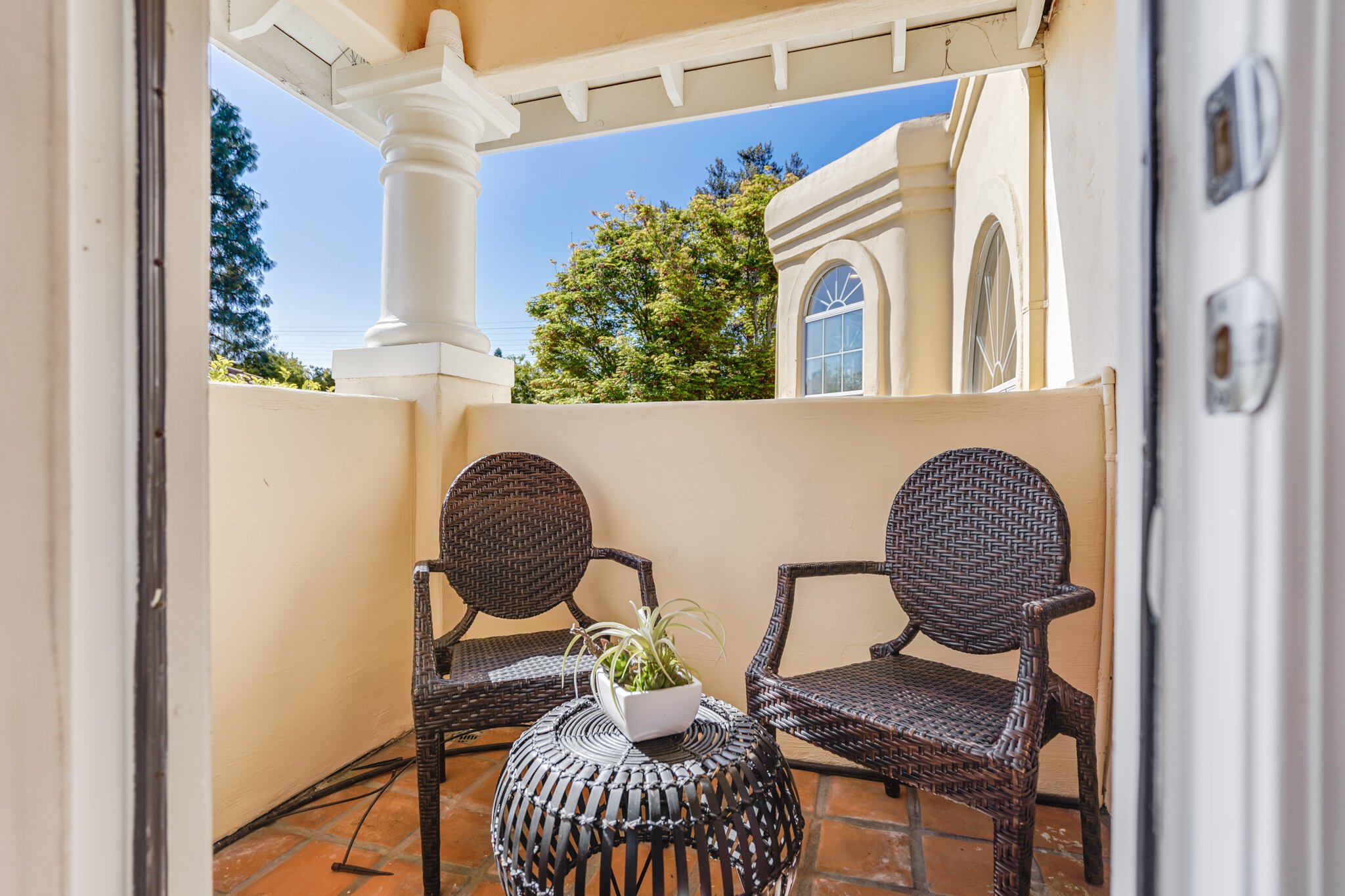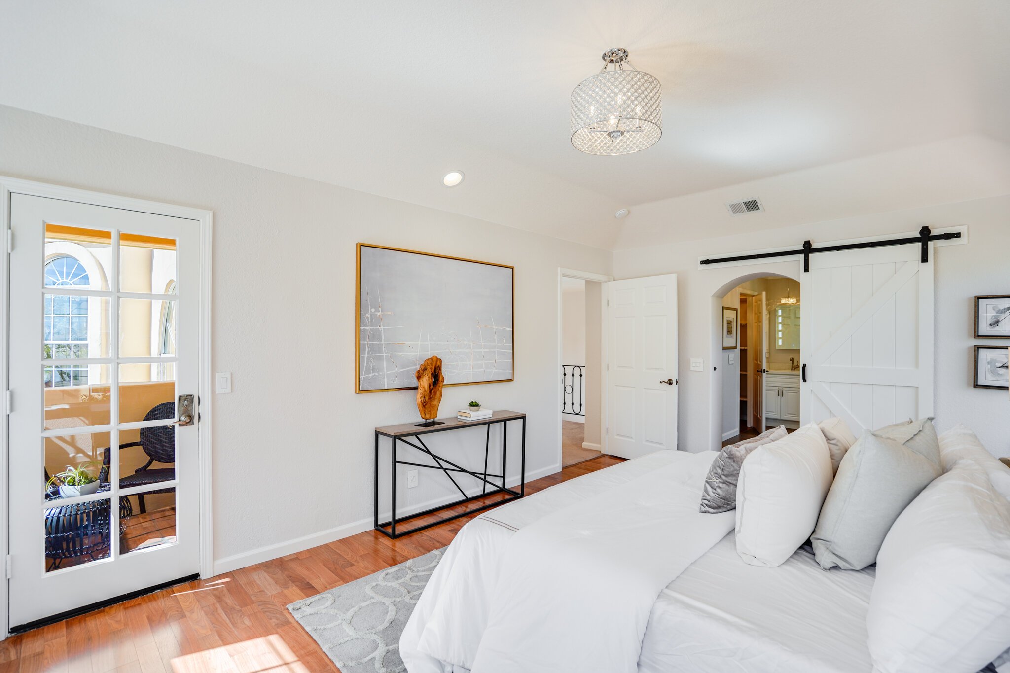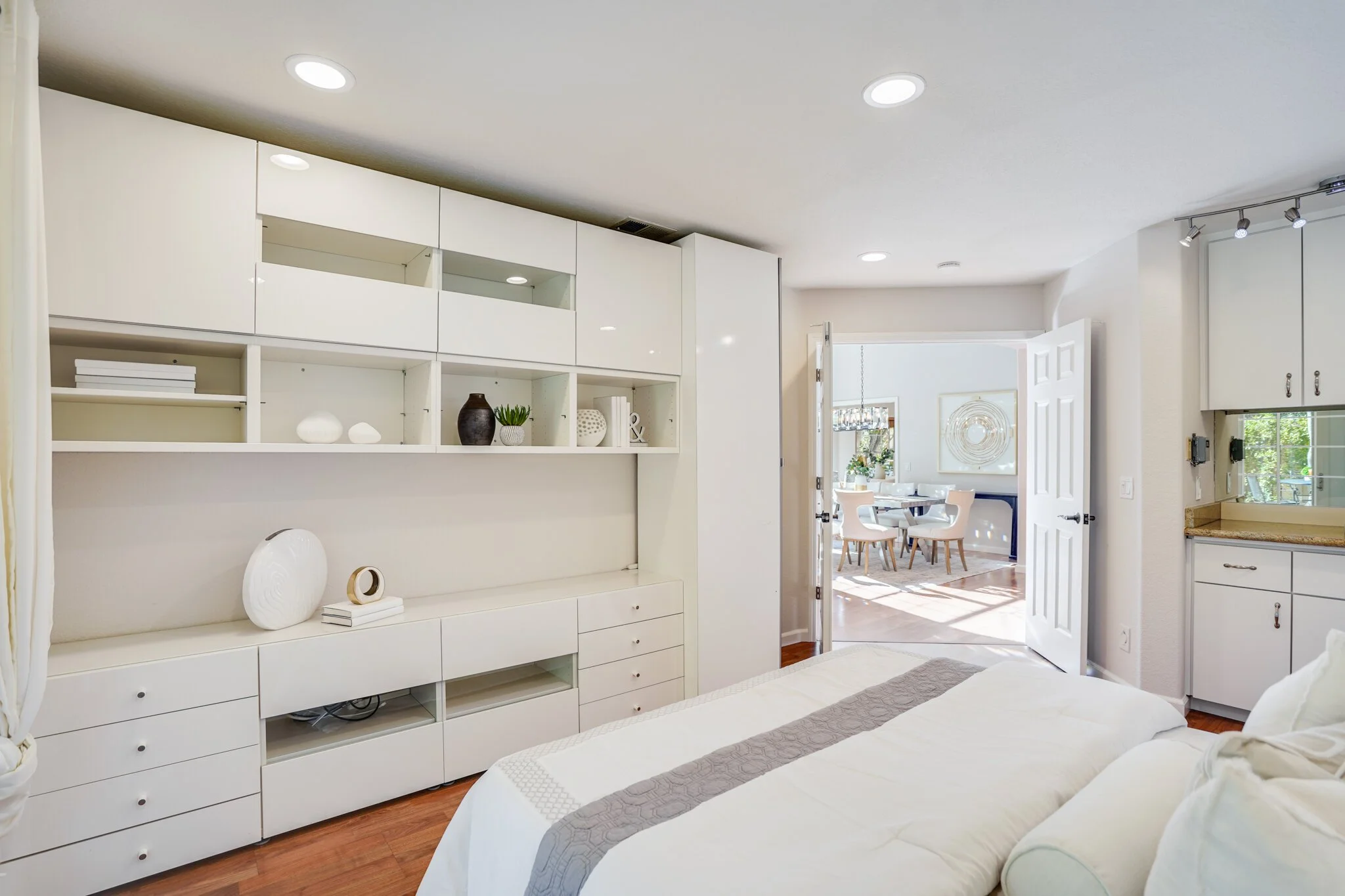 The master bedroom offers a private patio and a custom second closet.