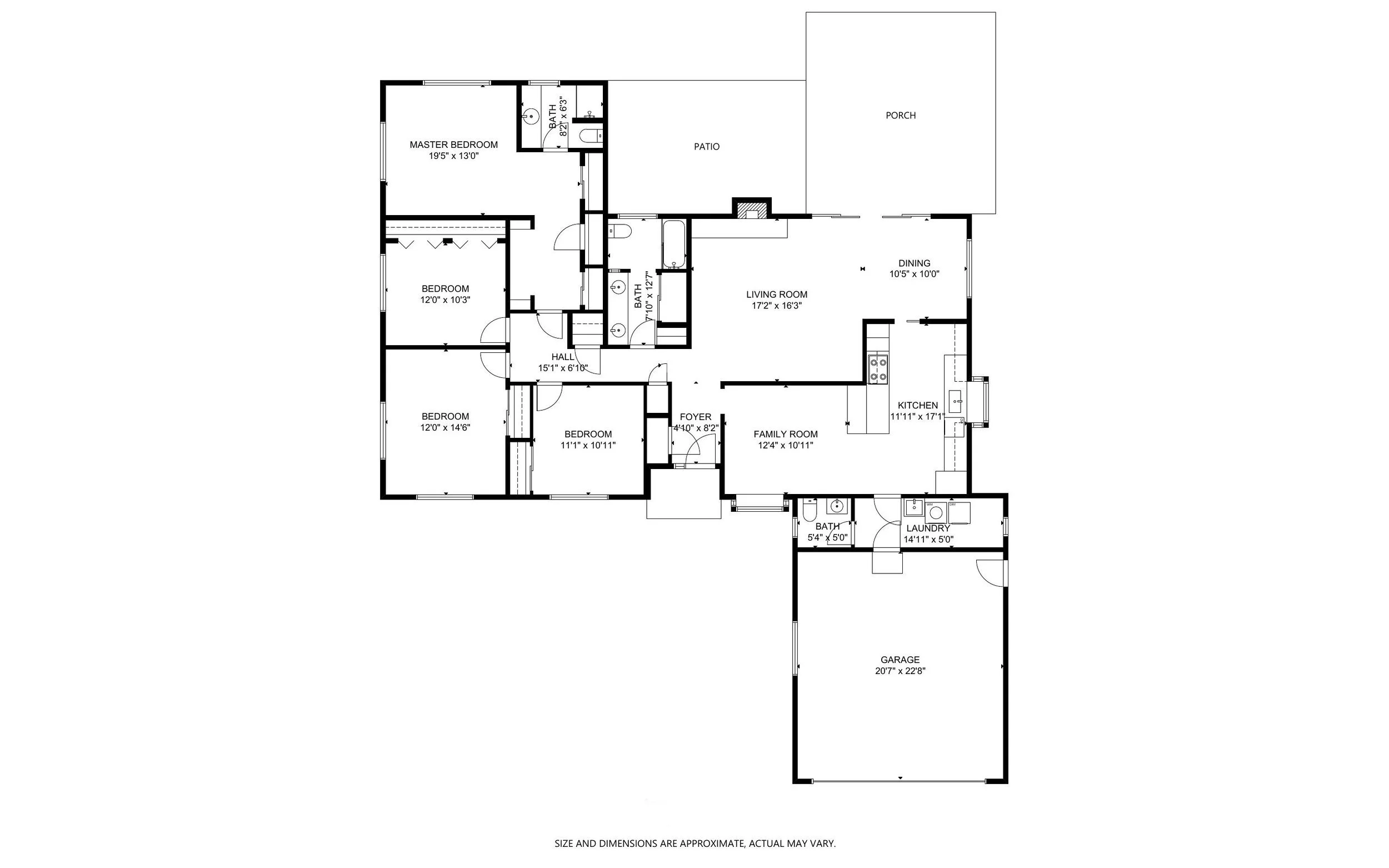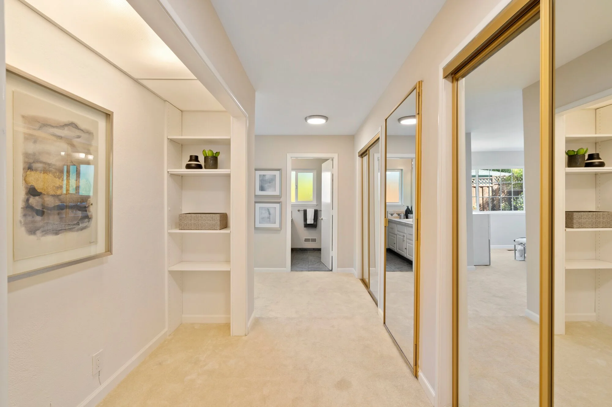A central hallway with walk-in linen closet leads to a large full bath with dual vanities and four bright, spacious bedrooms