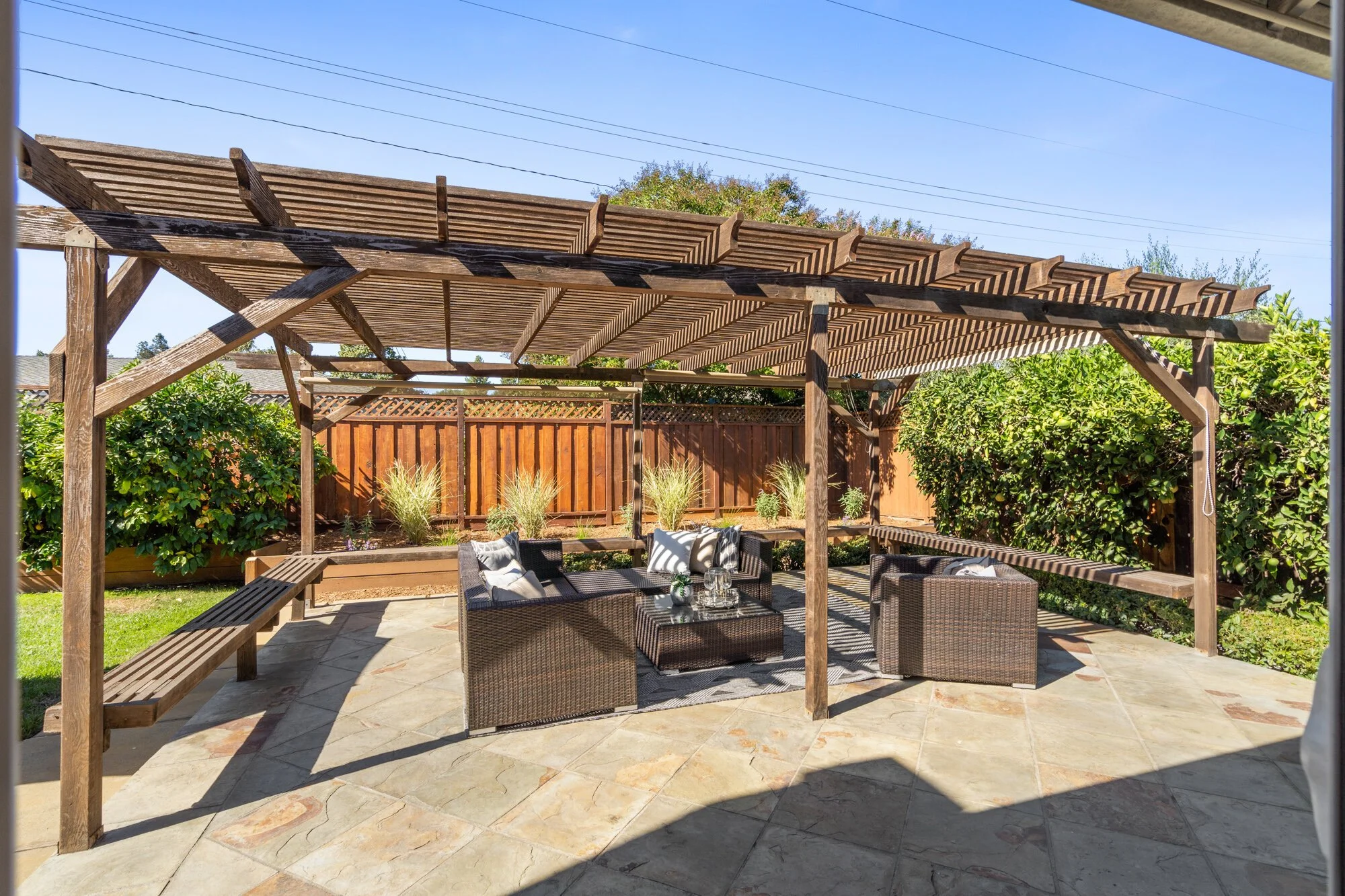 Sliding French doors connect to a backyard getaway showcasing planters, many mature fruit trees, and an extensive terrace with pergola, benches, and adjacent patio—perfect for lounging outside