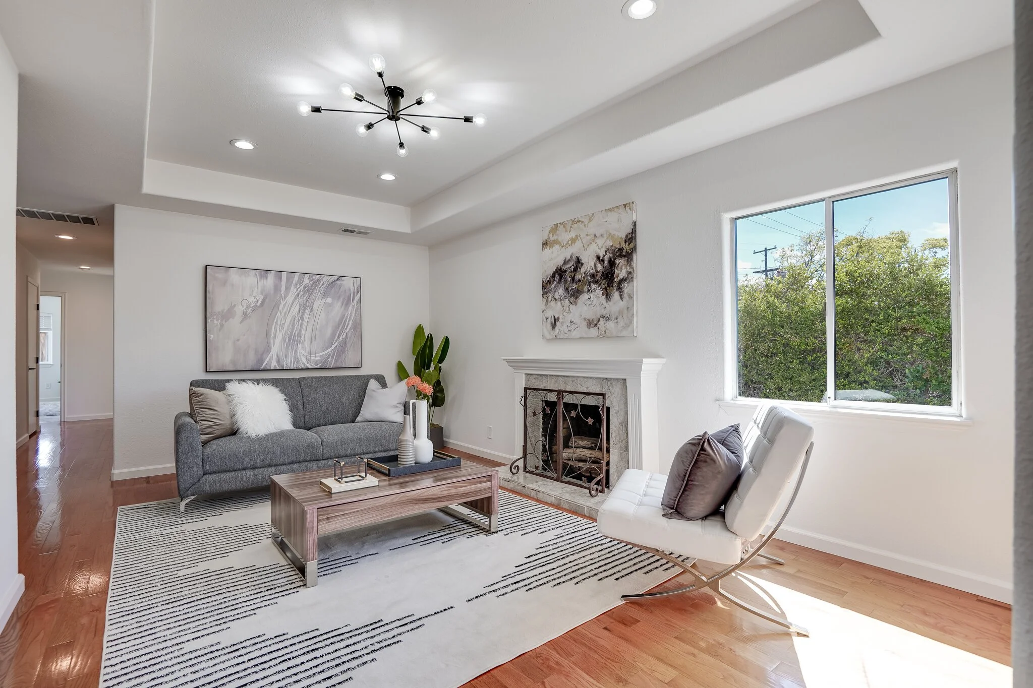Enter onto a welcoming living room with a fireplace, hardwood flooring, and ample natural light
