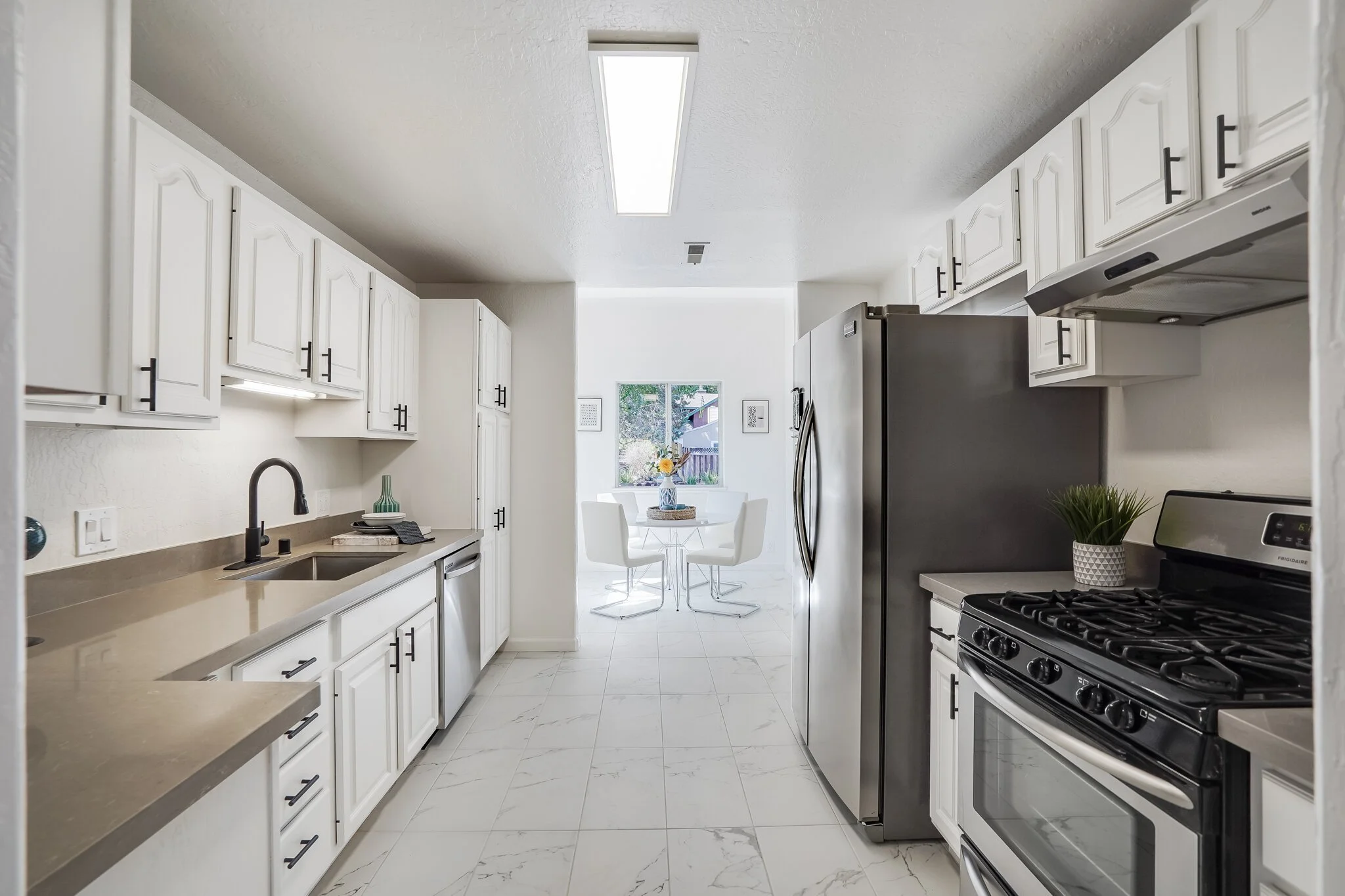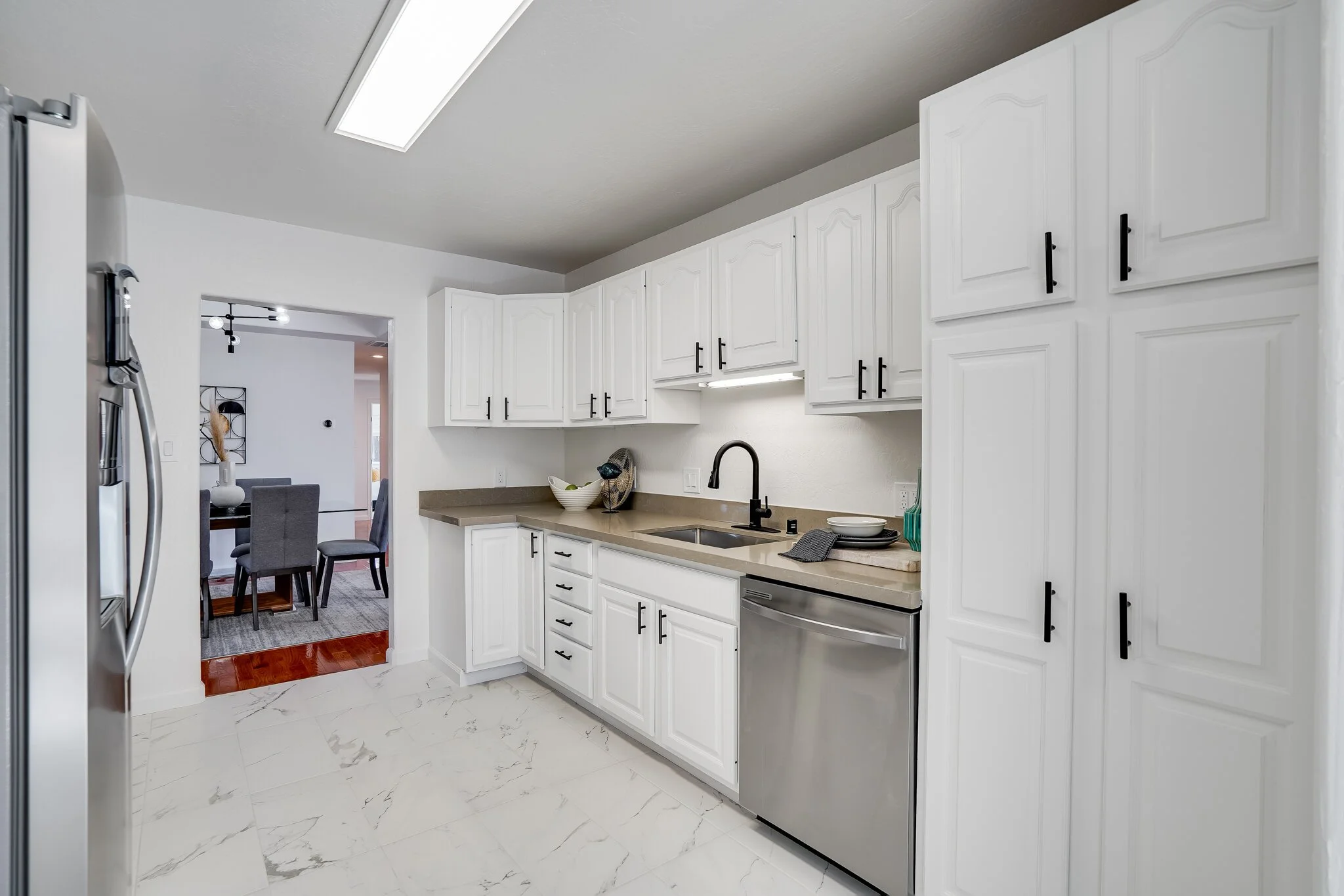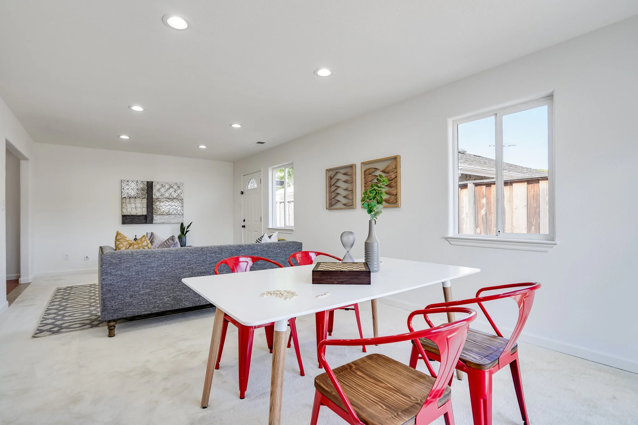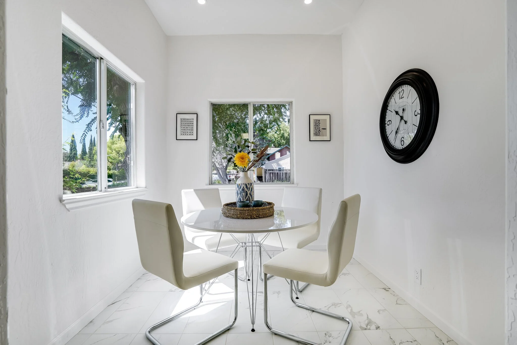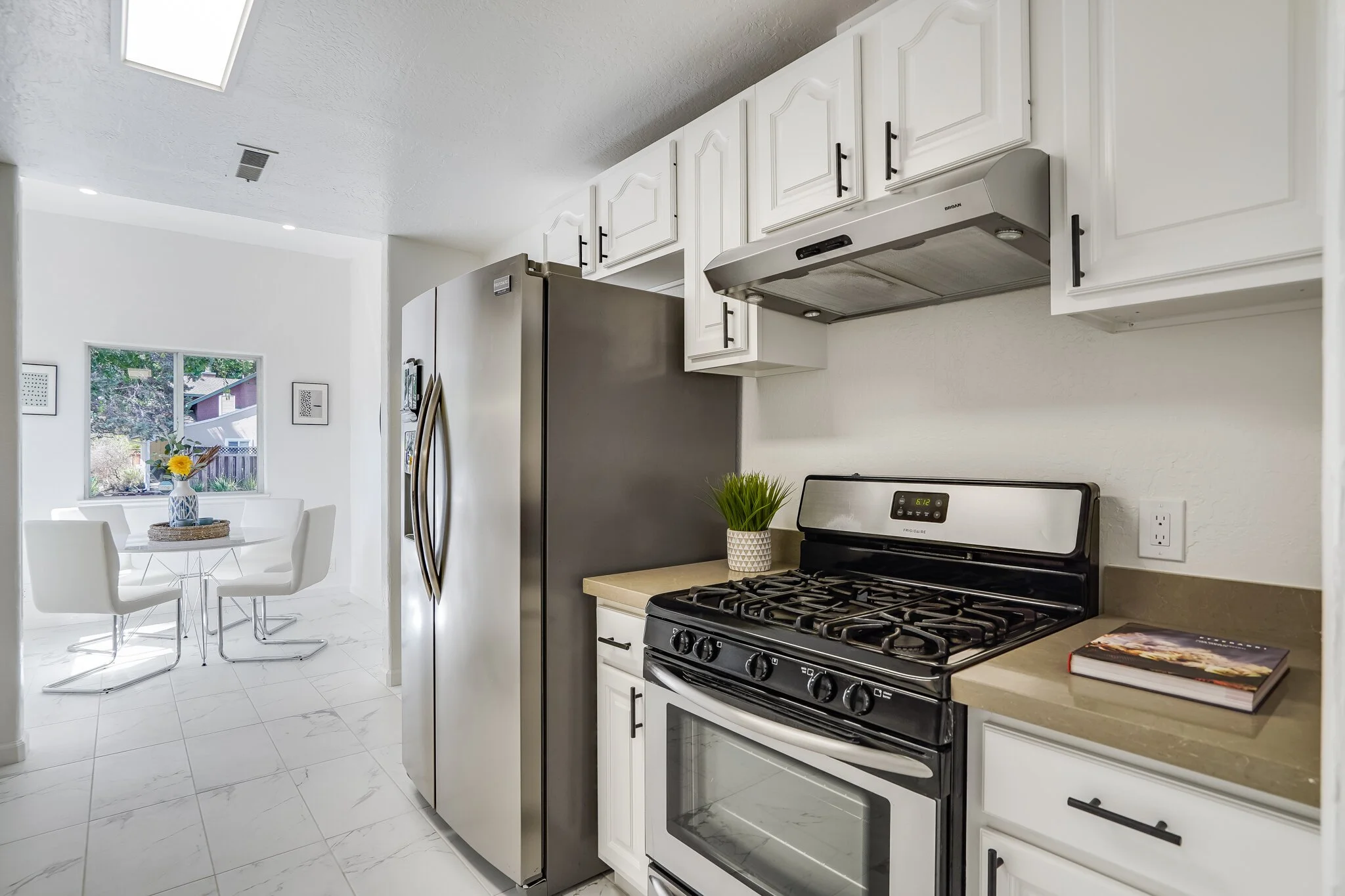 Sun-soaked family room and cozy kitchen with ample storage and a generous dining nook