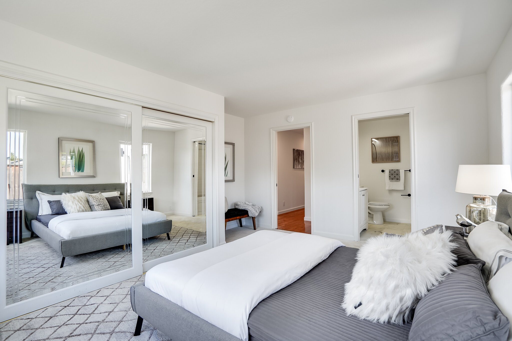 Master bedroom boasts a mirrored built-in closet and full bathroom with tub
